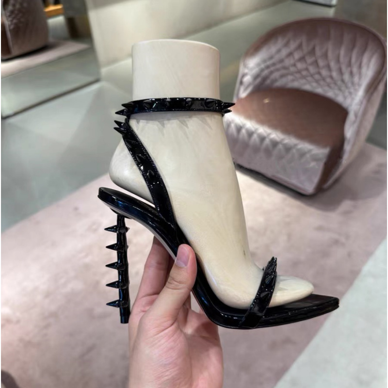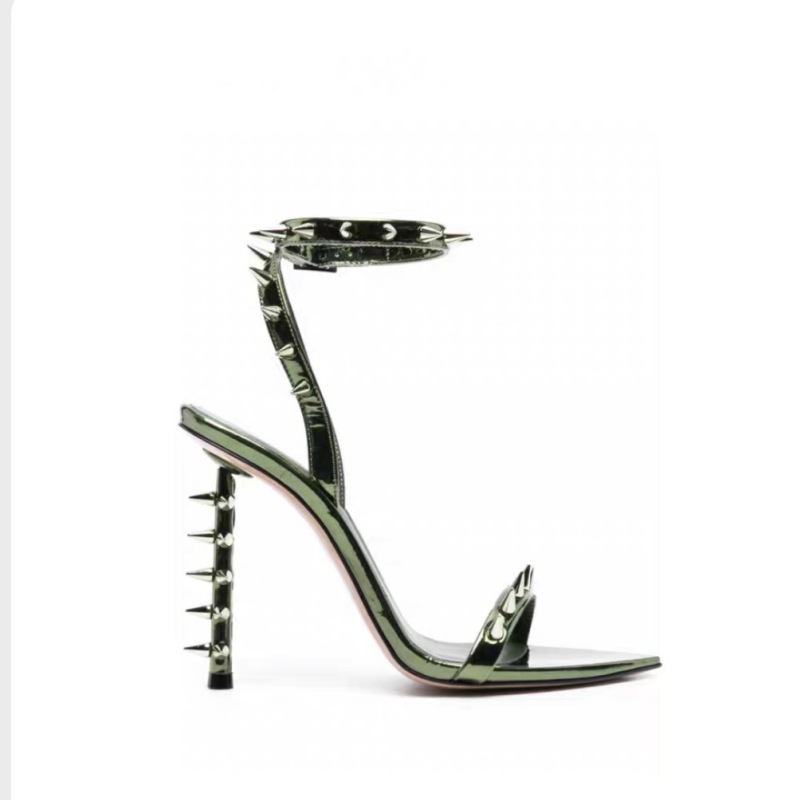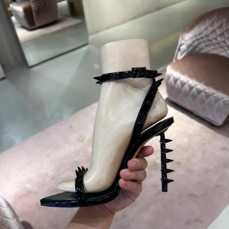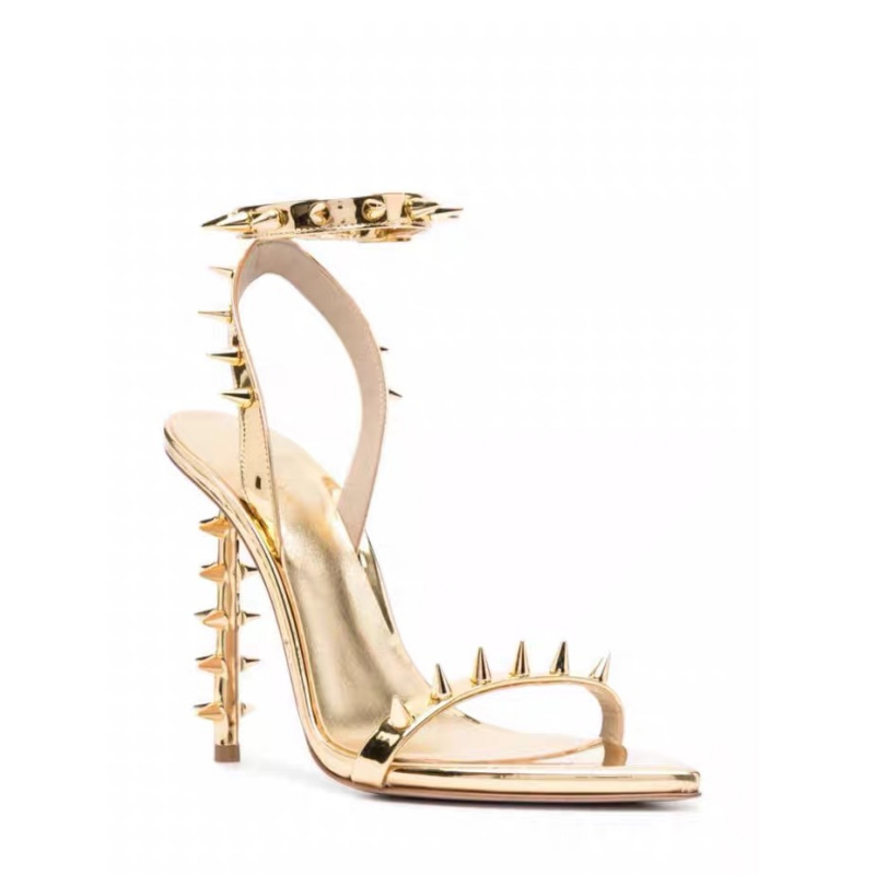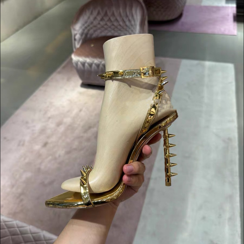 유럽과 미국의 새로운 하이힐 뾰족한 금속 리벳 버클 특수 힐 크로스 보더 플러스 사이즈 골드 오픈 토 샌들 여성용