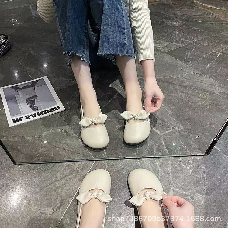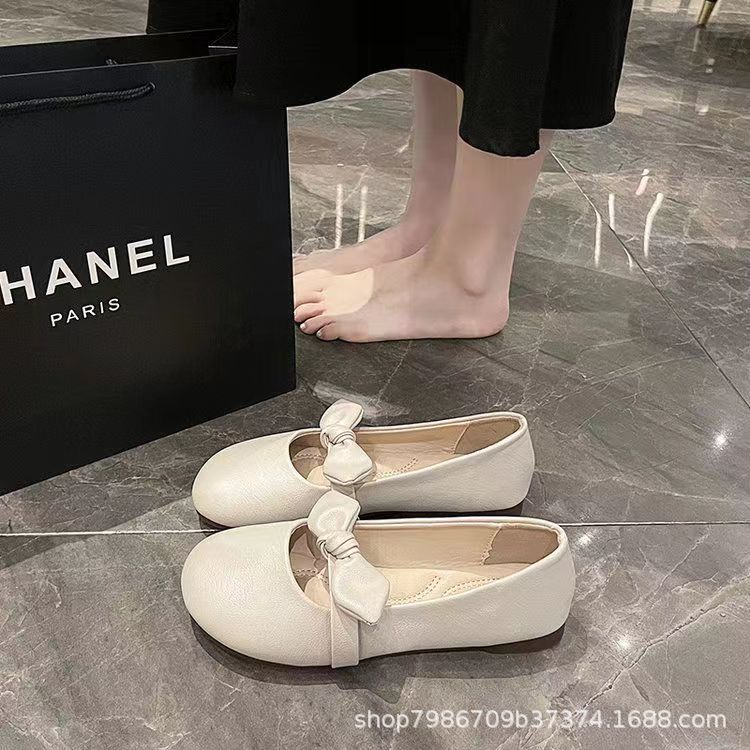 메리 제인 신발 여성 2024 년 여름 새로운 부드러운 활 플랫 얕은 입 신발 프렌치 빈티지 가죽 신발스토어 가기
