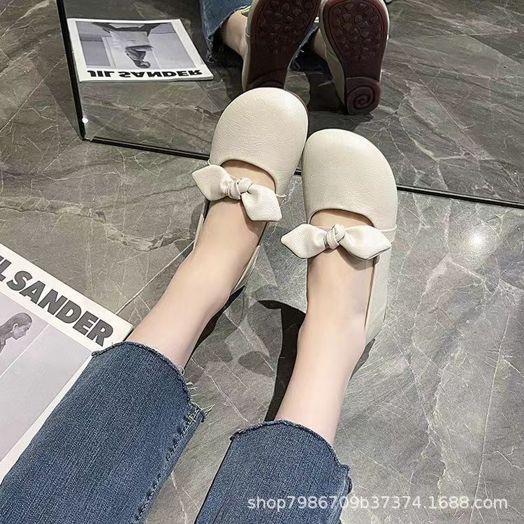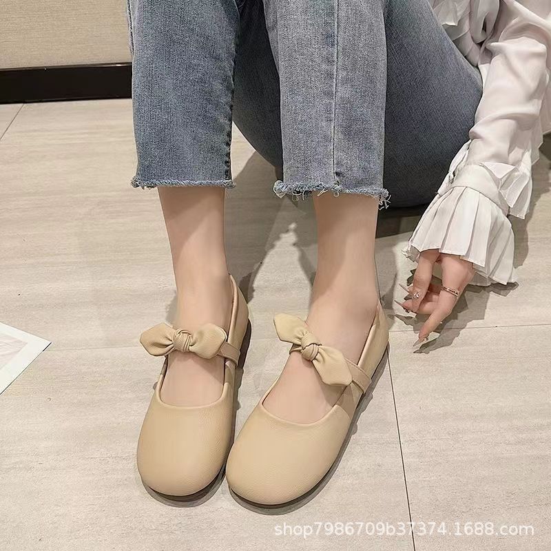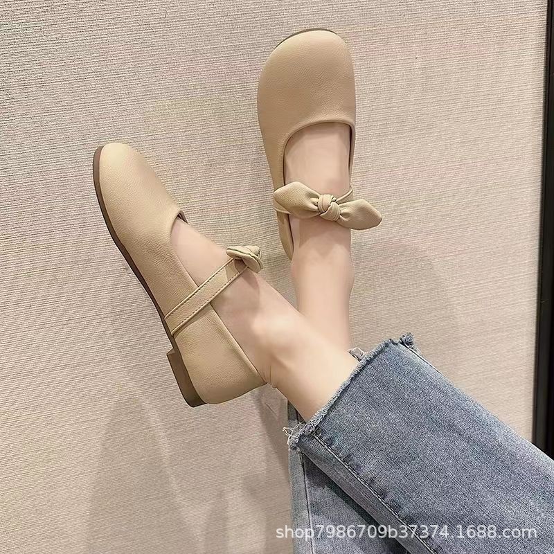 메리 제인 신발 여성 2024 년 여름 새로운 부드러운 활 플랫 얕은 입 신발 프렌치 빈티지 가죽 신발