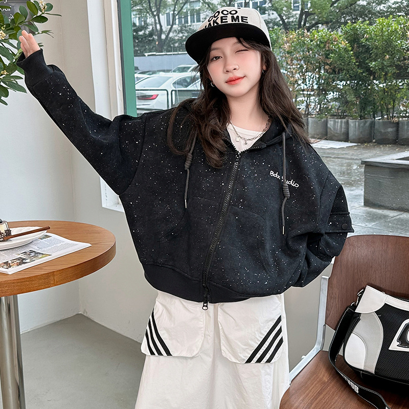 소녀 코트 봄과 가을 2024 새로운 여성의 큰 어린이 캐주얼 스팽글 봄 유행 서양식 어린이 후드 탑
