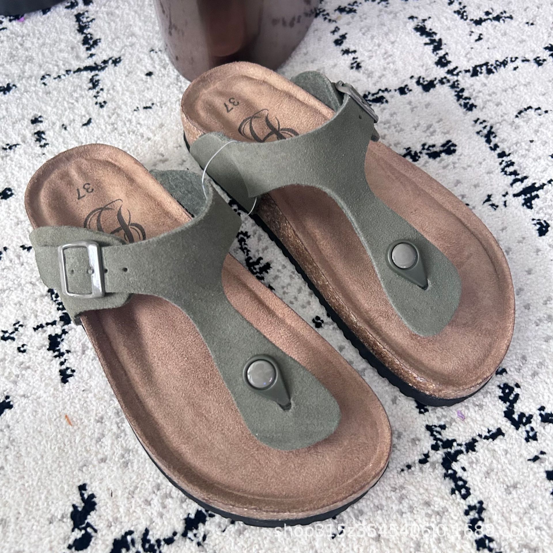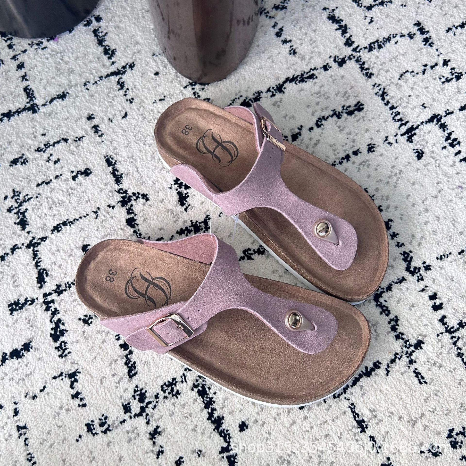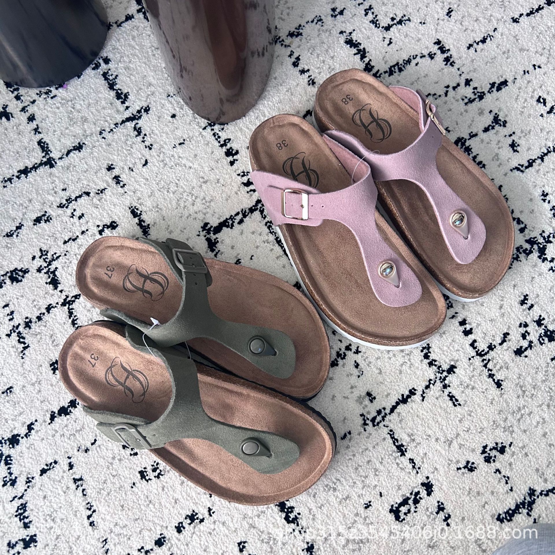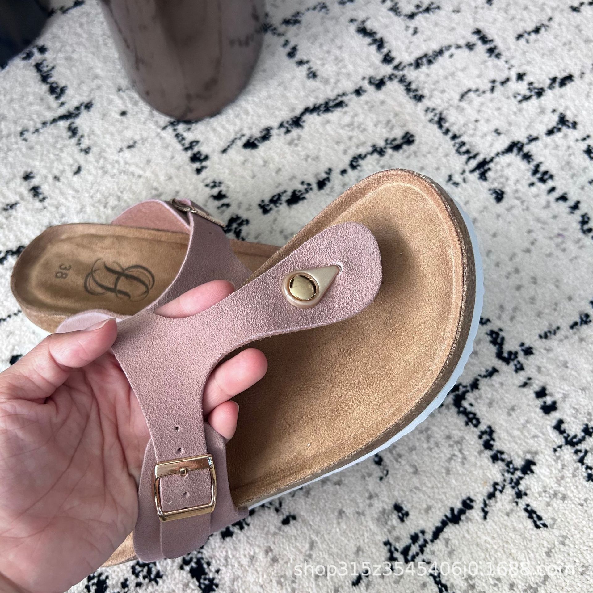 여성용 새 샌들 소 가죽 코르크 여름 플립 플롭 나무 슬리퍼 비치 슈즈 플립 플롭 비치 미끄럼 방지