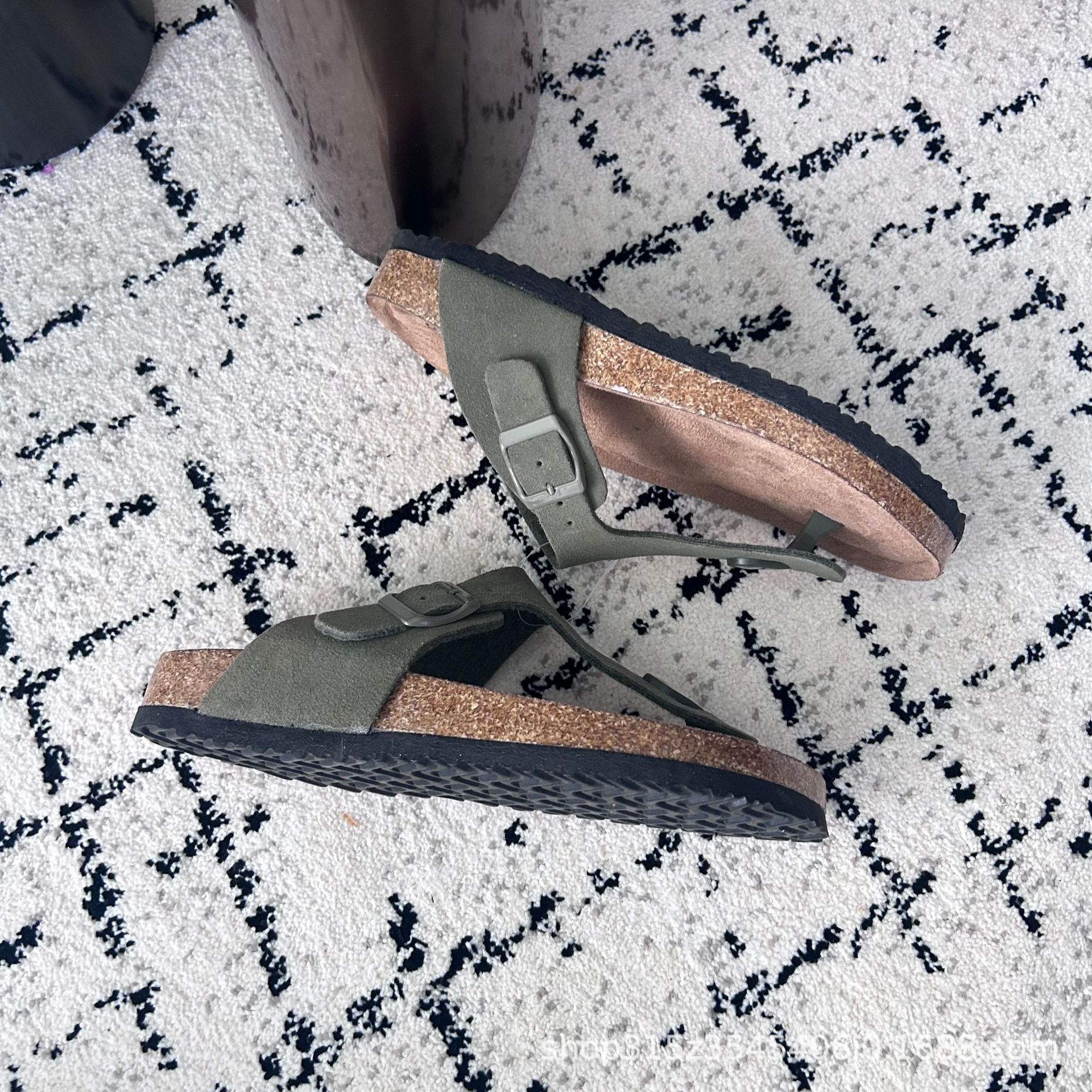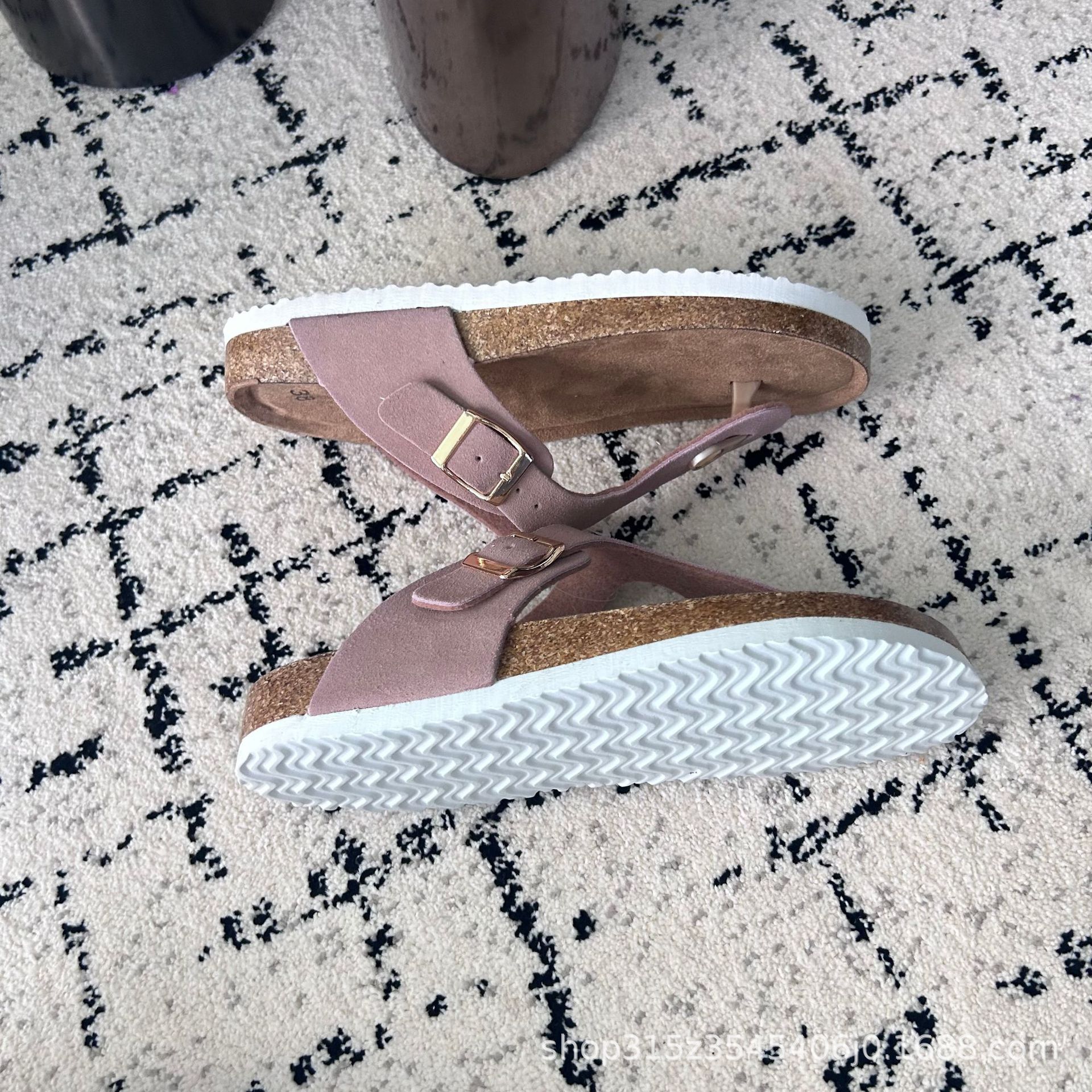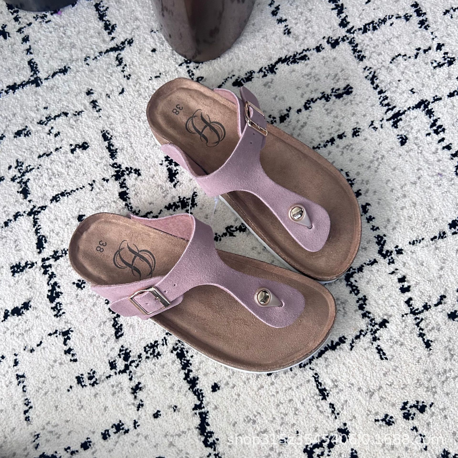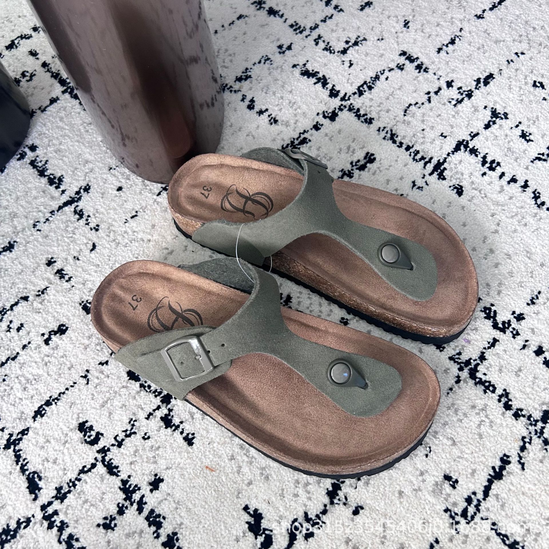 여성용 새 샌들 소 가죽 코르크 여름 플립 플롭 나무 슬리퍼 비치 슈즈 플립 플롭 비치 미끄럼 방지