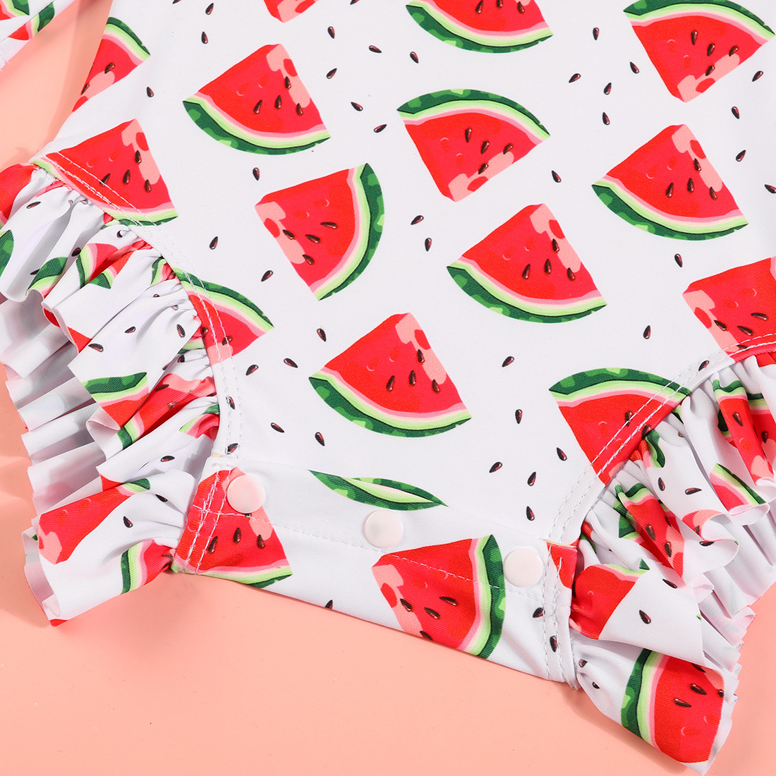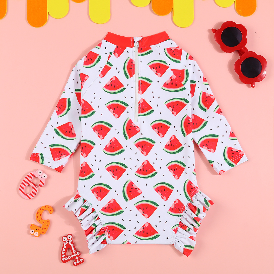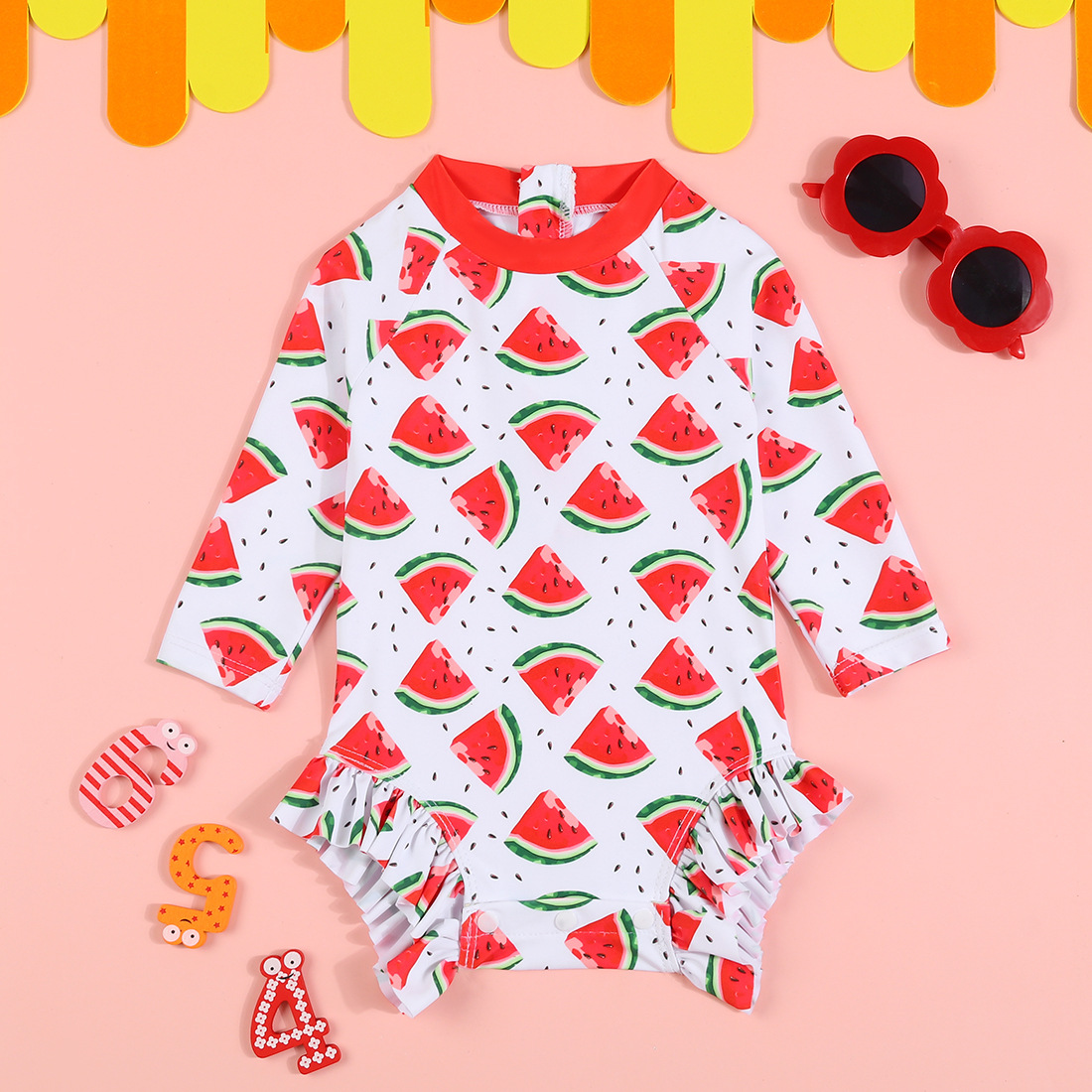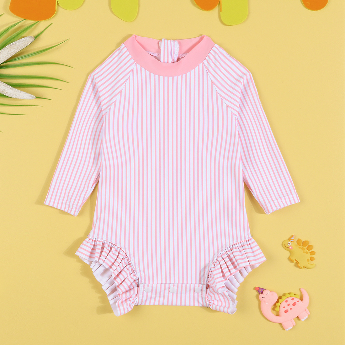 어린이 수영복 새로운 소녀 원피스 국경 공급 긴 소매 태양 보호 주름진 줄무늬 둥근 목 아기 수영복