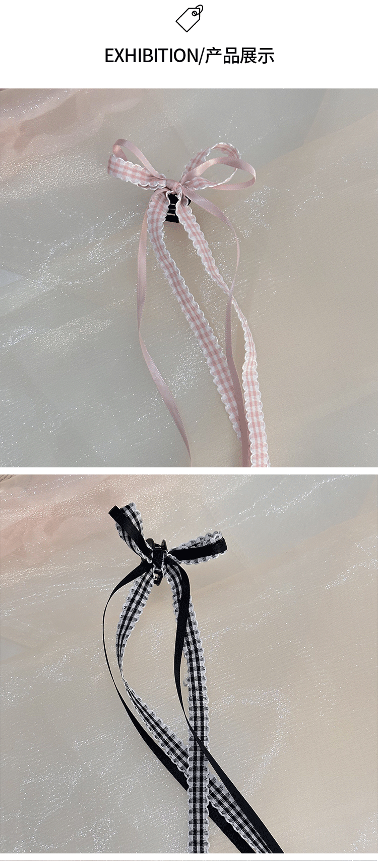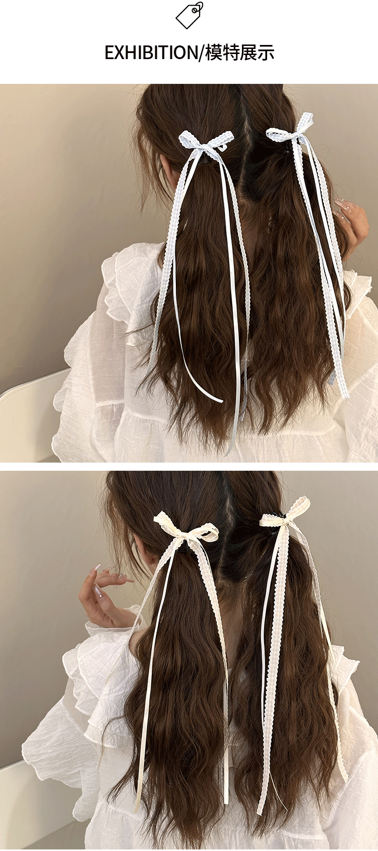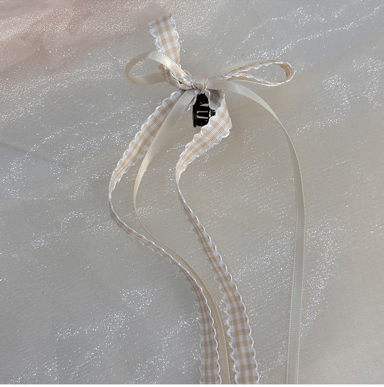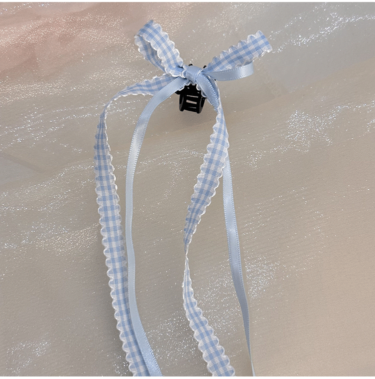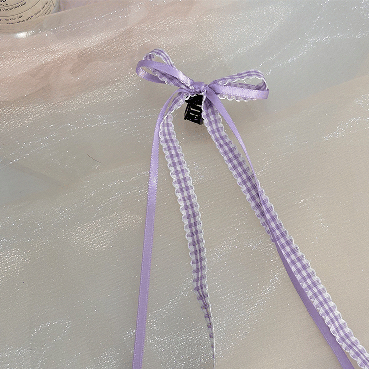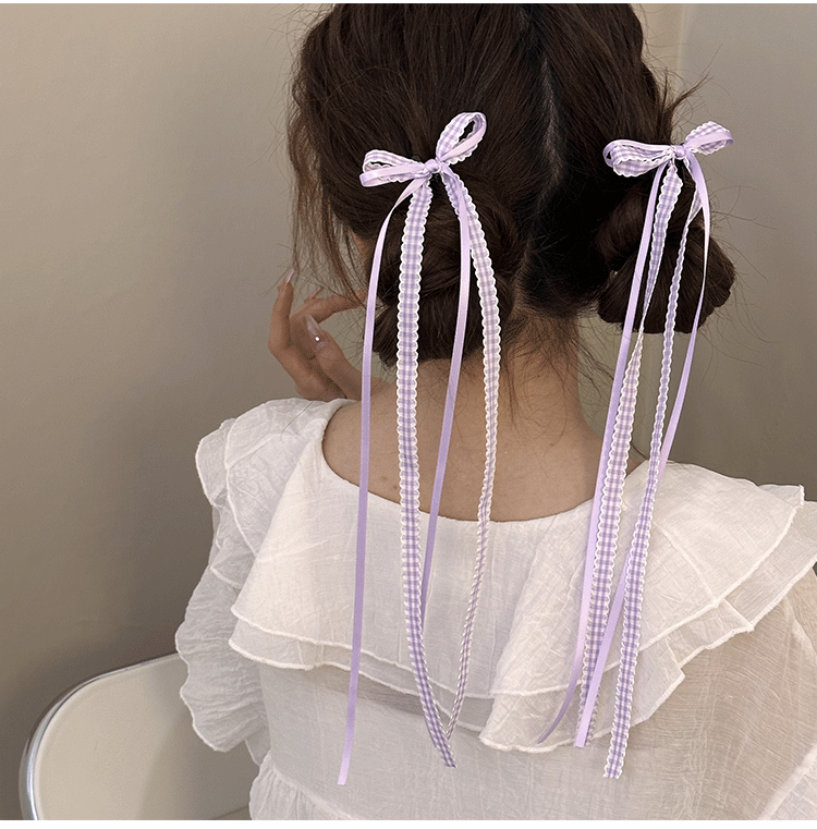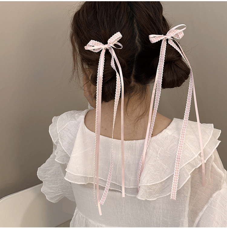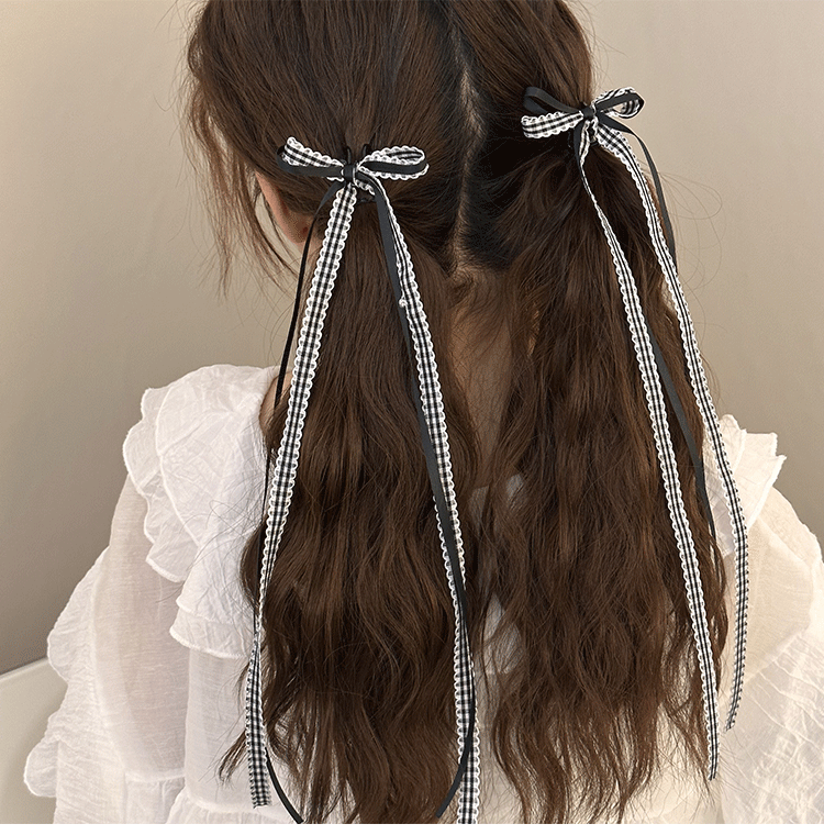 모리 소녀 격자 무늬 긴 리본 활 클립 발레 스타일 꼰 헤어 사이드 클립 더블 포니 테일 헤어핀 헤어 액세서리 머리 장식
