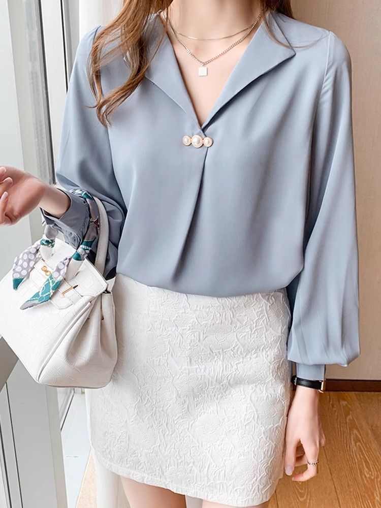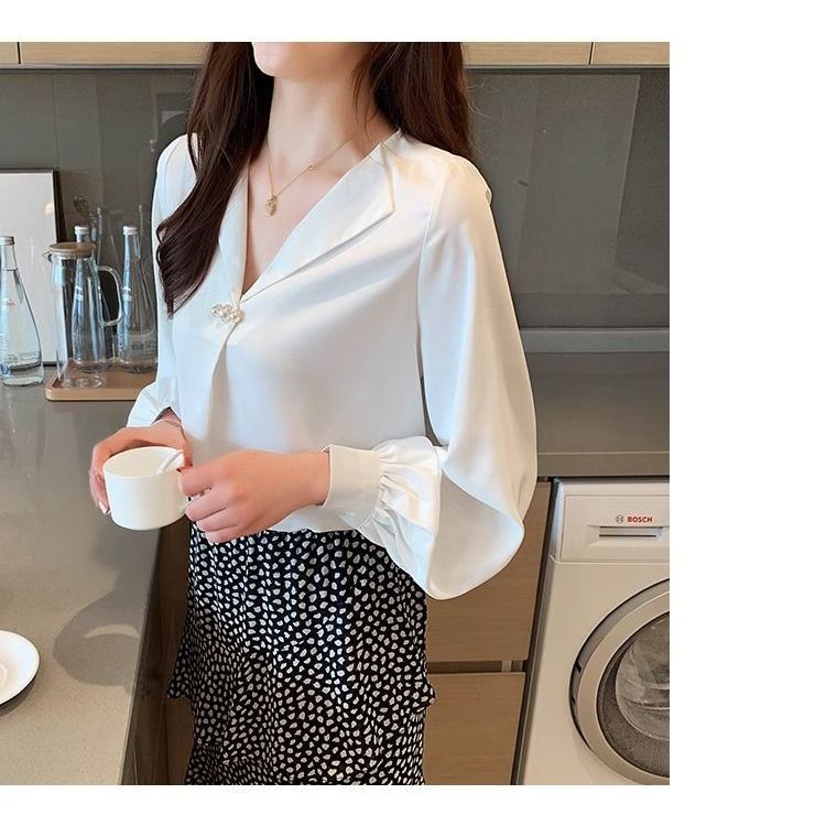 2024 새로운 쉬폰 셔츠 디자인 우아한 V 넥 셔츠 여성 캐주얼 올 매치 틈새 긴 소매 서양식 느슨한 탑스토어 가기