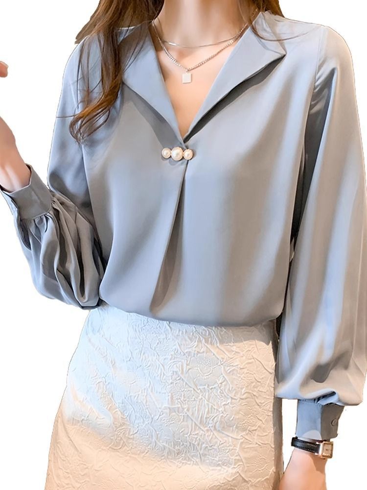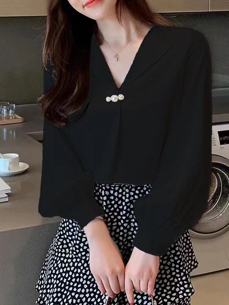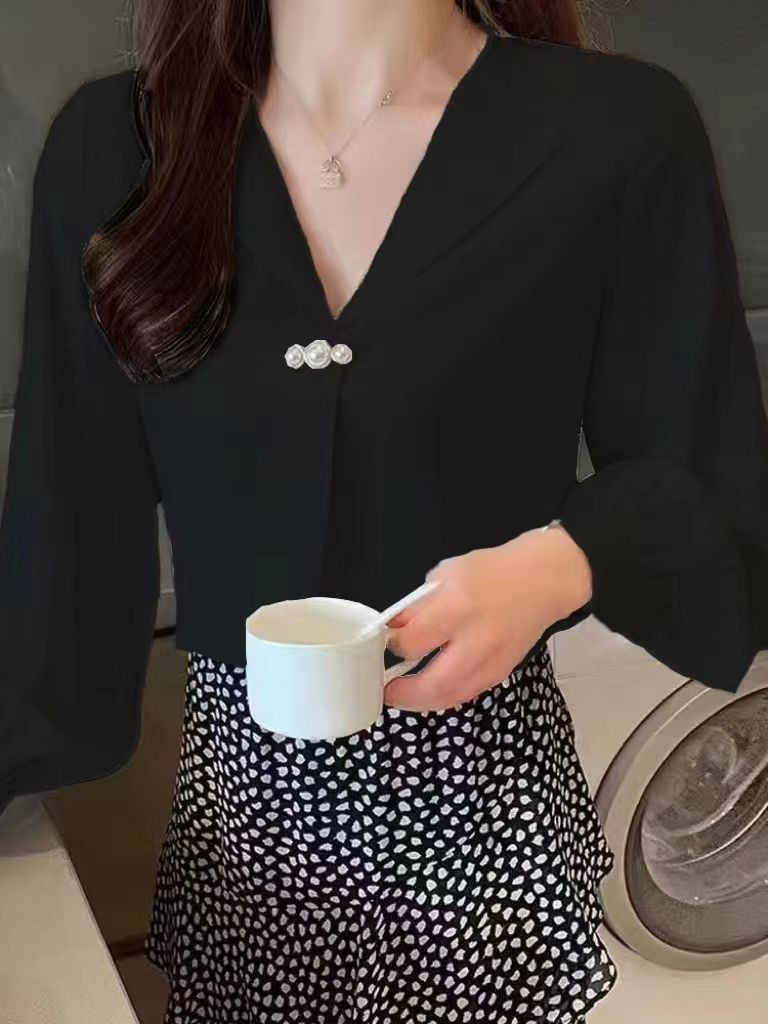 2024 새로운 쉬폰 셔츠 디자인 우아한 V 넥 셔츠 여성 캐주얼 올 매치 틈새 긴 소매 서양식 느슨한 탑