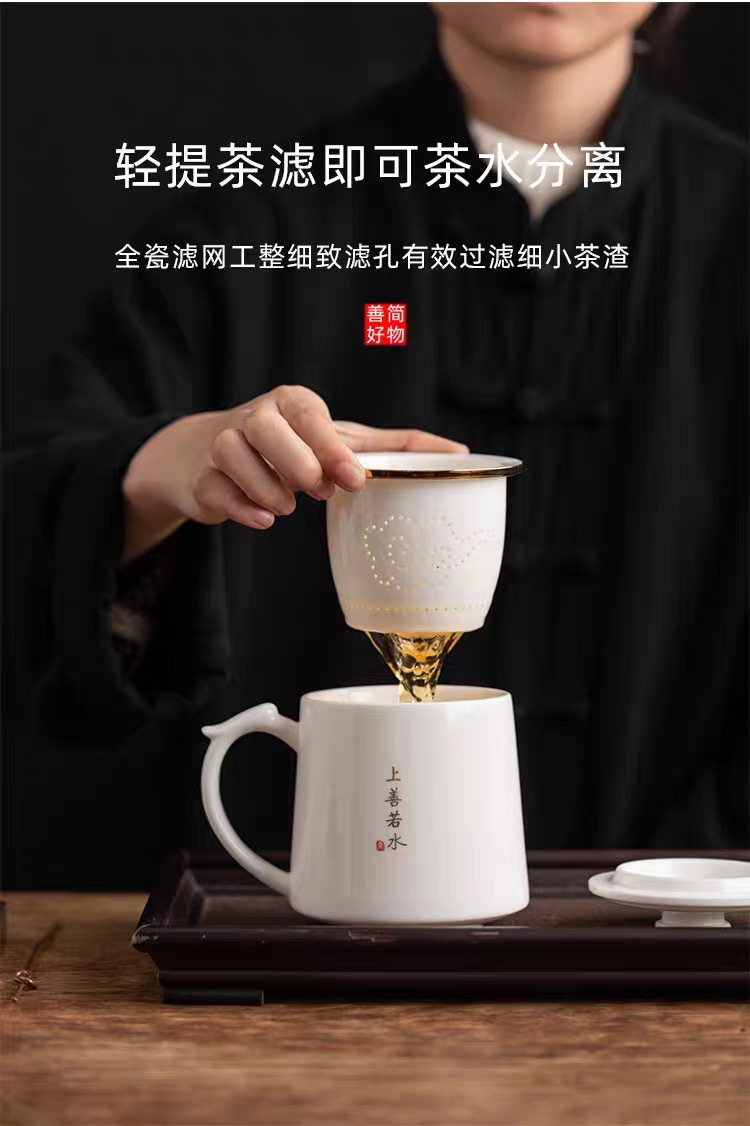 양 지방 옥 차 컵 뚜껑 필터가있는 세라믹 머그잔 차 분리 컵 흰색 도자기 물 컵 사무실 컵 인쇄 로고스토어 가기