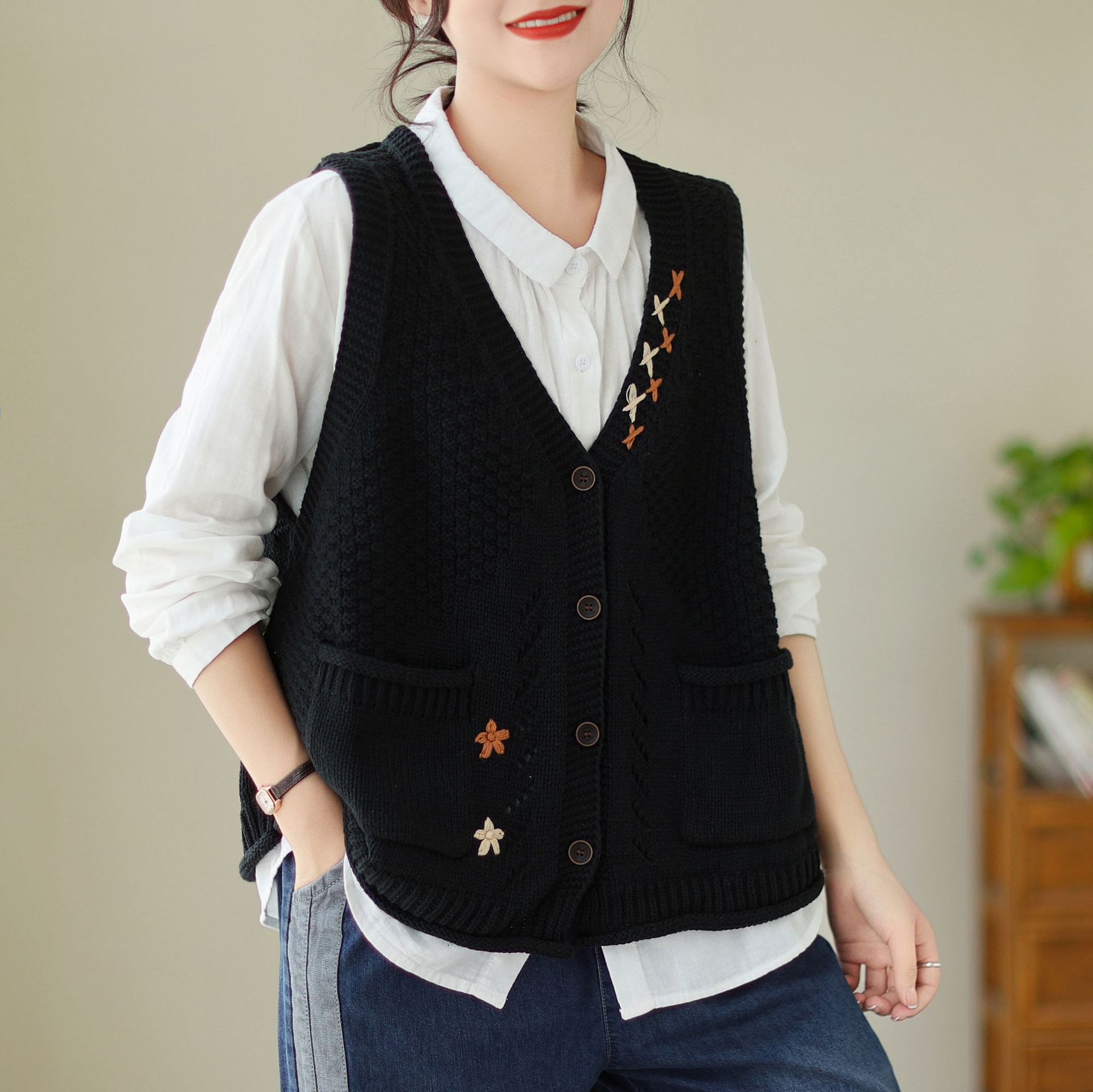 레이어드 니트 조끼 여성용 신상 2025 봄 가을 레트로 스웨터 아우터 가을 겨울 문예풍 루즈핏 조끼스토어 가기