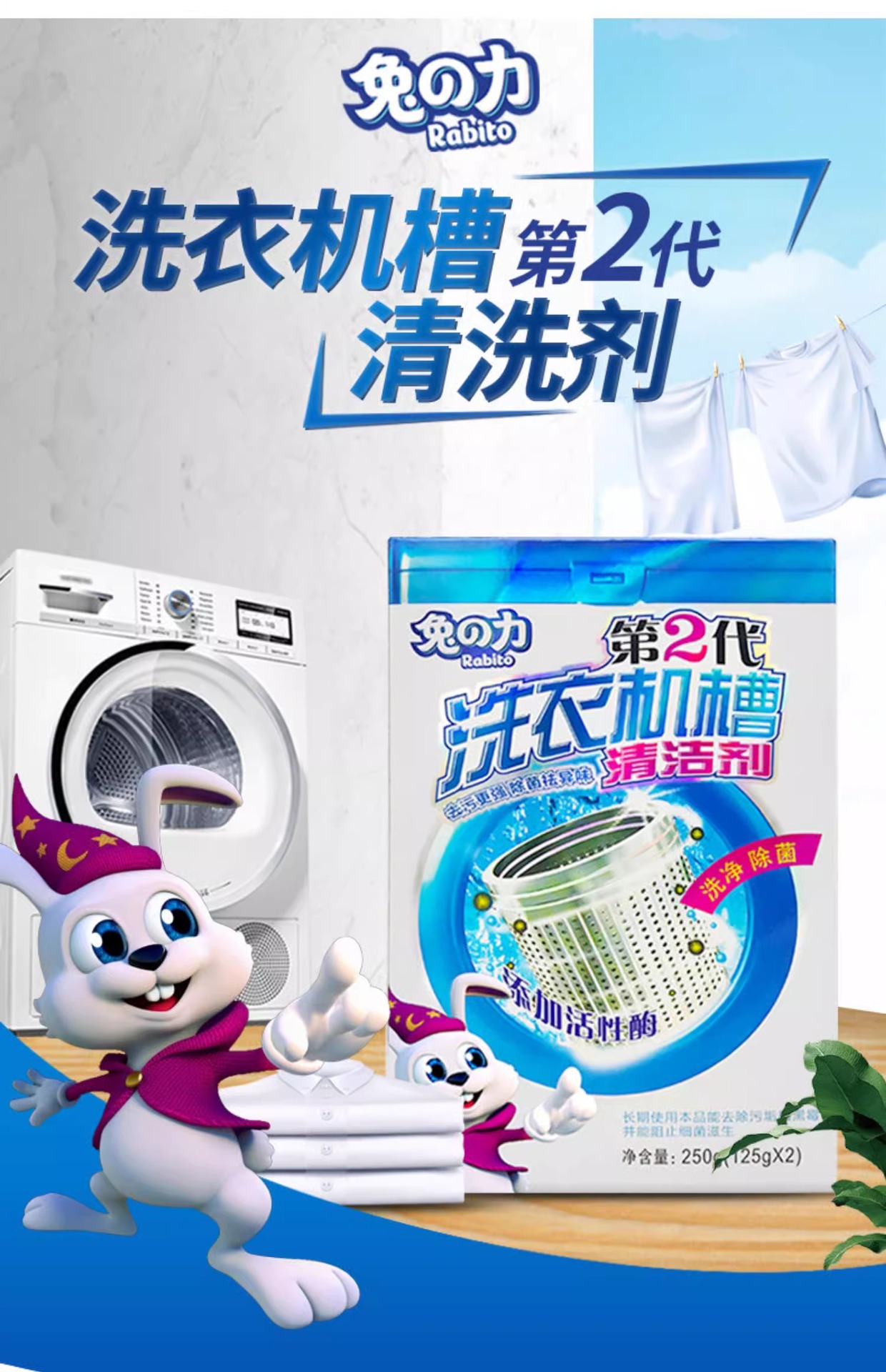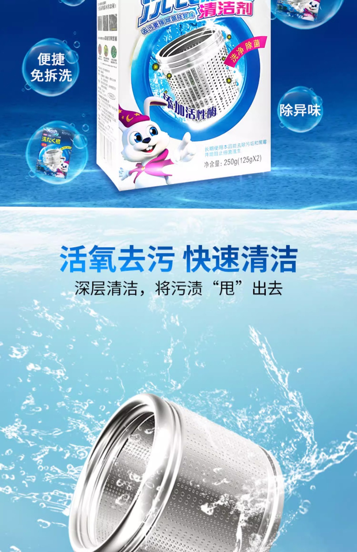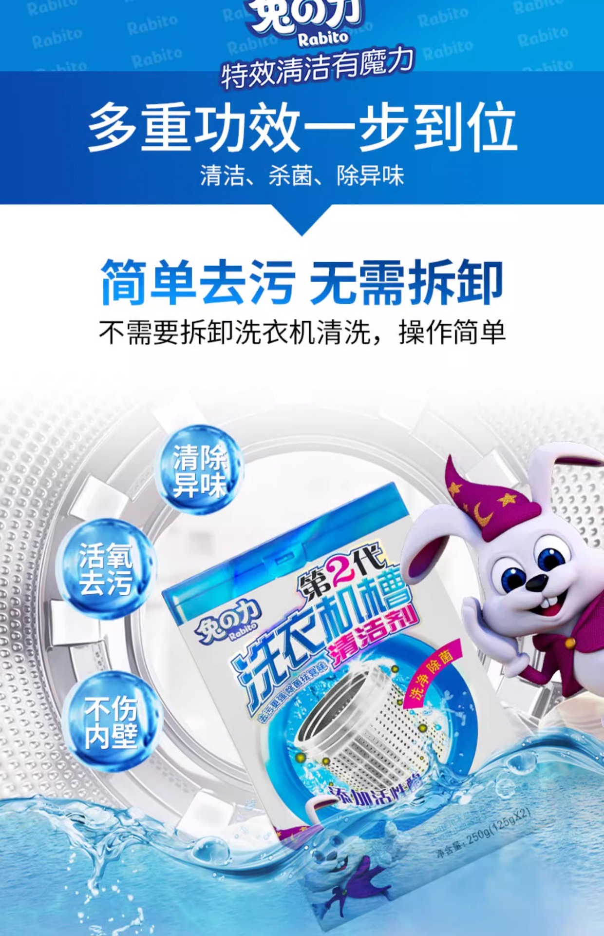 토끼의 세탁기 클리너, 살균, 냄새 제거, 스케일 제거, 세탁기 탱크, 분해 및 세척 특수 세척 용액 250g