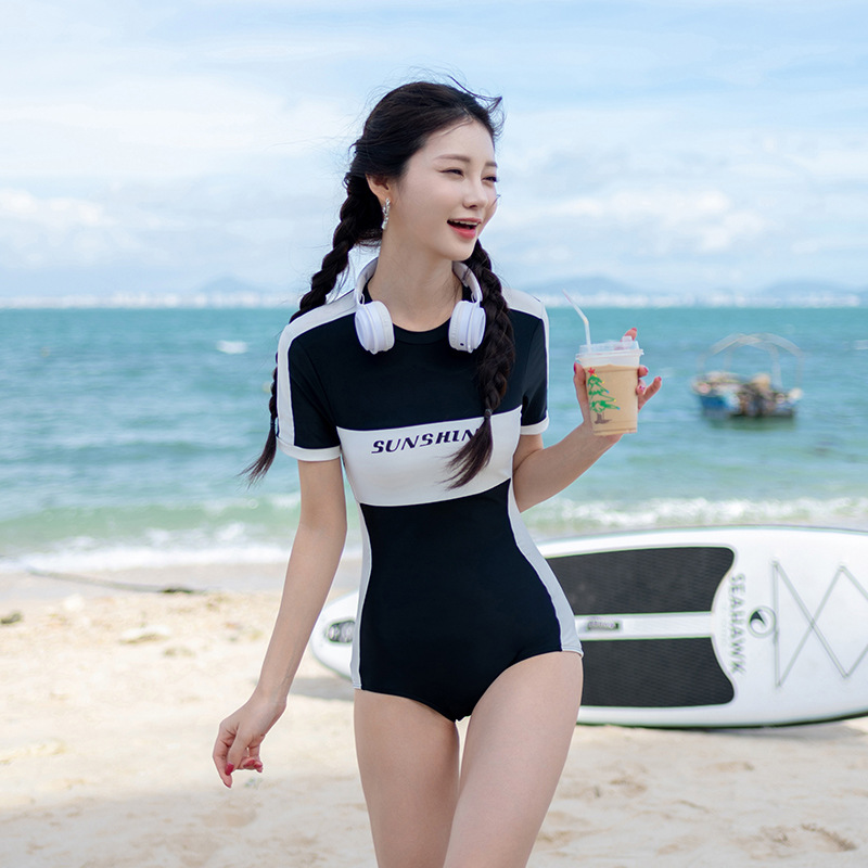 슬림핏 슬리밍 반팔 타이트 터틀넥 지퍼 원피스 수영복 여성 인 스타일 흑백 대비 컬러 스포츠 수영복