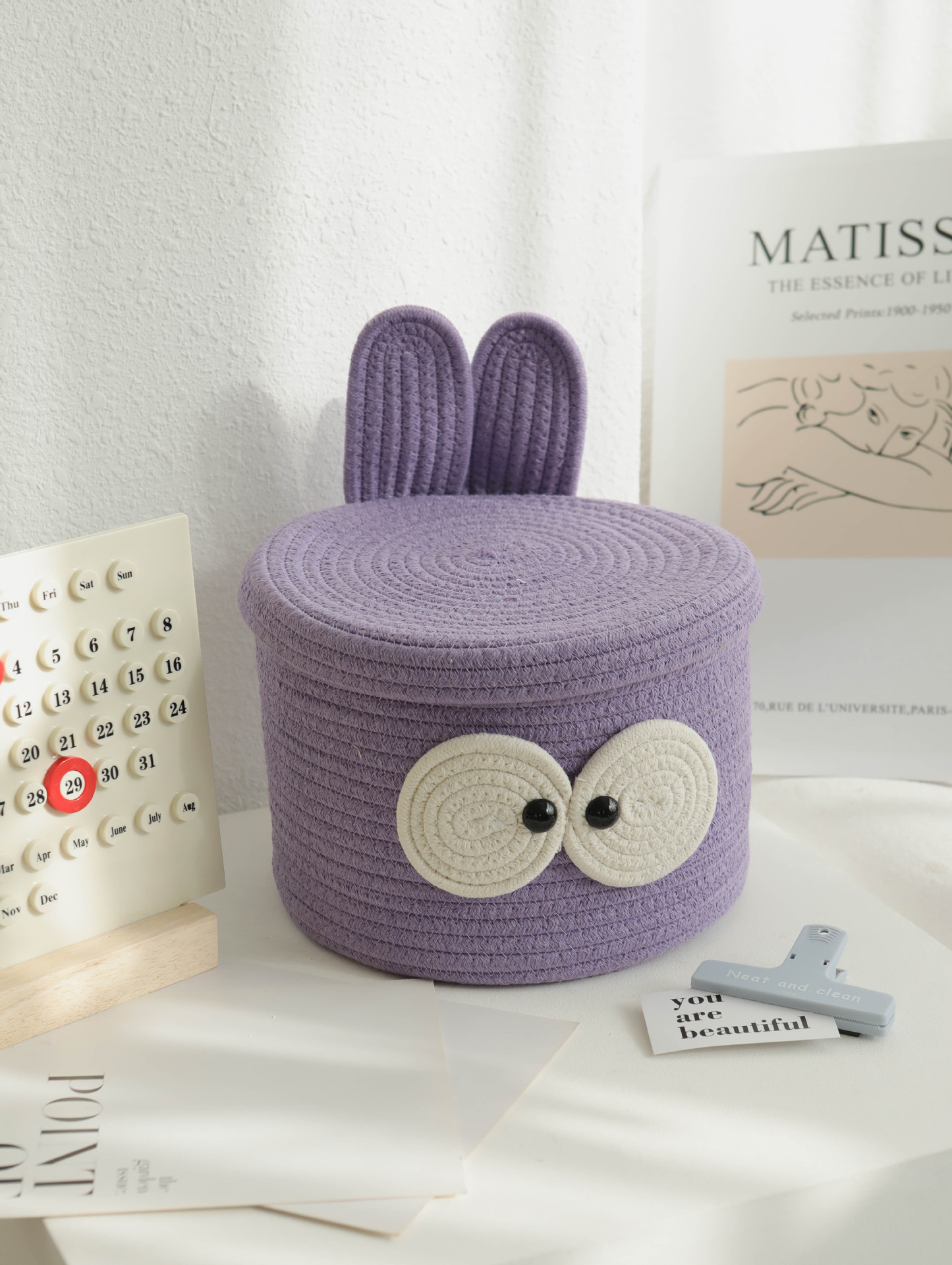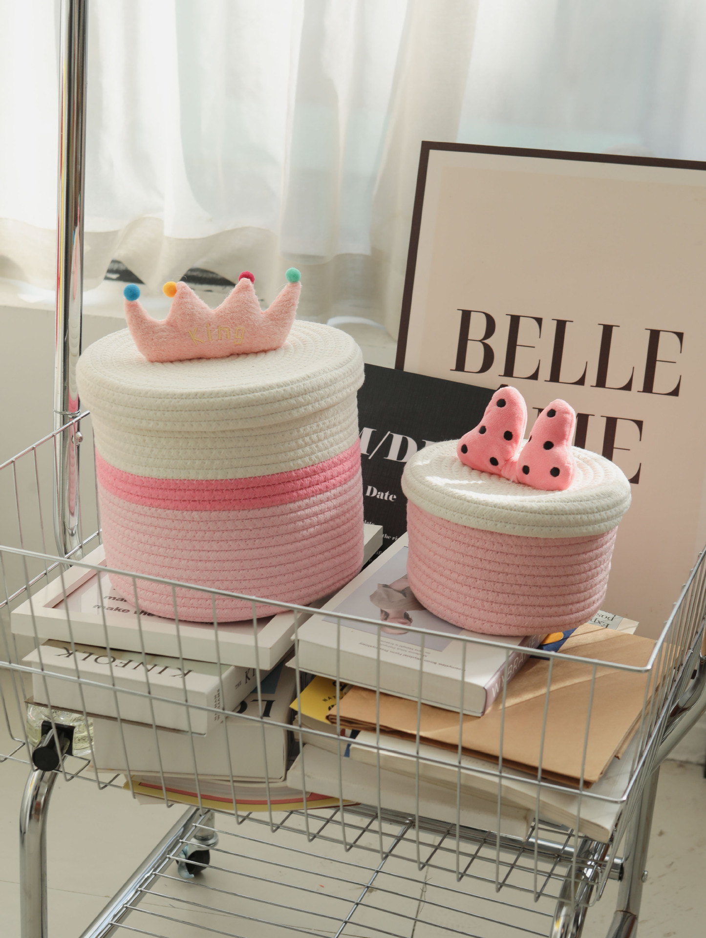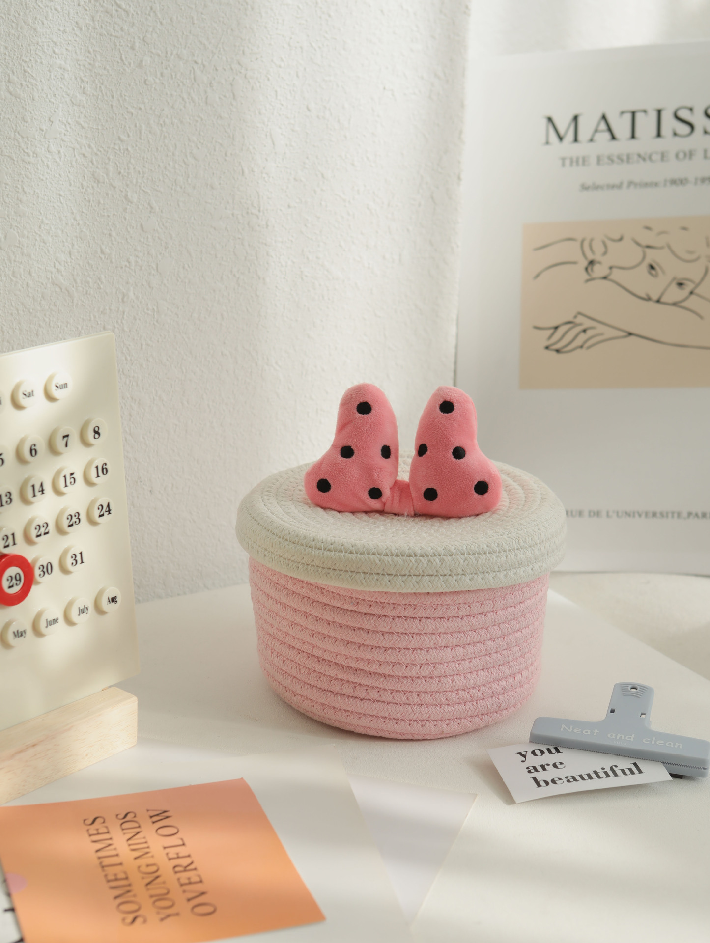 Bowknot 데스크탑 코튼 로프 보관 바구니 귀여운 스타일 보관 바구니 뚜껑 짠 저장 상자 제조 업체 재고스토어 가기