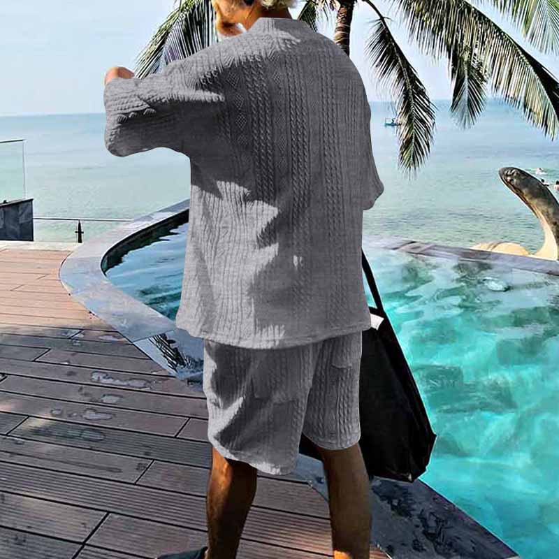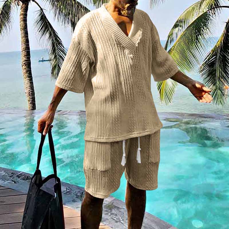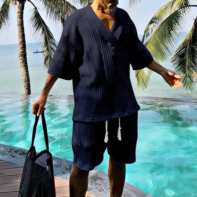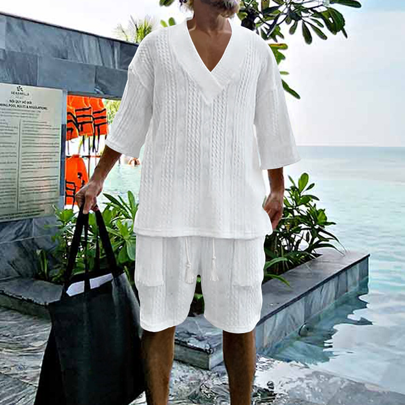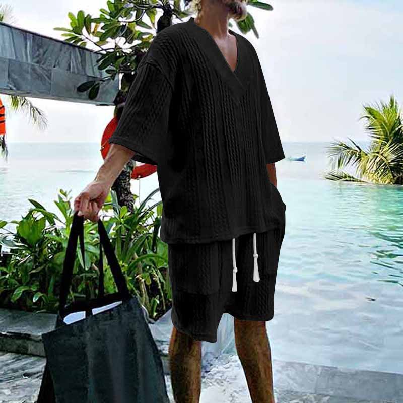 2024 국경 간 캐주얼 자카드 세트 남자 여름 느슨한 반팔 티셔츠 반바지 v-neck 스포츠 세트 투피스 남성복