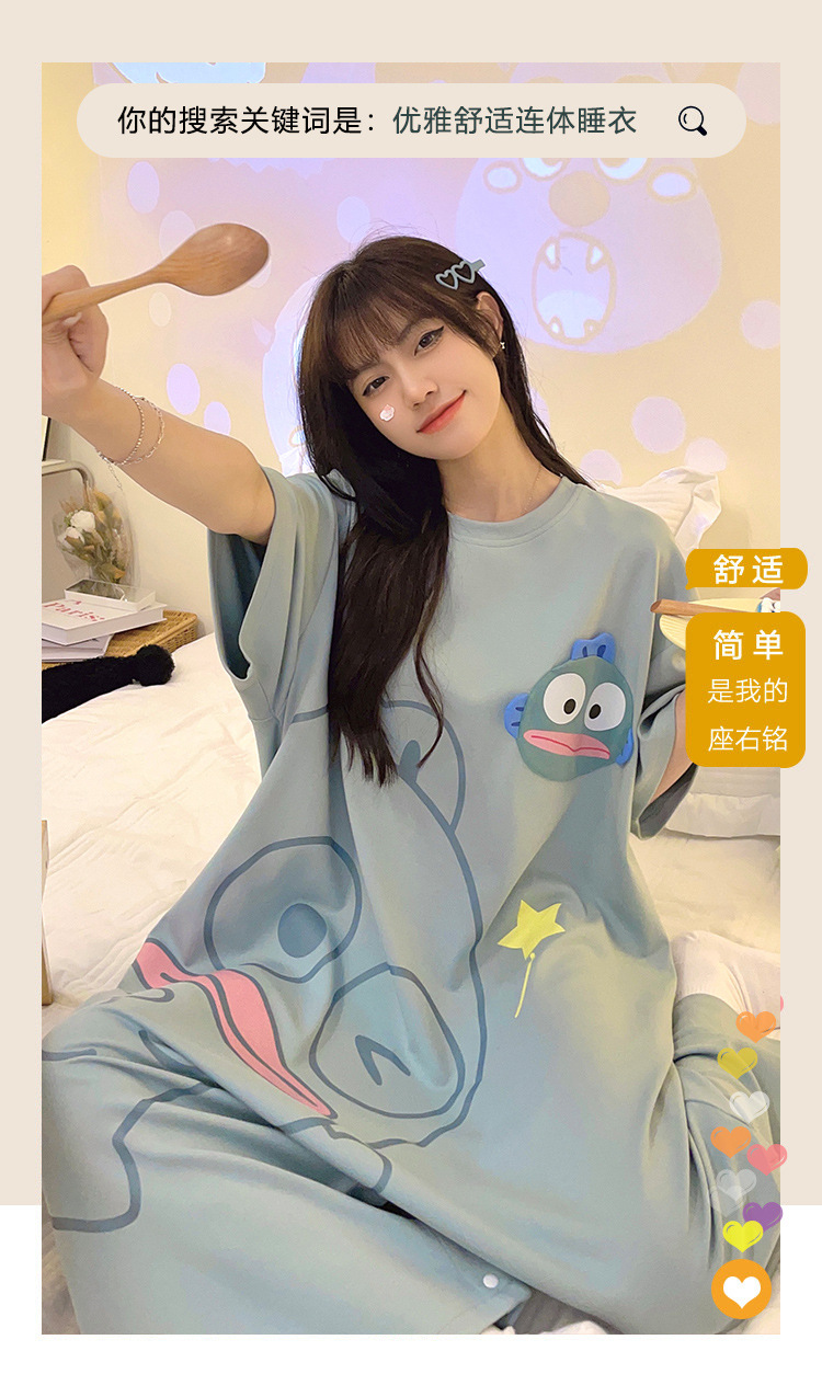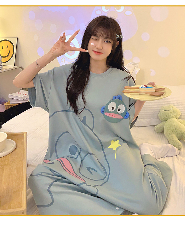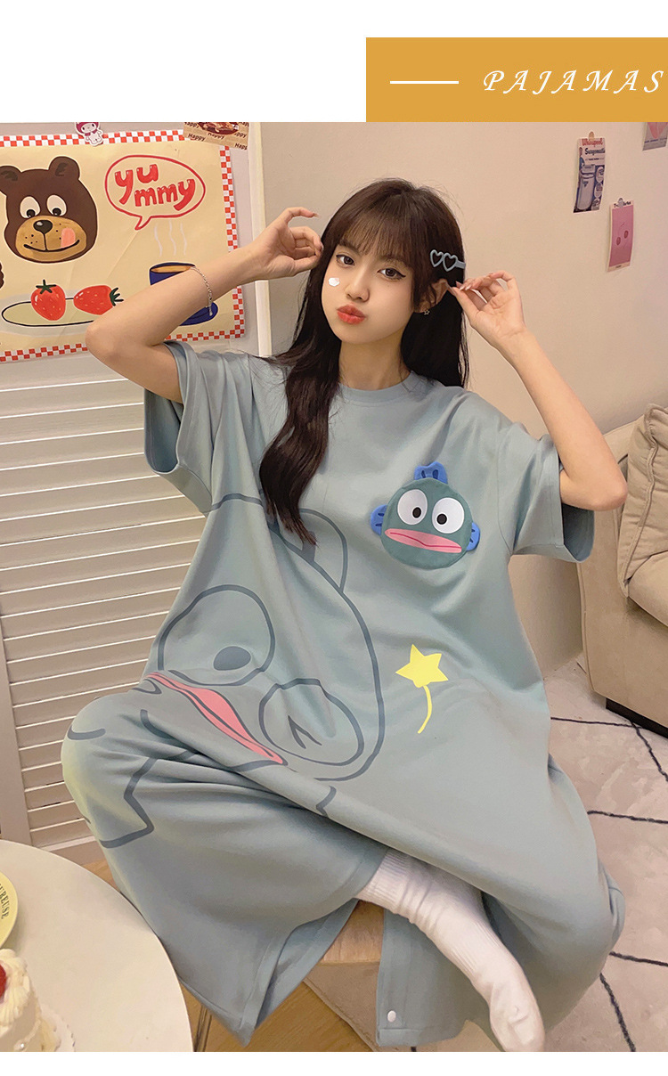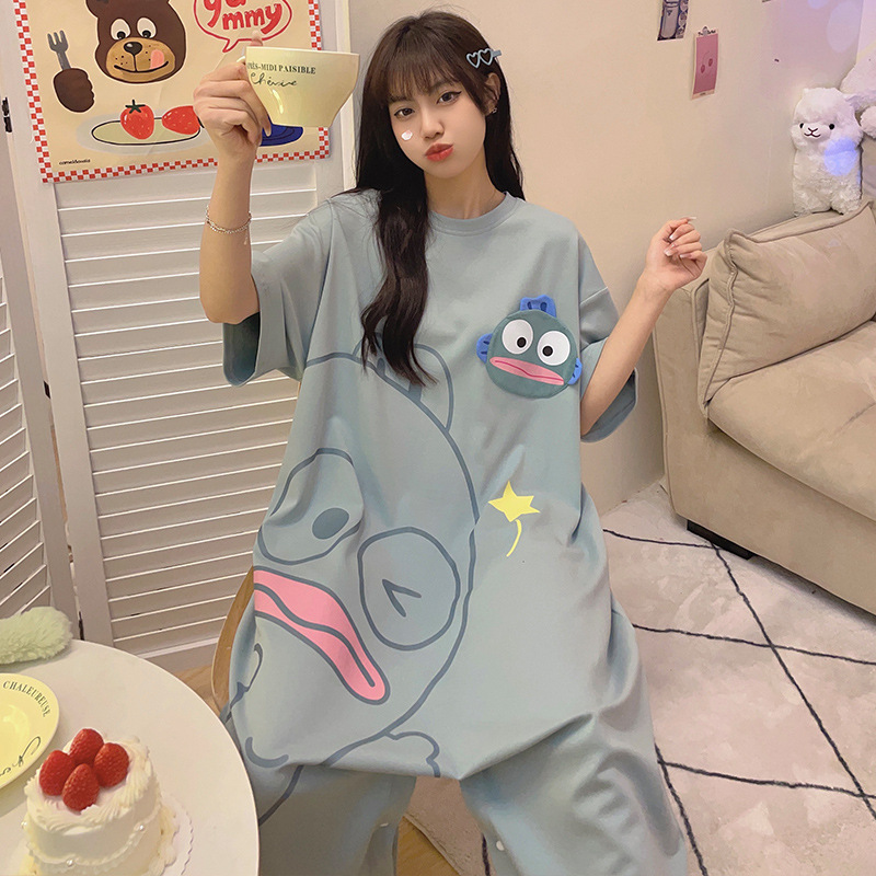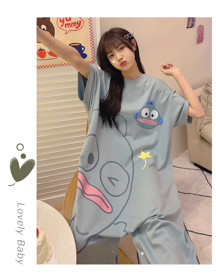 Handton 못생긴 물고기 원피스 잠옷 여성의 여름 얇은면 반팔 만화 플러스 사이즈 느슨한 큰 입 생선 홈 크로스 보더
