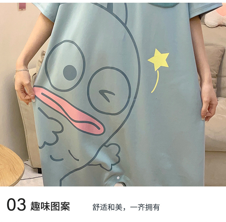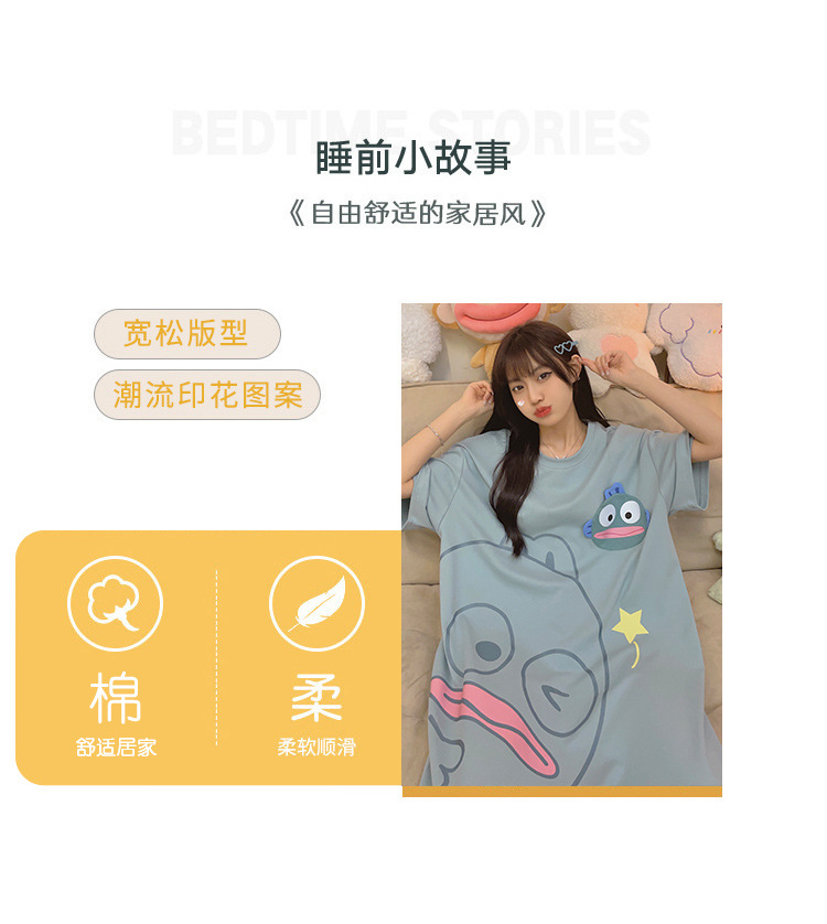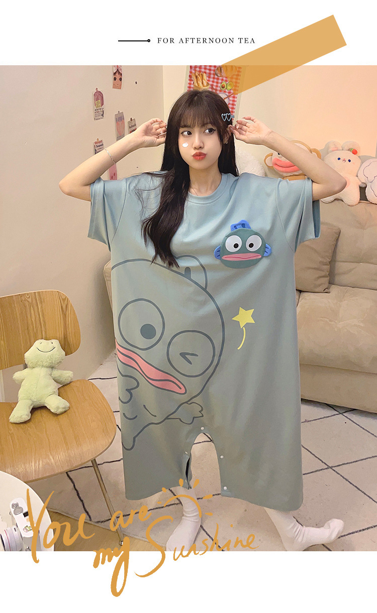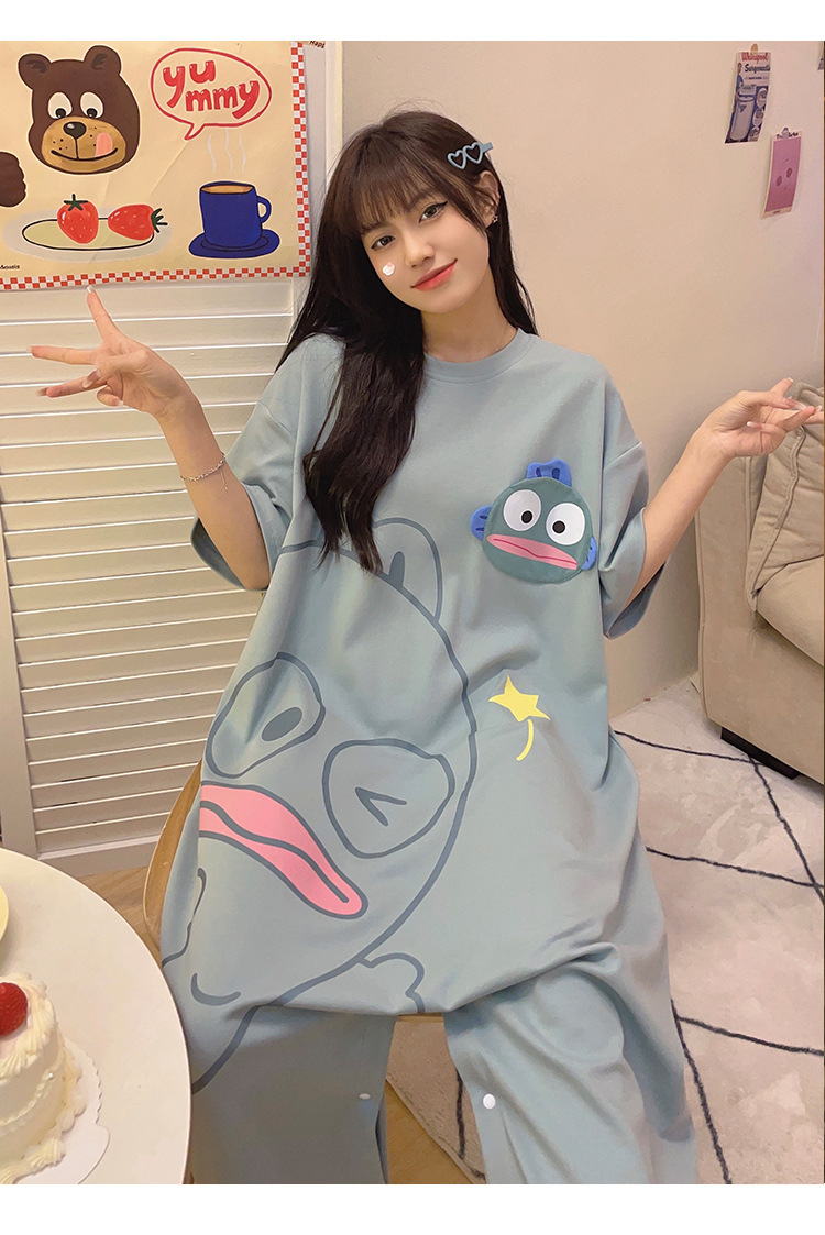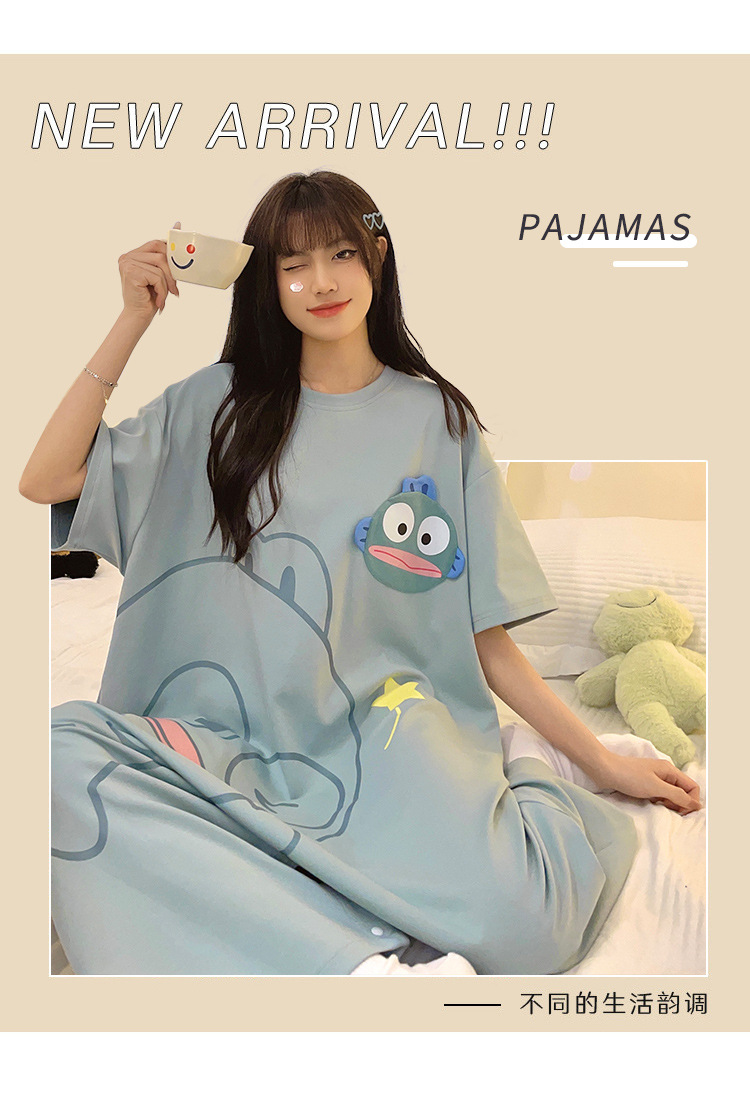 Handton 못생긴 물고기 원피스 잠옷 여성의 여름 얇은면 반팔 만화 플러스 사이즈 느슨한 큰 입 생선 홈 크로스 보더