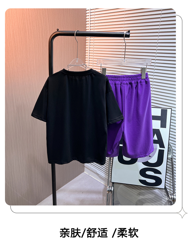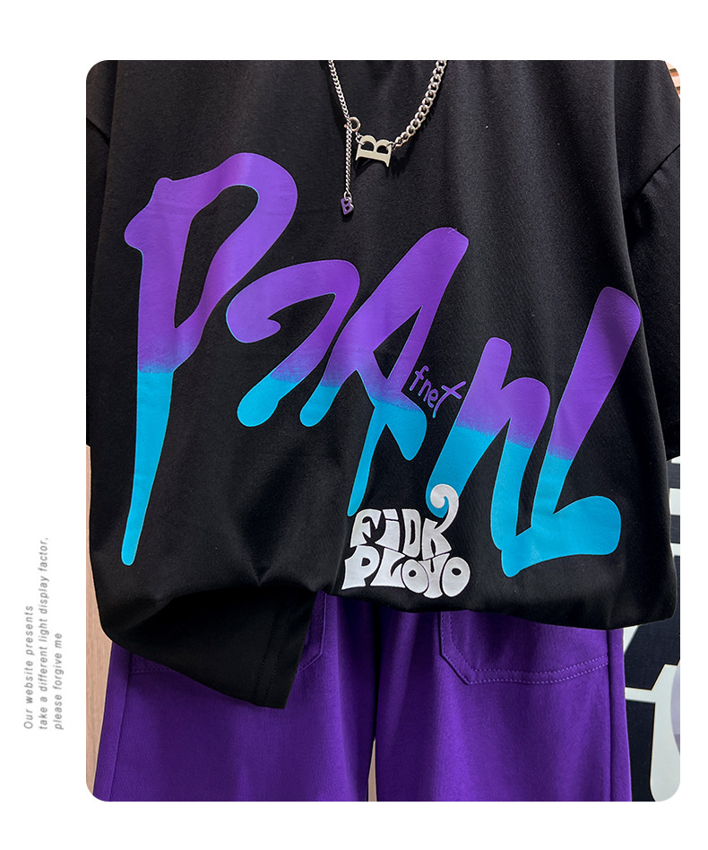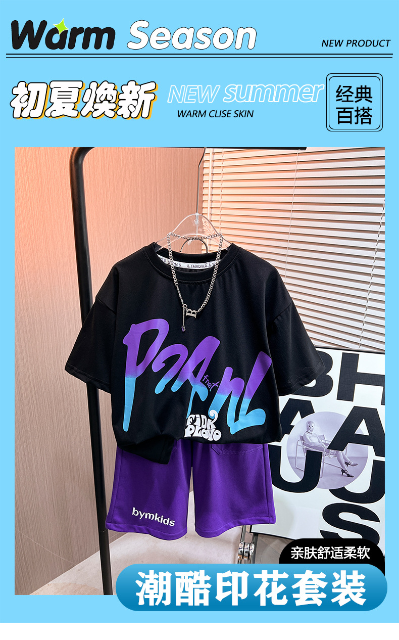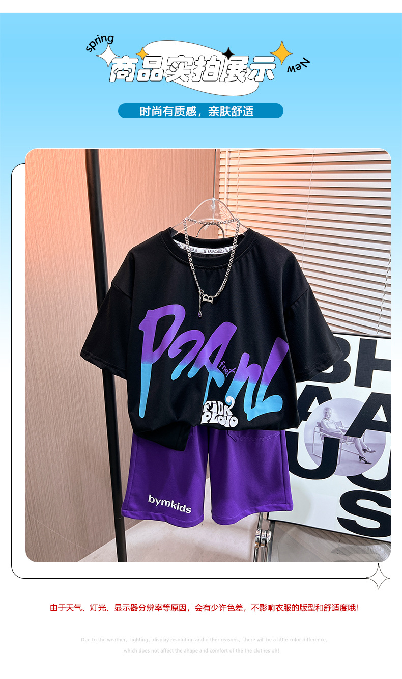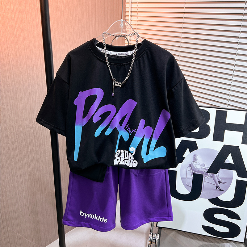 어린이 여름 새로운 2024 캐주얼 짧은 소매 세트 남성 중형 및 대형 어린이의 세련된 프린트 라운드 넥 스포츠 t 투피스 세트
