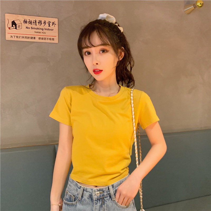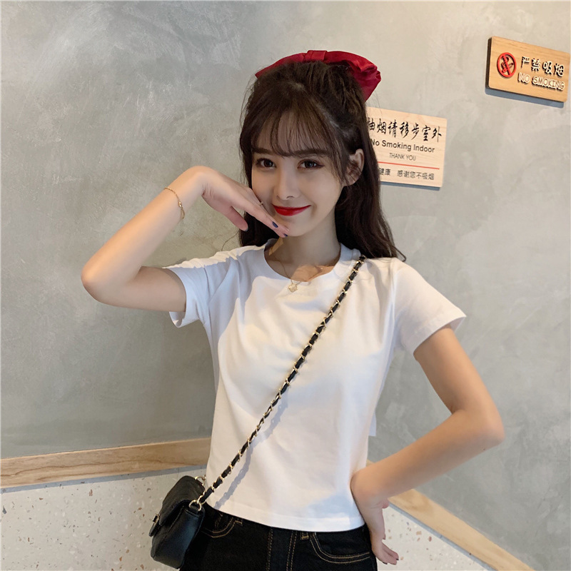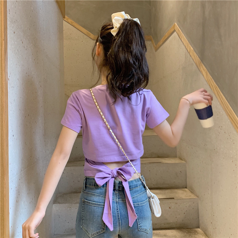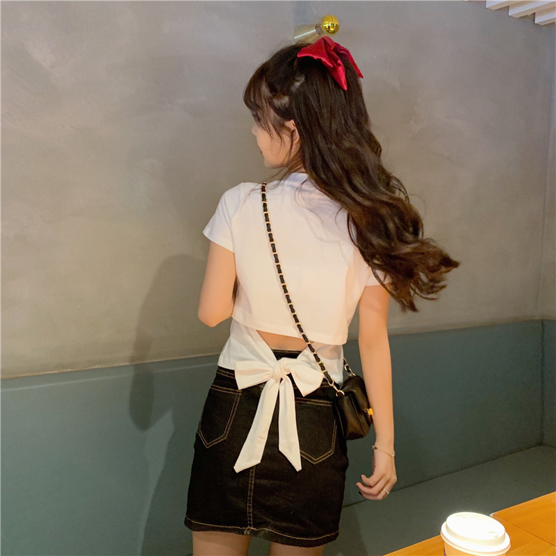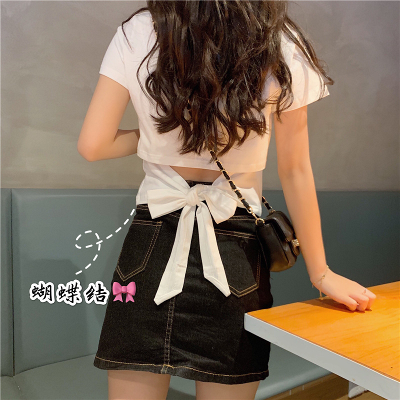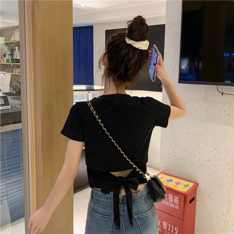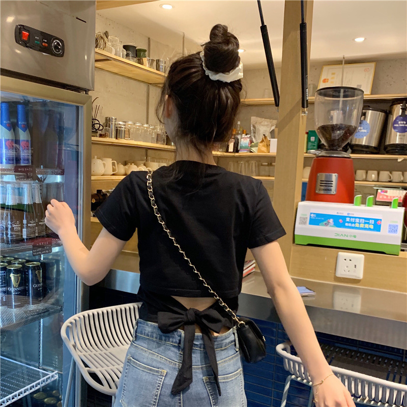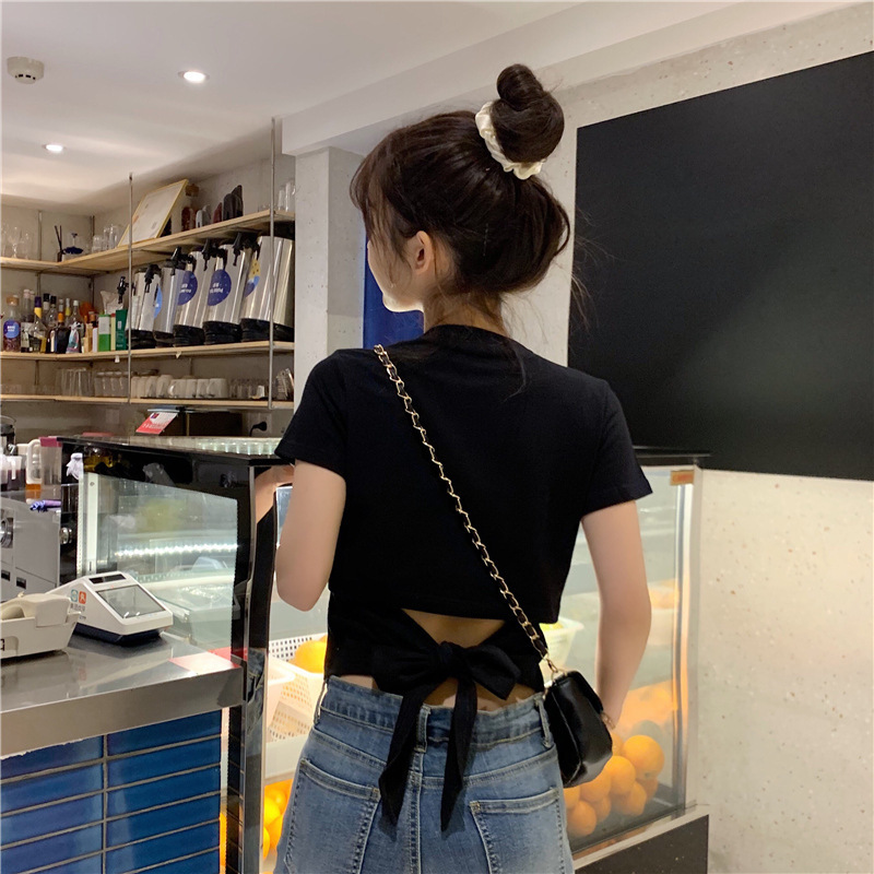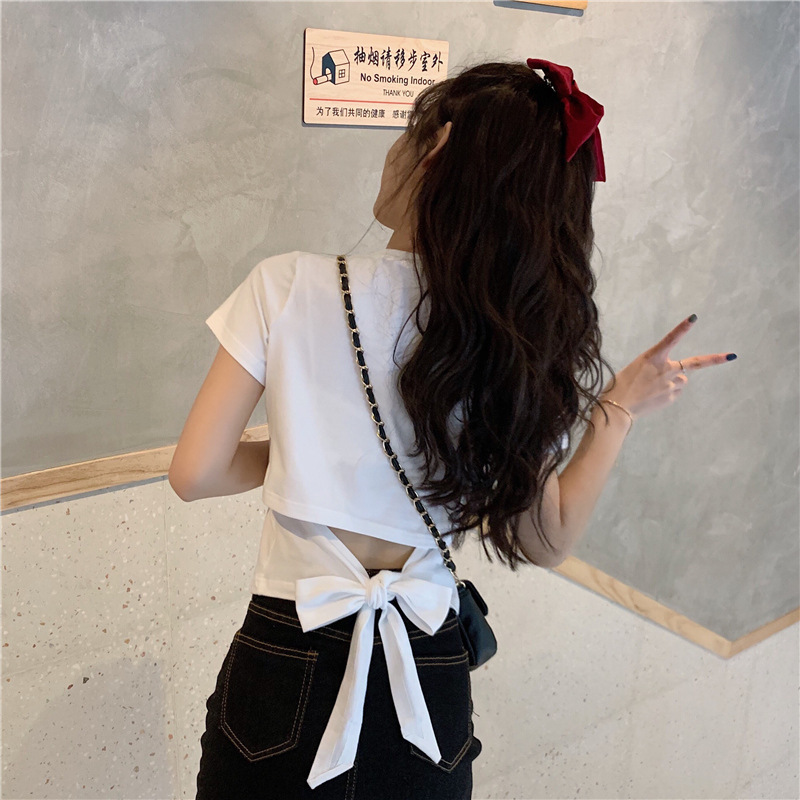 디자인감 있는 반팔 티셔츠 여성 여름 2025 신상 한국 스타일 순수하고 섹시한 백리스 리본 숏탑 트렌디스토어 가기