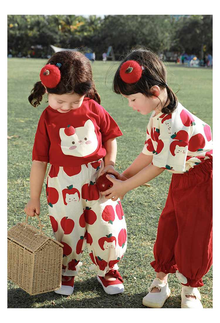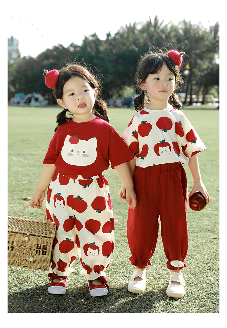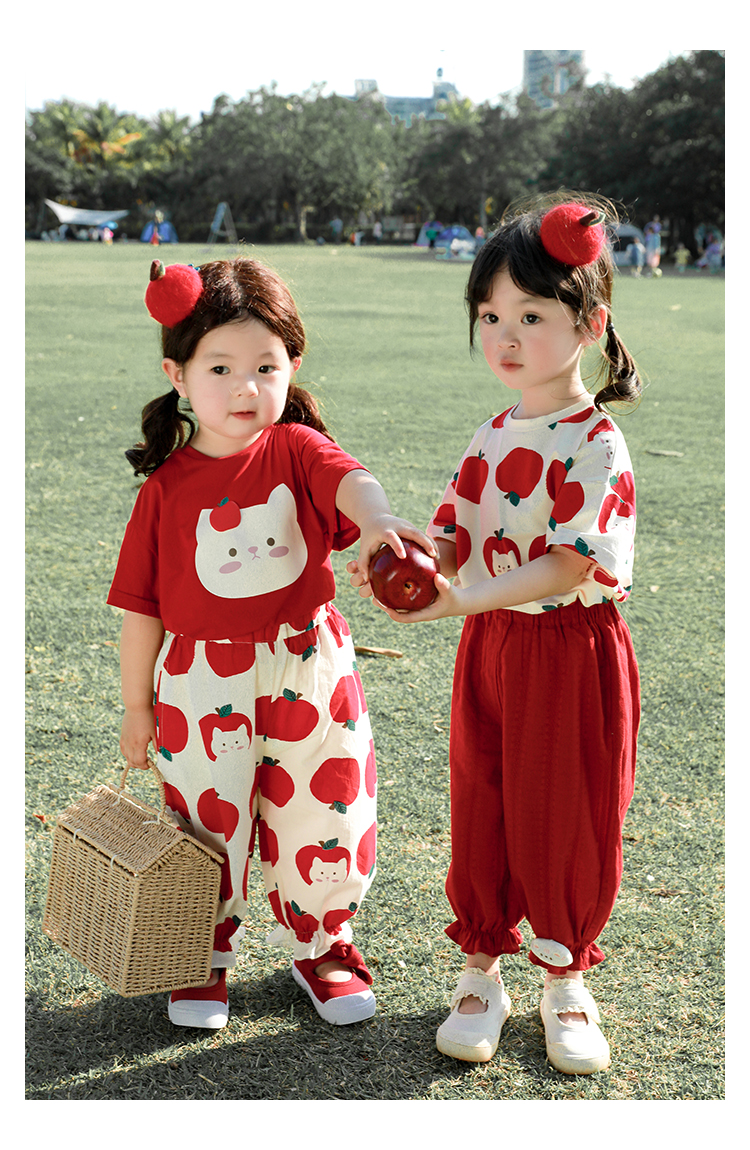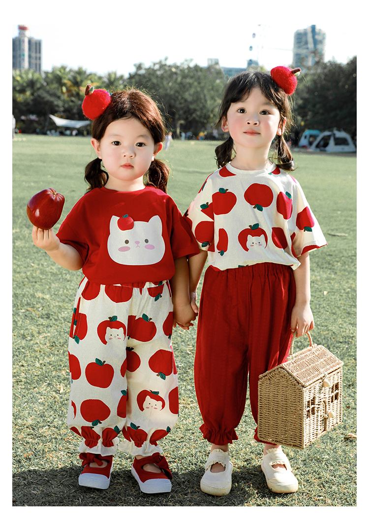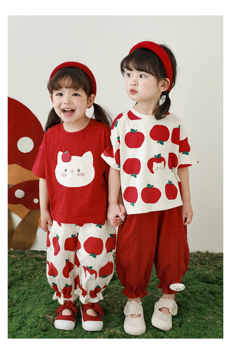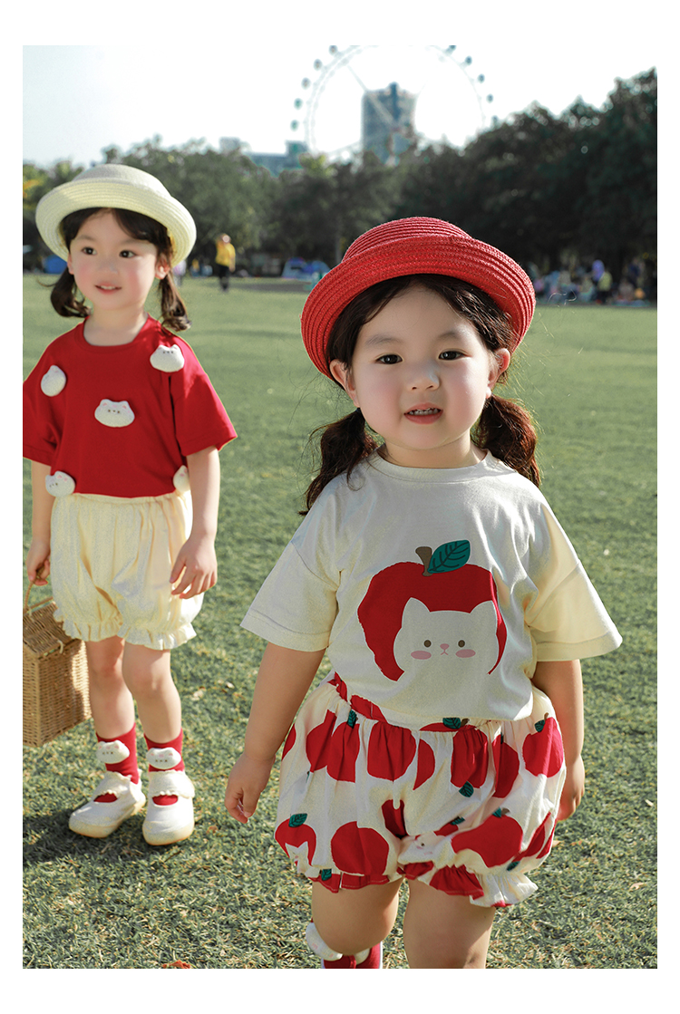 Wuri Boo Girls Apple 시리즈 세트 여름 아기 귀여운 풀 프린트 티셔츠 어린이 느슨한 캐주얼 바지