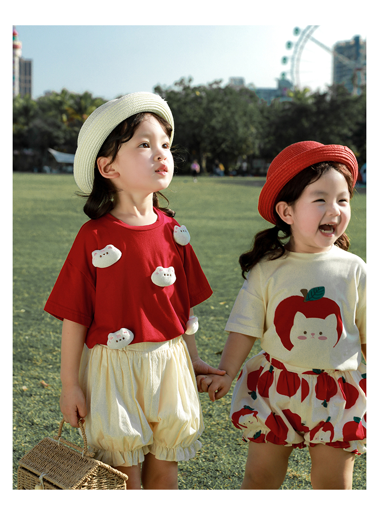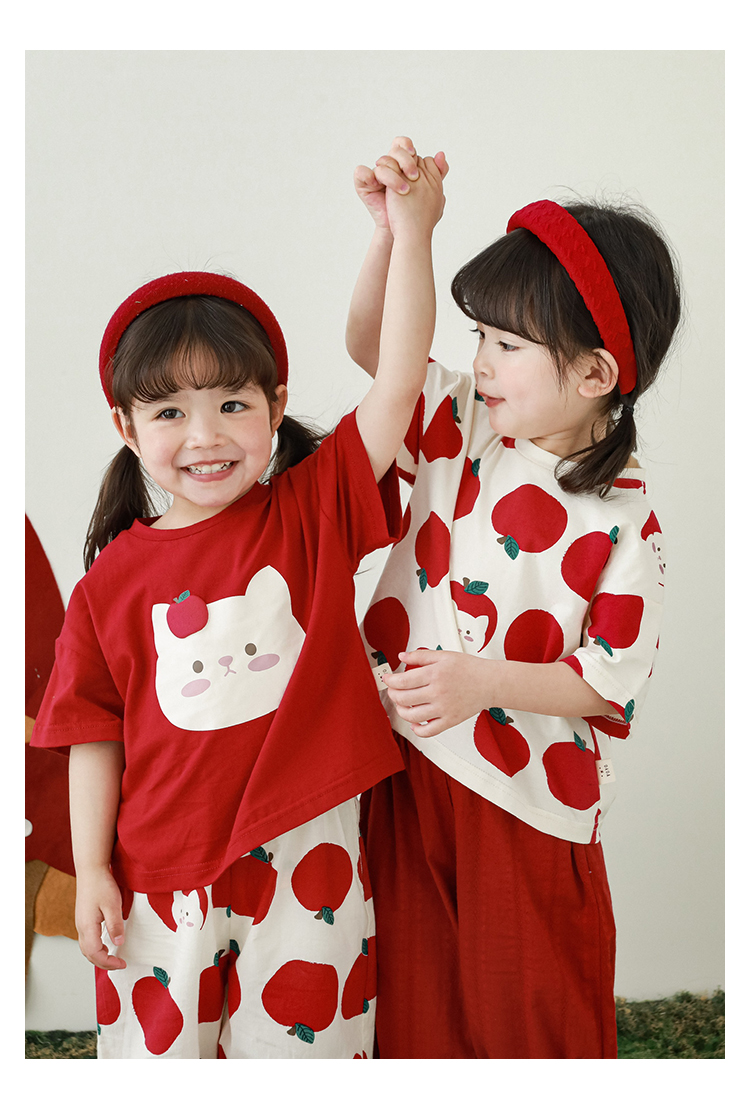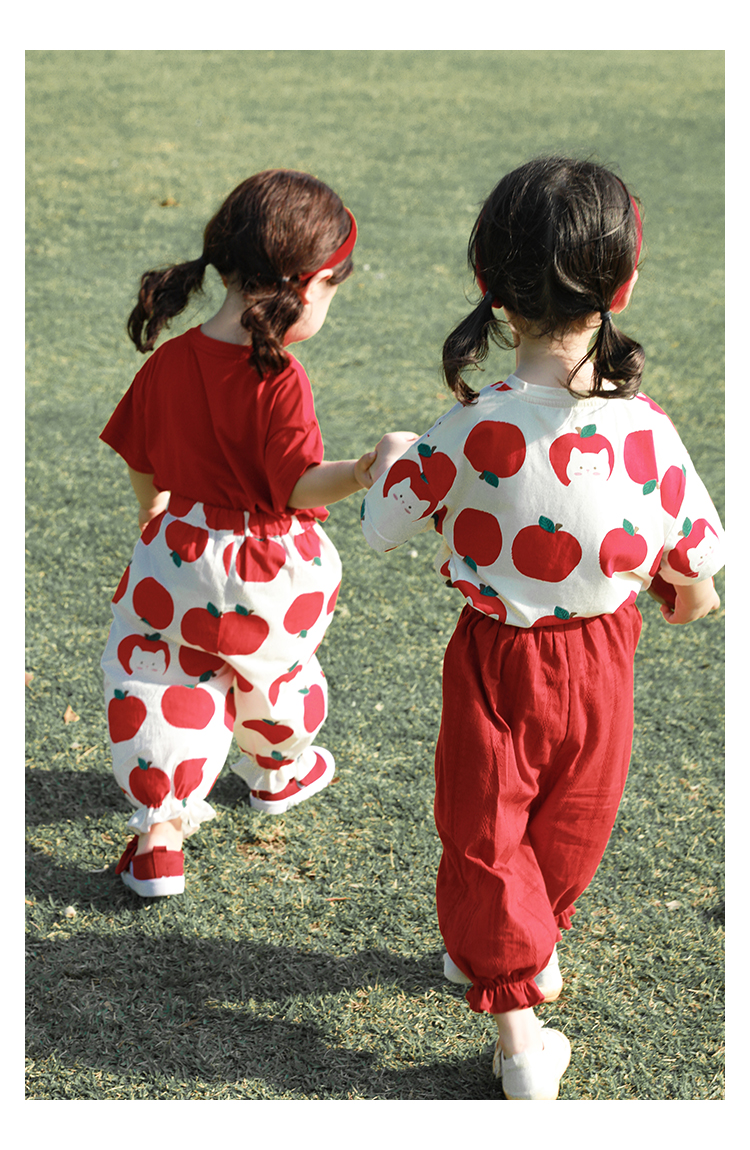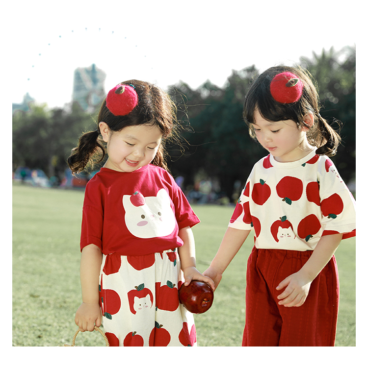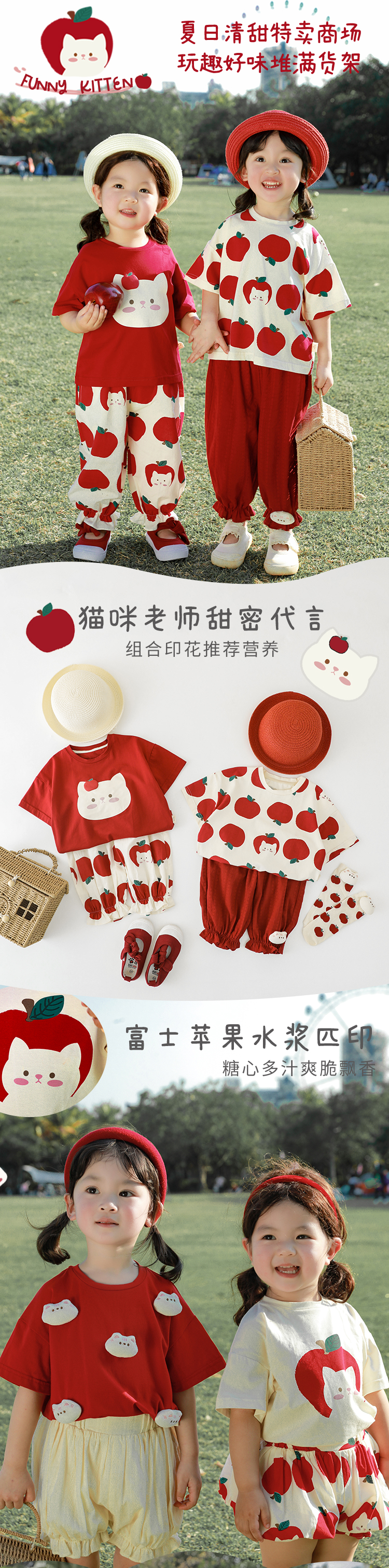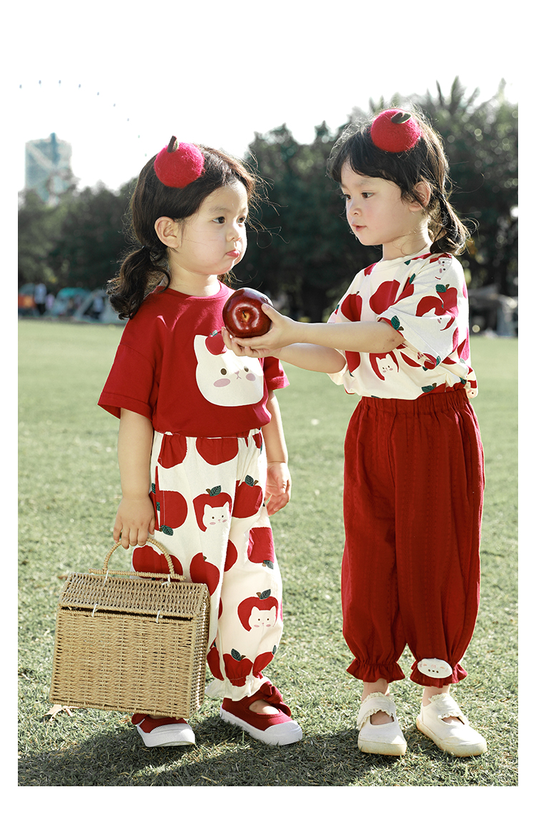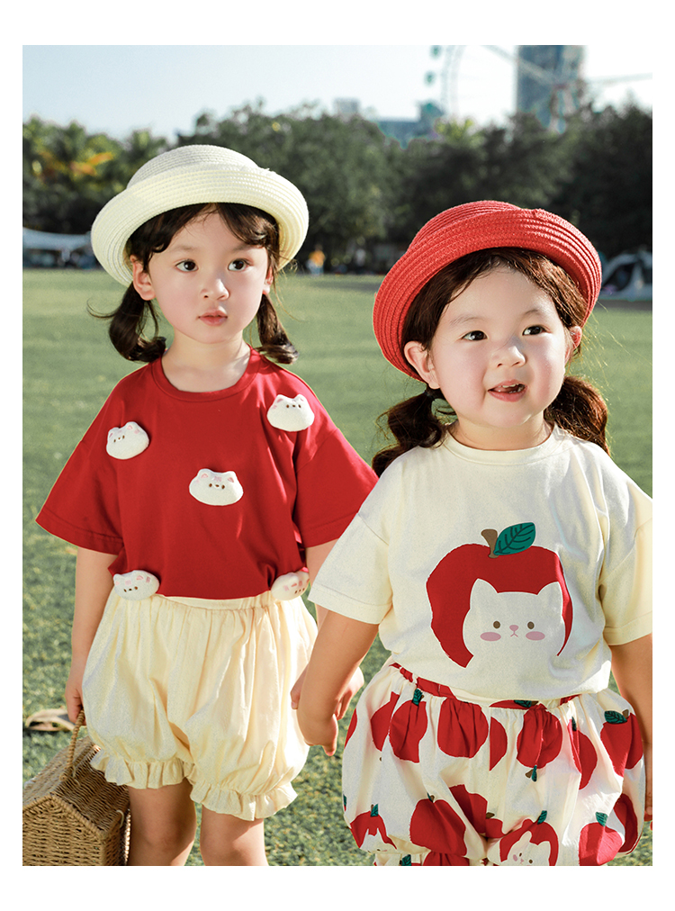 Wuri Boo Girls Apple 시리즈 세트 여름 아기 귀여운 풀 프린트 티셔츠 어린이 느슨한 캐주얼 바지