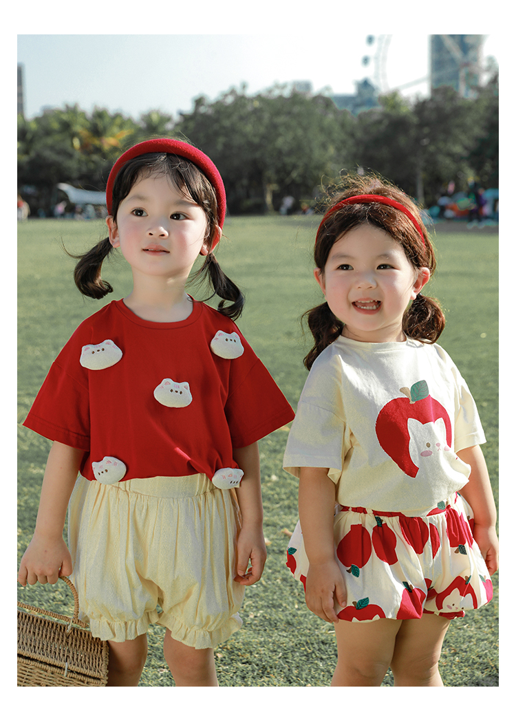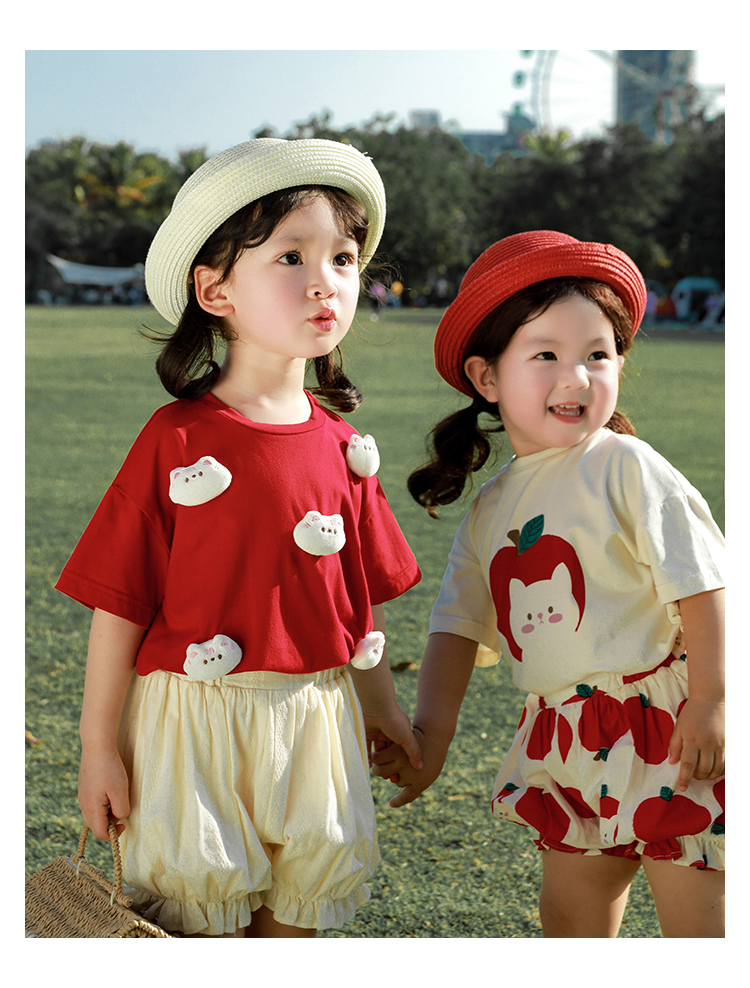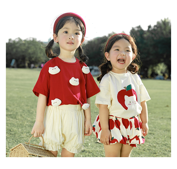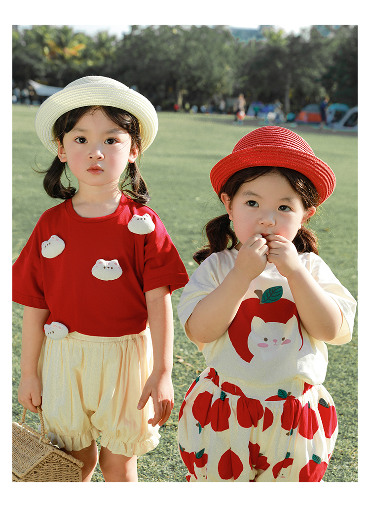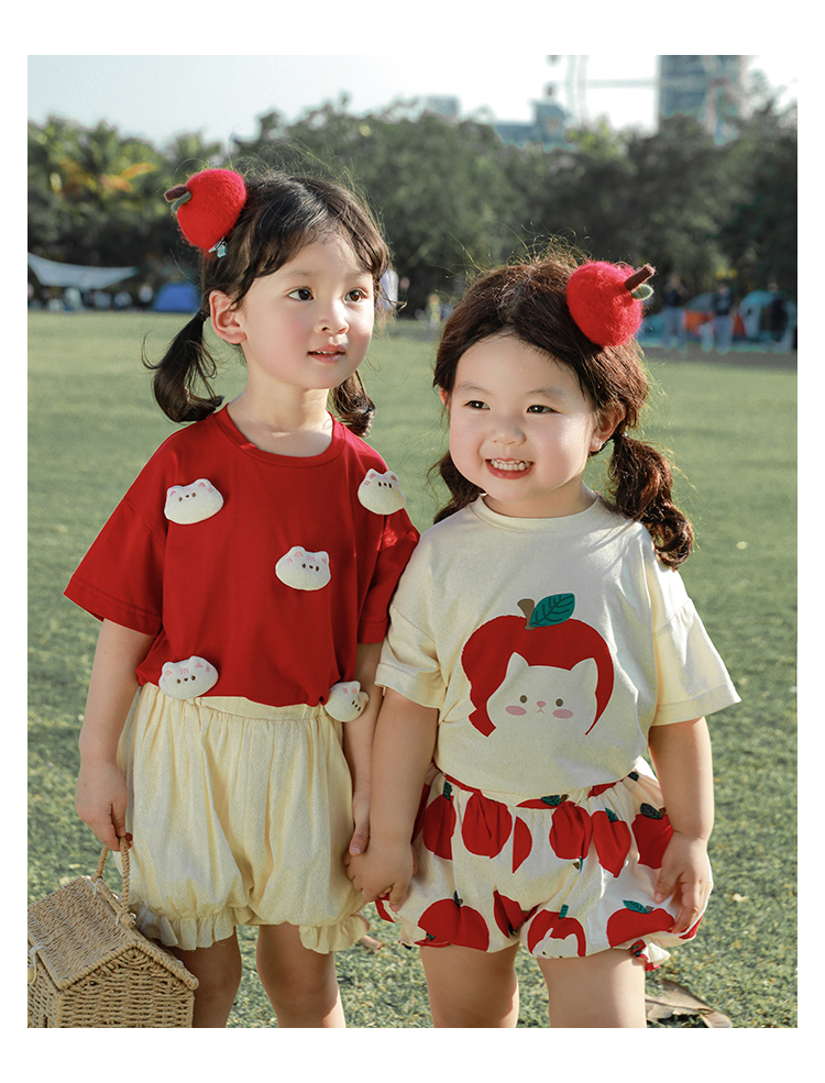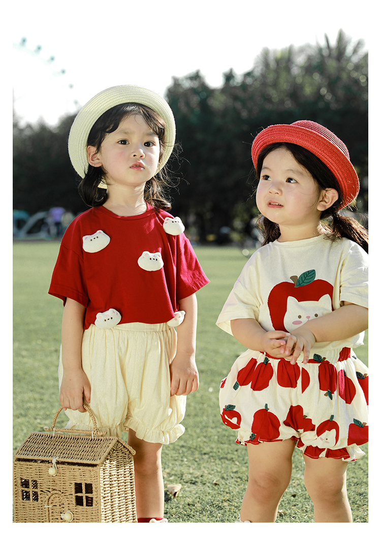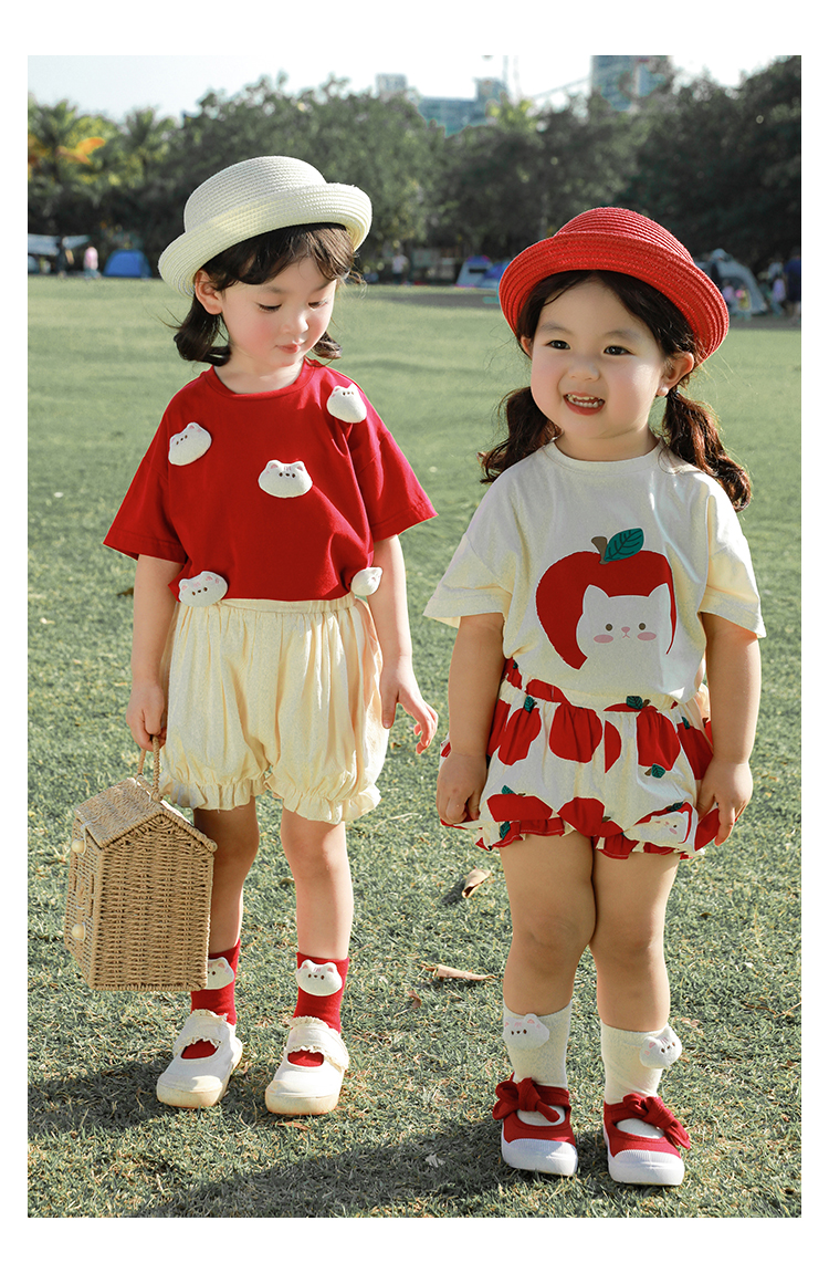 Wuri Boo Girls Apple 시리즈 세트 여름 아기 귀여운 풀 프린트 티셔츠 어린이 느슨한 캐주얼 바지