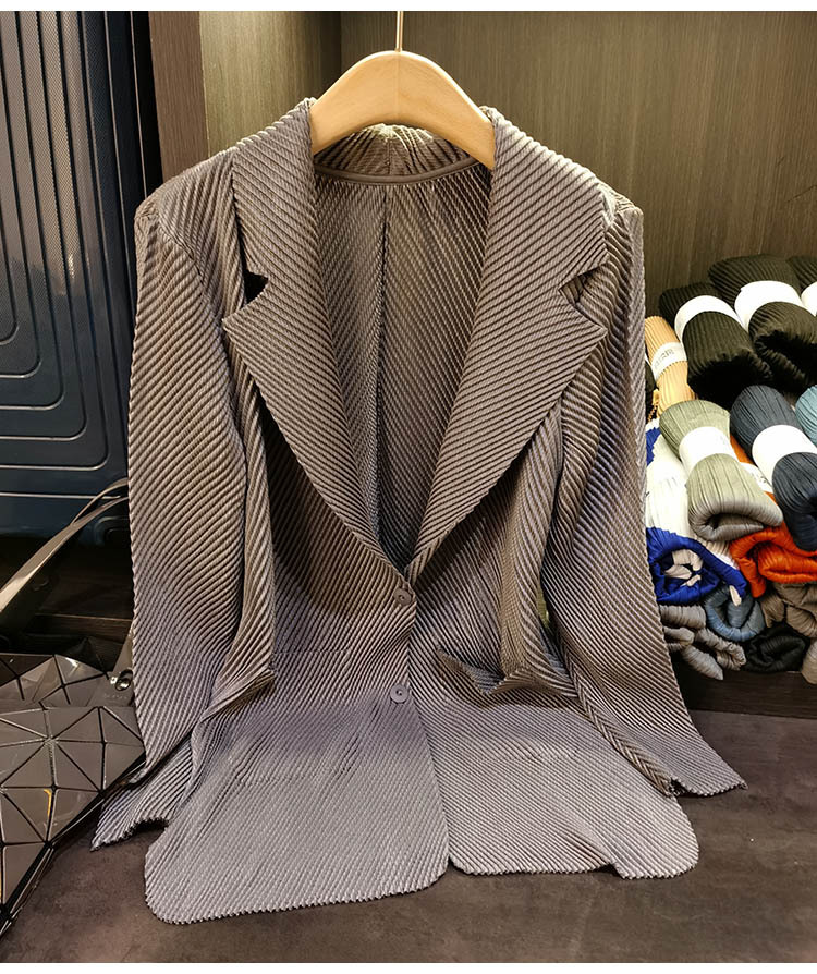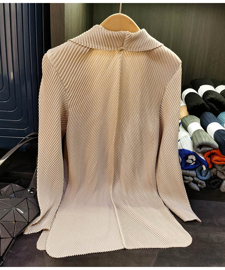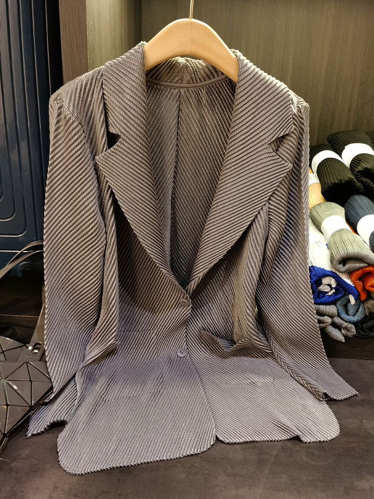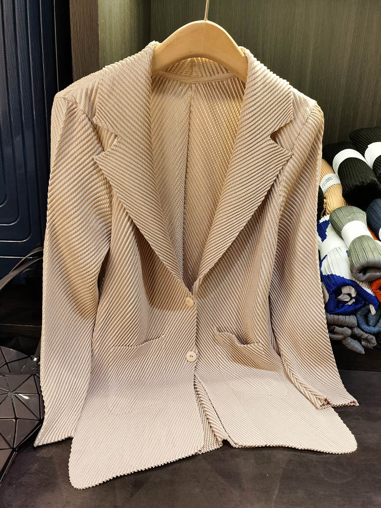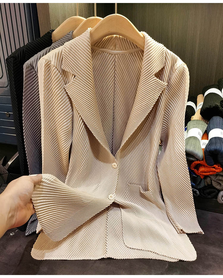심플한 솔리드 컬러 드래곤 스케일 플리츠 블레이저, 우아한 통근 스타일, 투버튼 긴팔 가디건, 여성 가을 신상