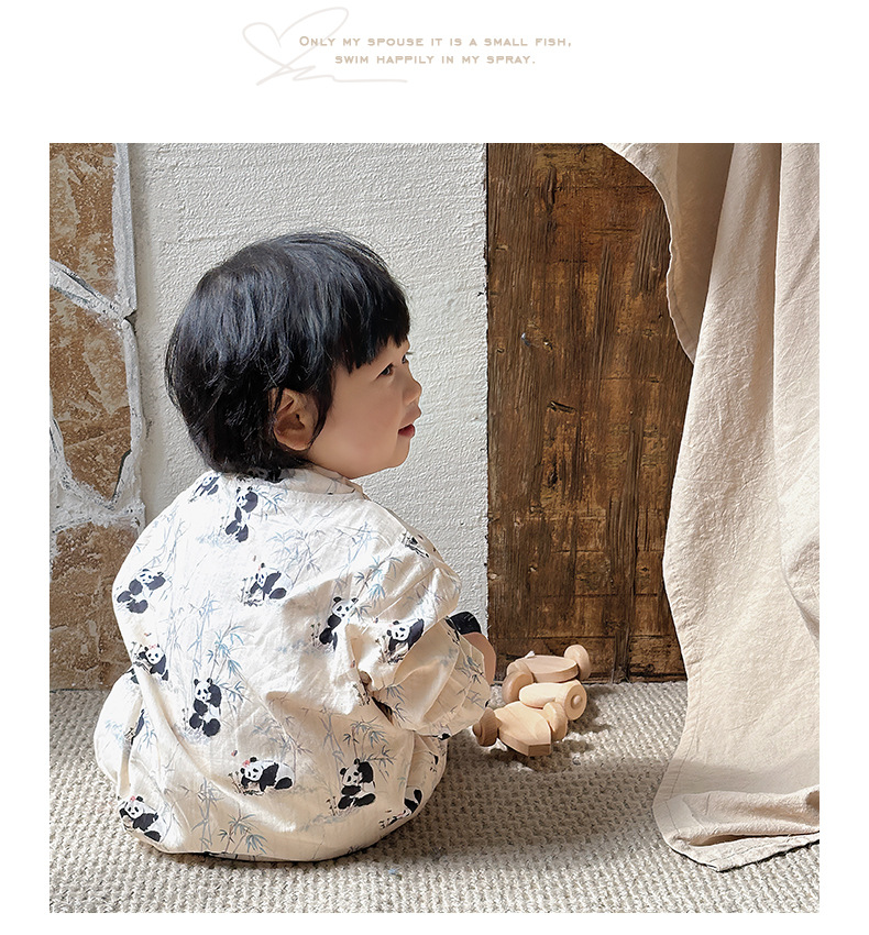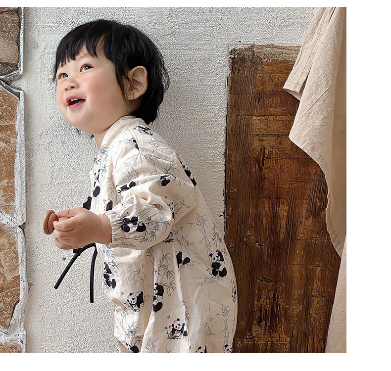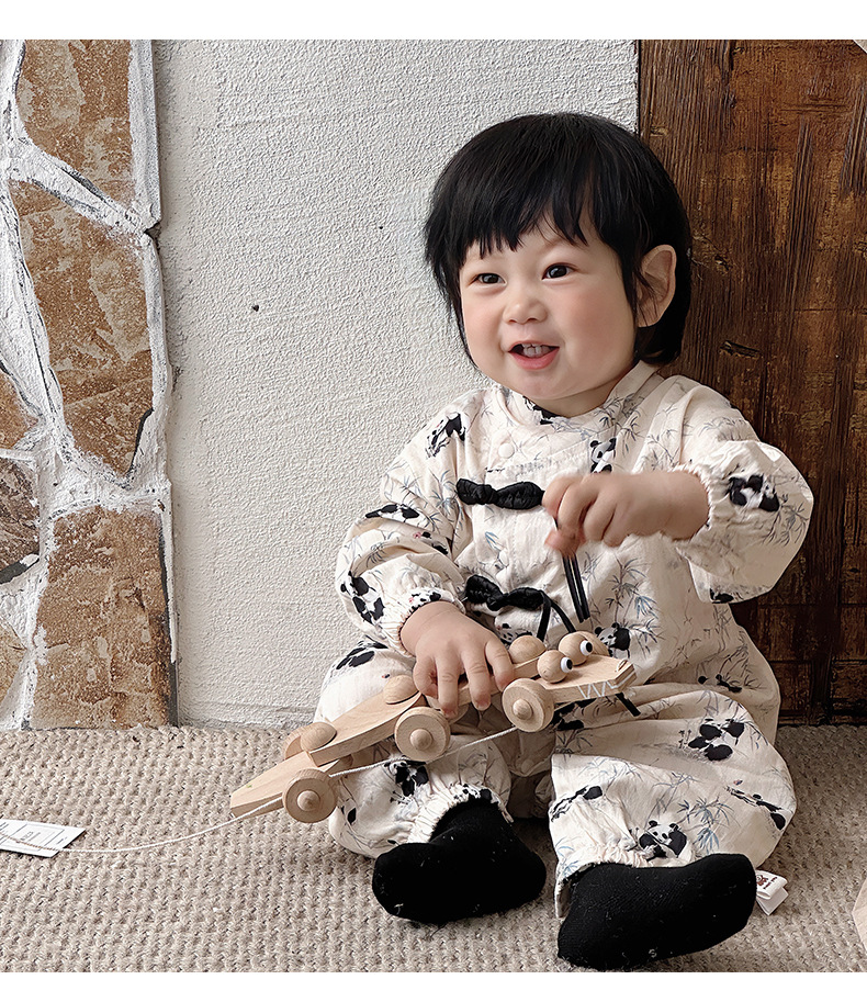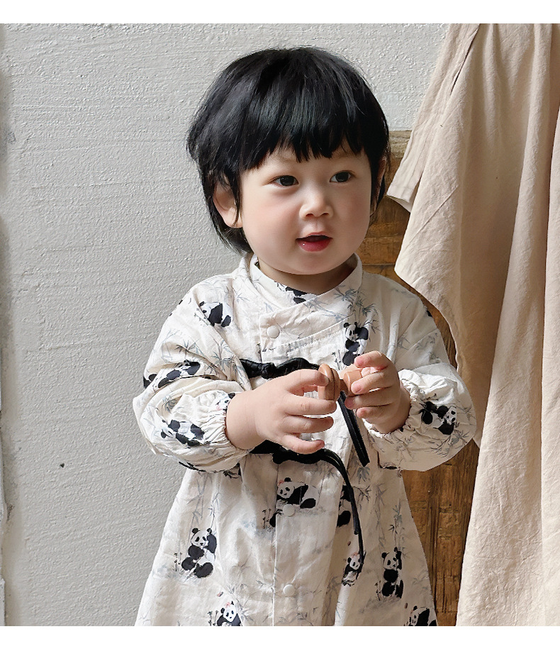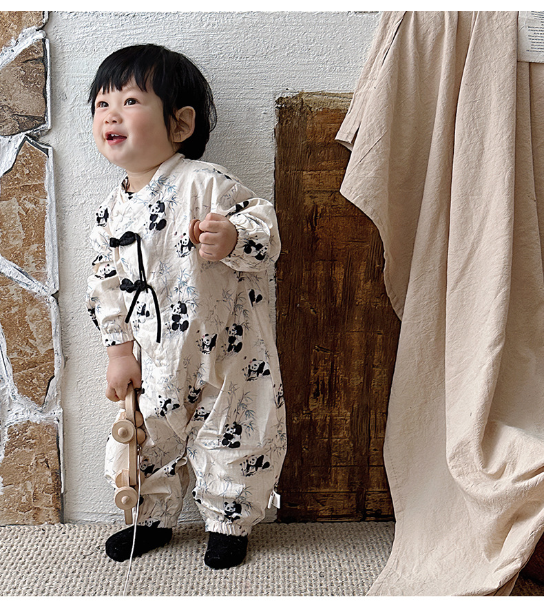 아기의 새로운 중국식 버클 팬더 긴팔 점프 수트 2024 봄과 가을 아기 백일 한 달 된 Romper 한 살짜리 옷스토어 가기
