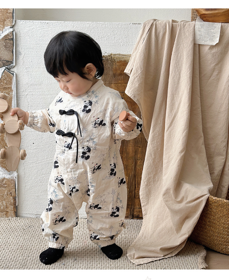 아기의 새로운 중국식 버클 팬더 긴팔 점프 수트 2024 봄과 가을 아기 백일 한 달 된 Romper 한 살짜리 옷