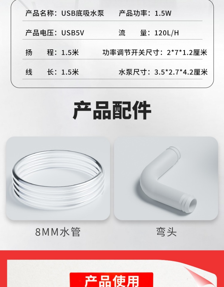• USB 하단 흡입 펌프 + 수도관 반 미터 + 엘보