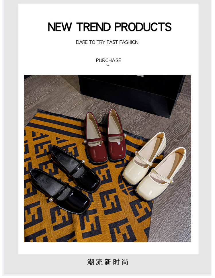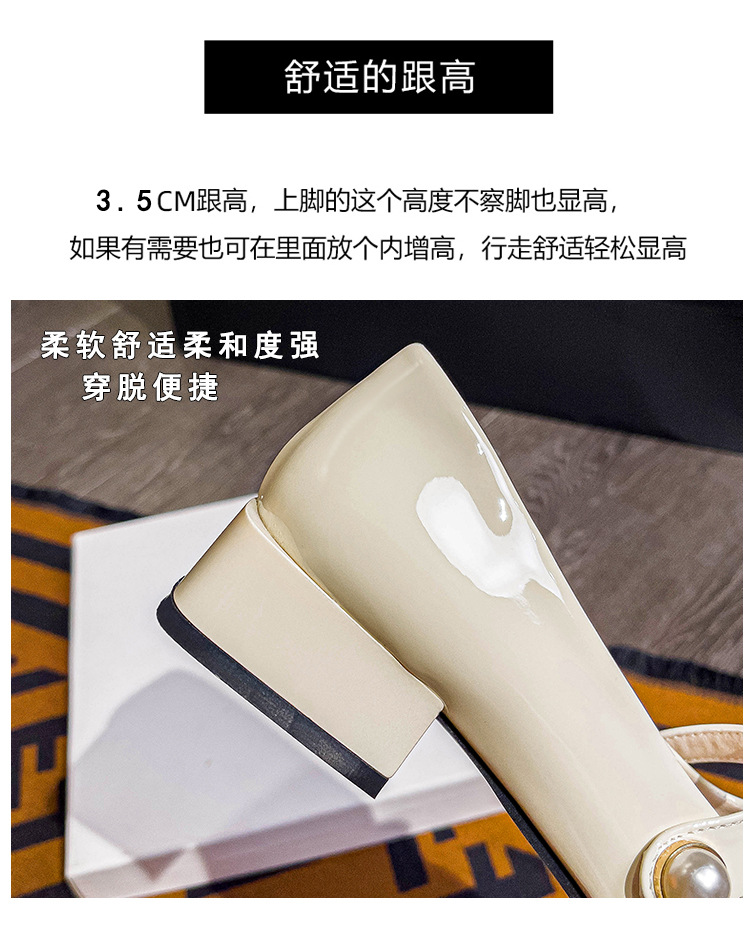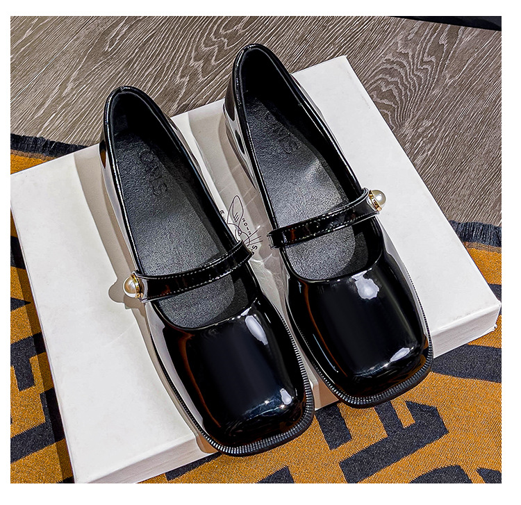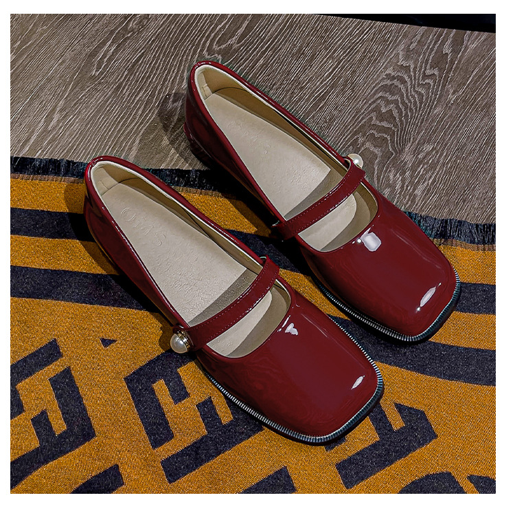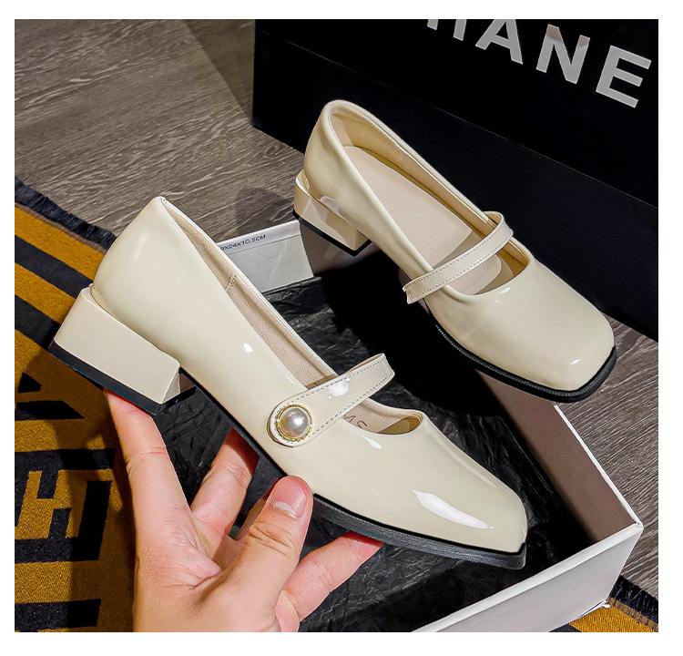 로우 컷 메리 제인 신발 여성 원피스 프랑스 하이힐 요정 스타일 가죽 신발 진주 특허 가죽 미드 힐 신발