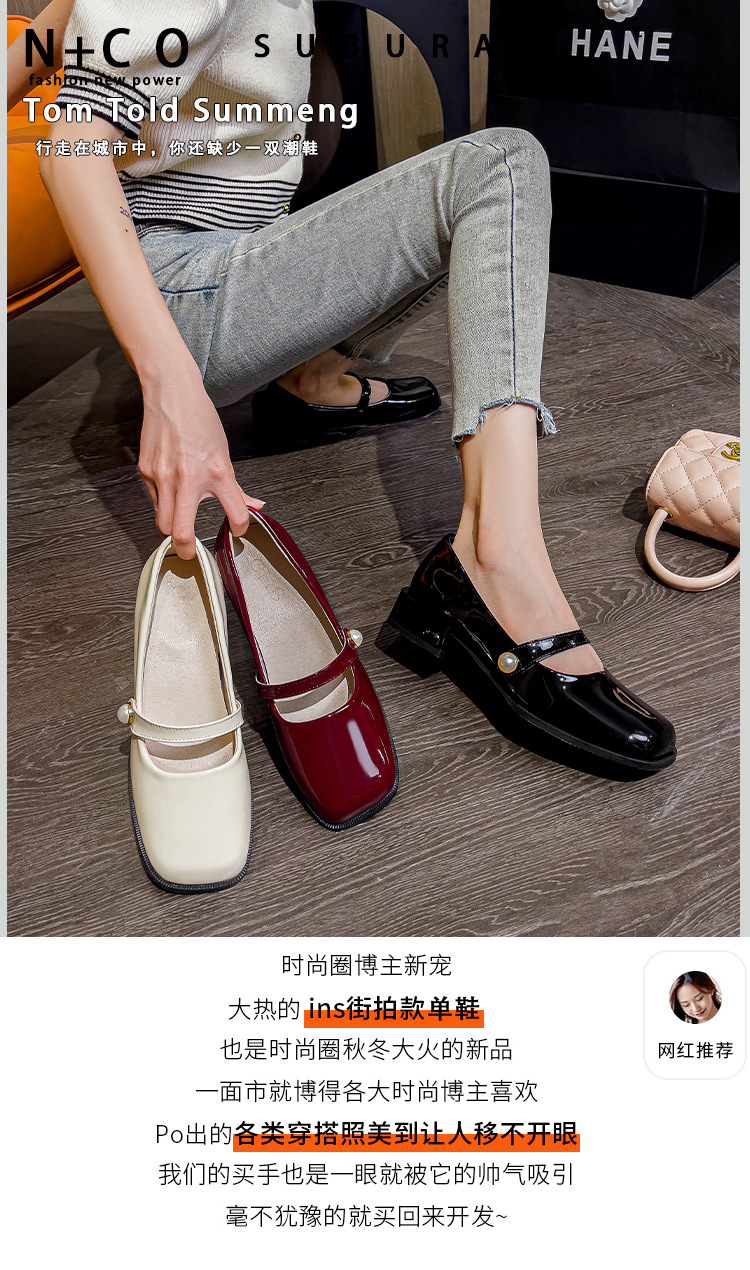 로우 컷 메리 제인 신발 여성 원피스 프랑스 하이힐 요정 스타일 가죽 신발 진주 특허 가죽 미드 힐 신발스토어 가기