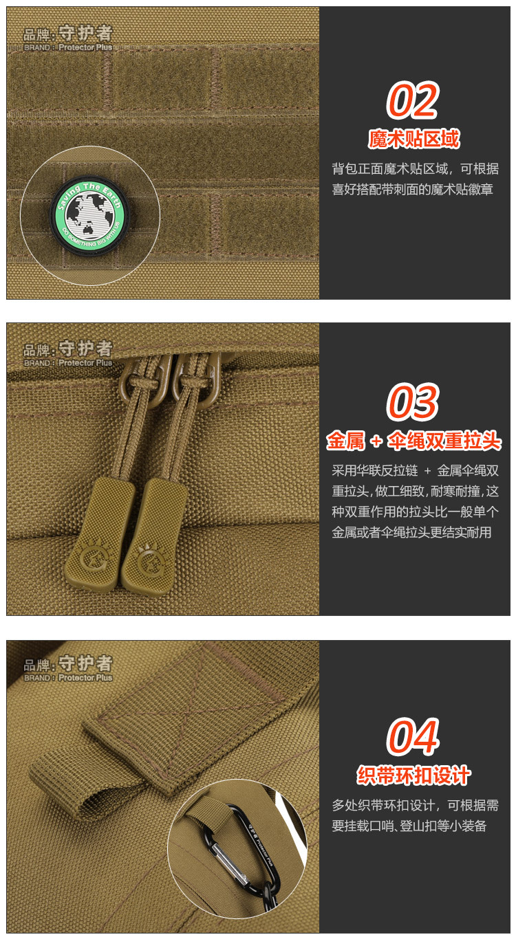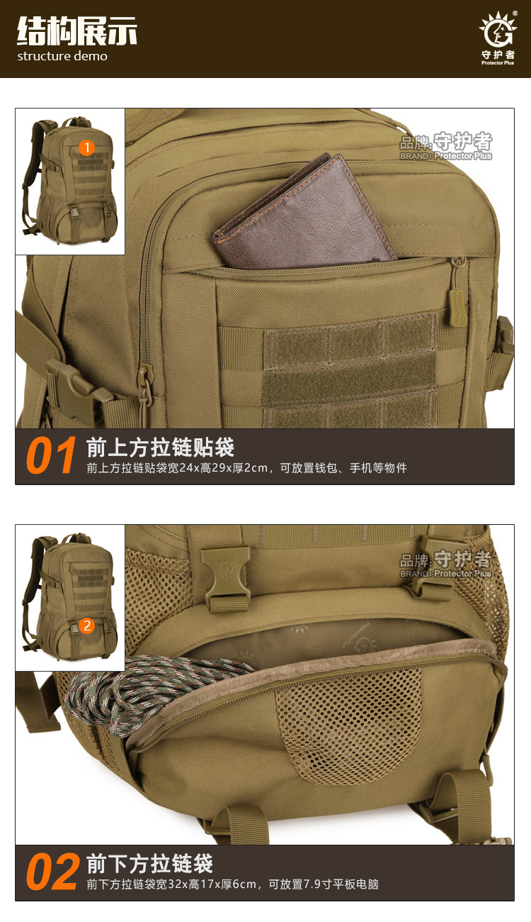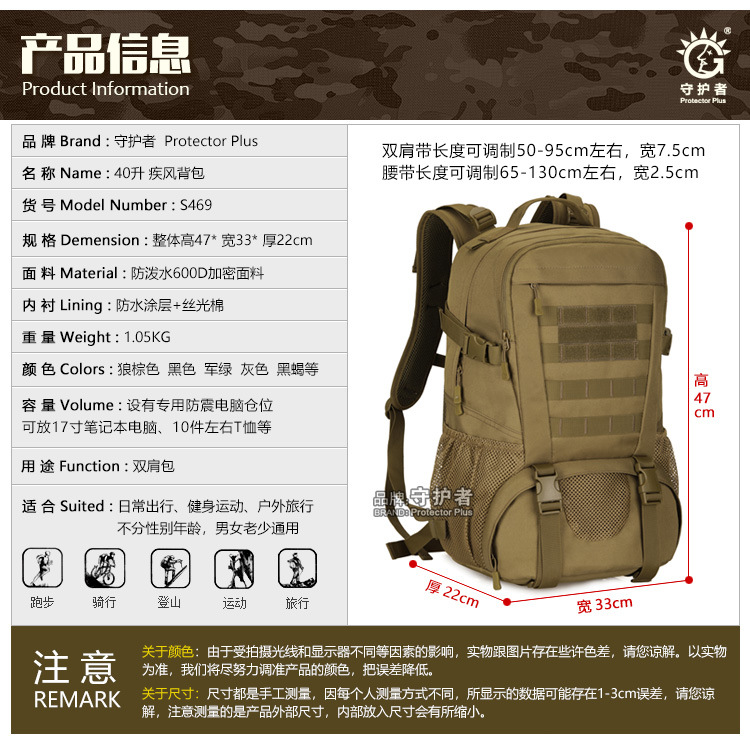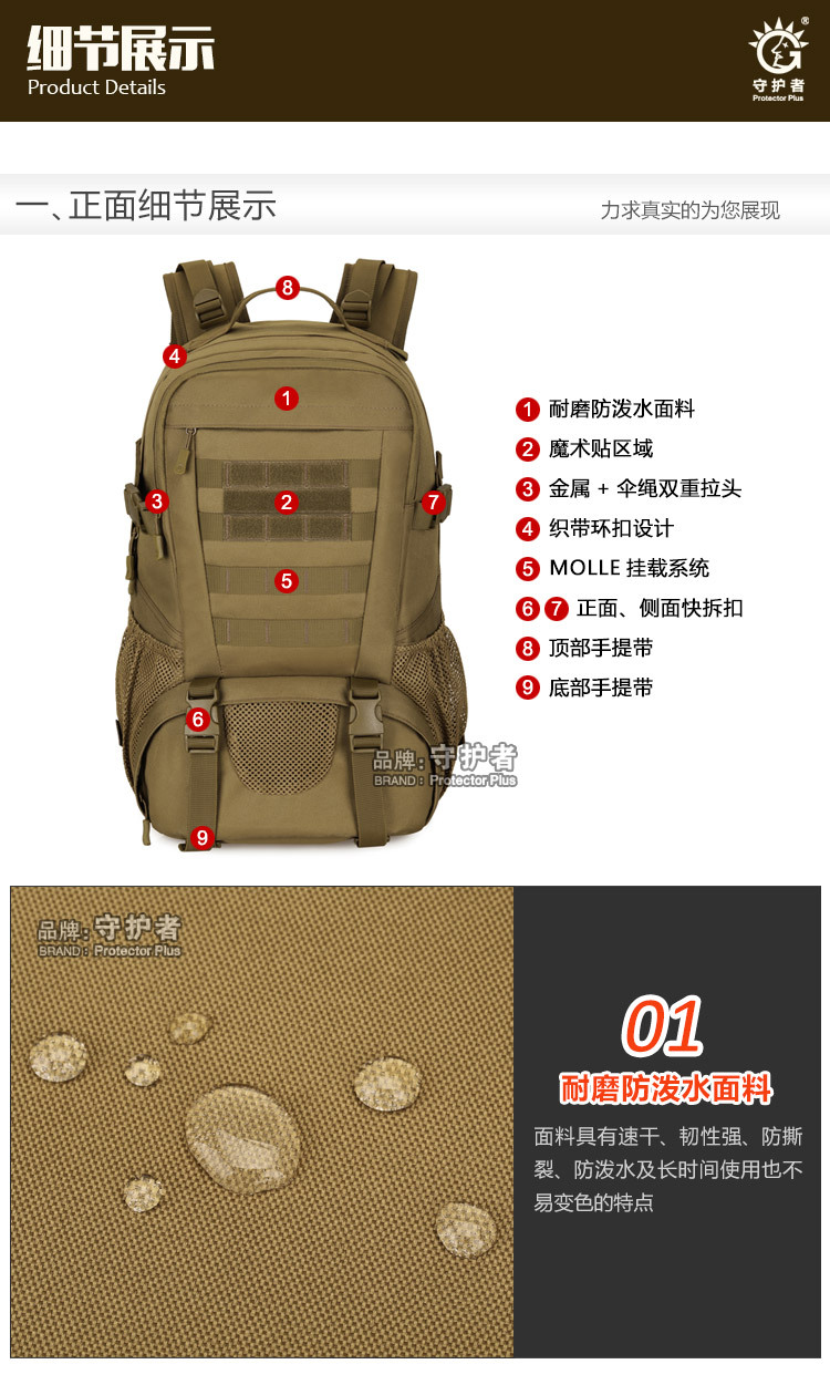 守护者箱包厂是一家专业设计、生产、销售户外背包、腰包、胸包、斜挎包、腰带、背心等产品的诚信经营商家。守护者箱包厂拥有完整、科学的质量管理体系。自设有生产工厂,多名老员工在户外产品领域有着丰富的设计、生产经验,所有材料和配件均质量上乘符合相关标准,我们秉承专业敬业的精神,为客户提供好的产品和服务等优势占有市场,在产品的设计、包装、质量上不断的提升,获得大批客户的认可,产品远销海外。守护者箱包厂专门为国内外贸易公司、实体店、国内外网上店铺(速卖通、EBAY、WISH、亚马逊、天猫,淘宝C店,京东,拍拍)、军迷户外用品商家、箱包行业创业者等供应大量现货。本厂拥有守护者/Protector Plus户外品牌,考虑部分老客户拥有自主品牌,我们的产品除了吊牌没有任何中文标示、您可自定义品牌;并接受来样加工生产、贴牌、定制等,如有任何问题可在线联系我们客服旺旺,如果您对我们的产品有任何感受、想法或建议,欢迎随时提出!