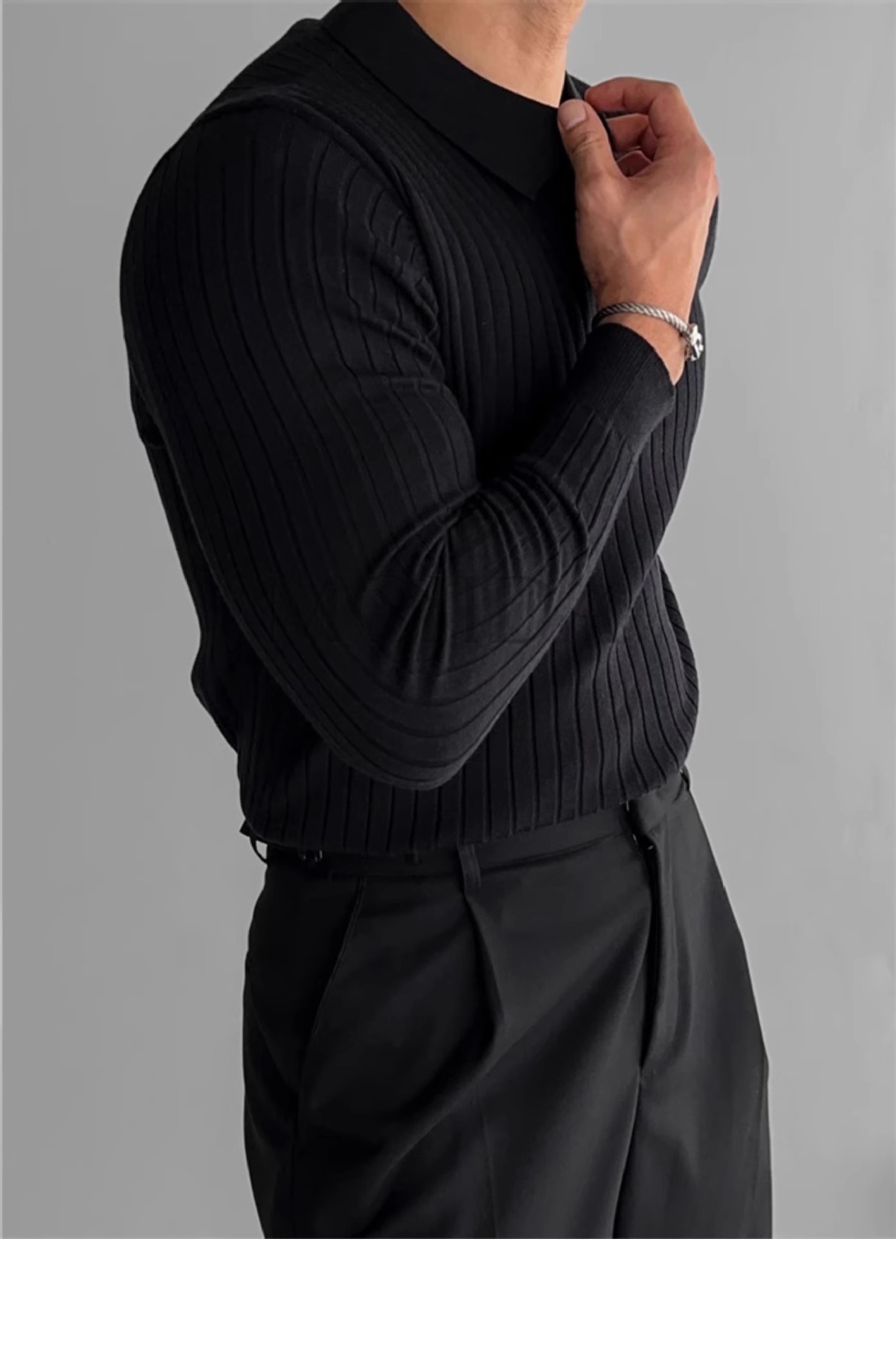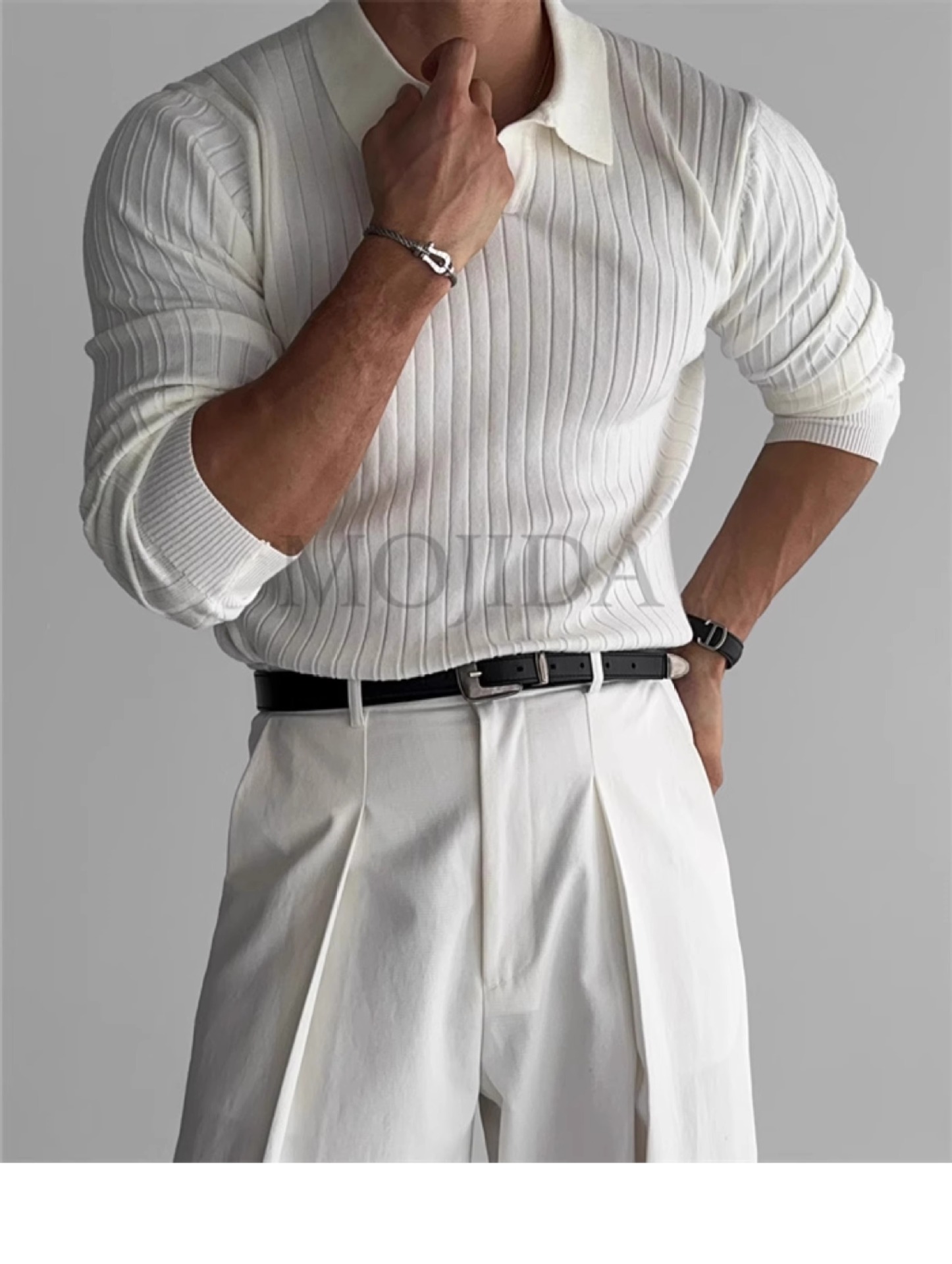 봄과 가을 새로운 한국 스타일 하이 엔드 남성 솔리드 컬러 스레드 탄성 옷깃 풀오버 슬림 니트 티셔츠 남성용