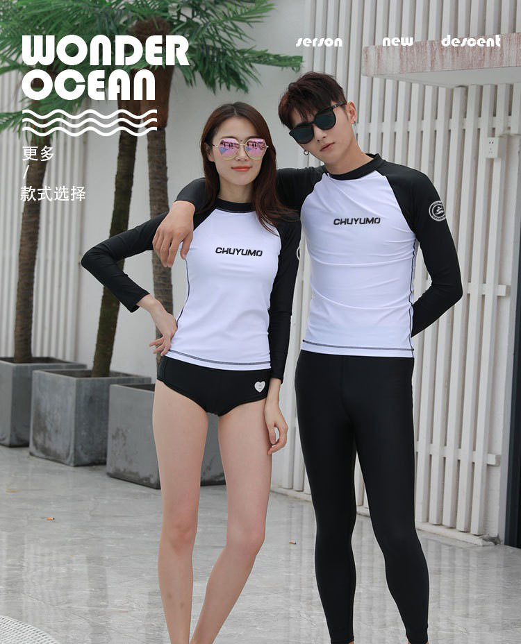 남성과 여성의 커플 수영복 야외 다이빙 세트 흑백 크루 넥 긴 소매 분할 태양 방지 빠른 건조 스포츠 패션 수영복스토어 가기