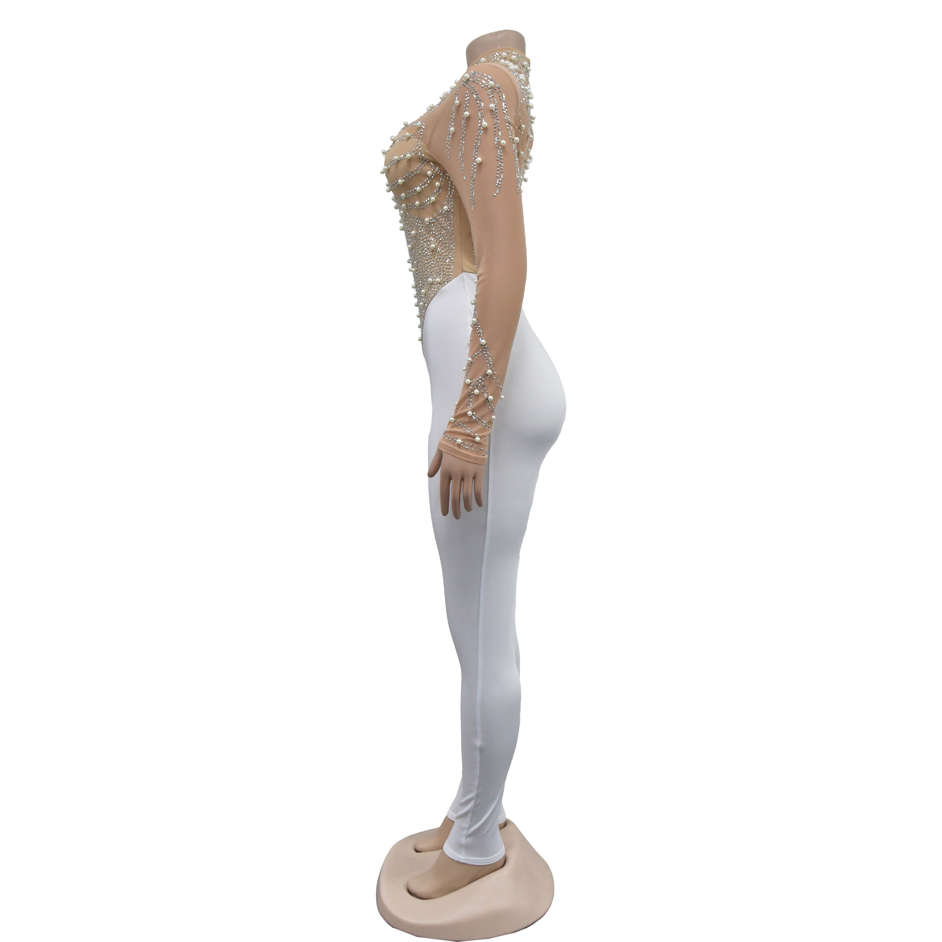C6912 국경 간 AliExpress 아마존 유럽과 미국 패션 여성의 단색 메쉬 라인석 긴팔 바지 점프 수트