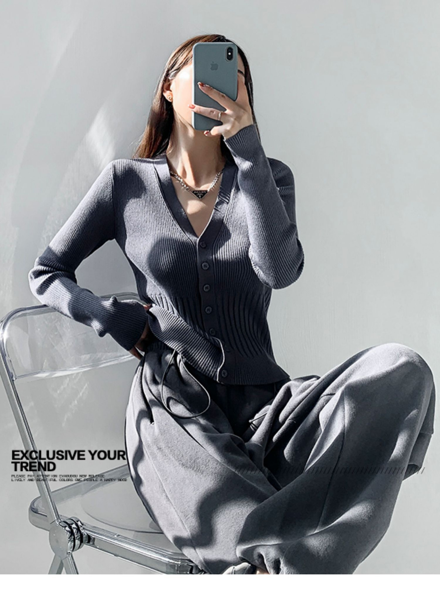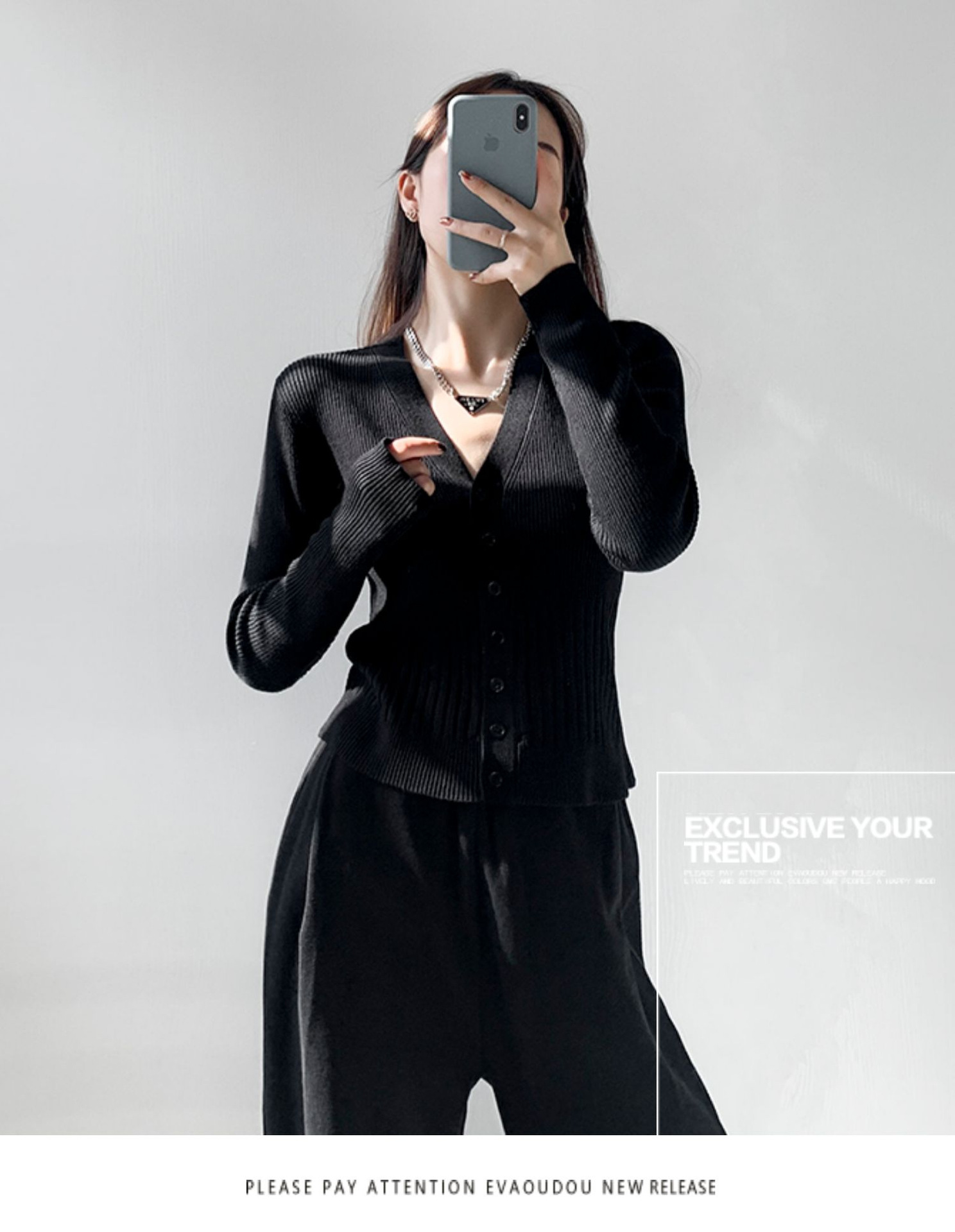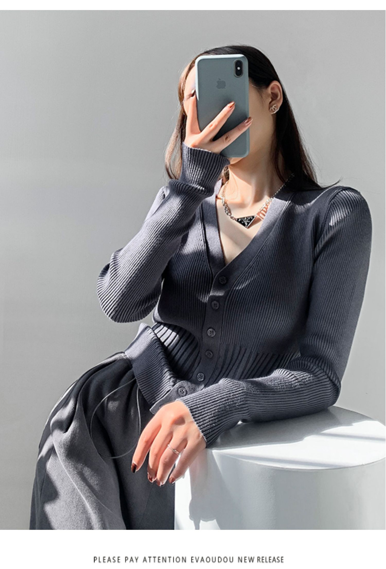 한국식 인터넷 유명 인사 V 넥 니트 카디건 탄성 싱글 브레스트 스웨터 섹시한 소녀 하이 웨이스트 짧은 배꼽 탑