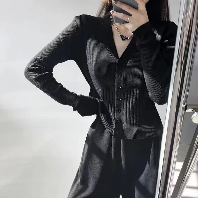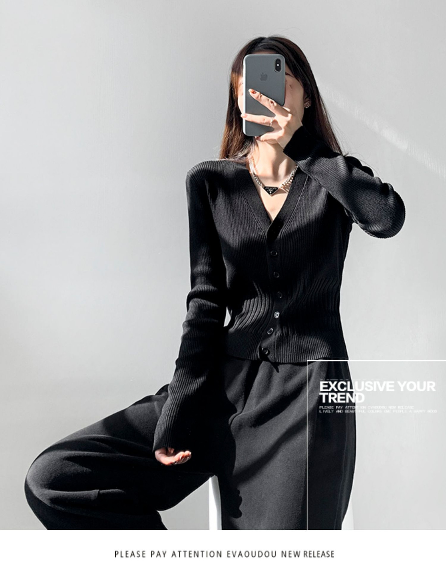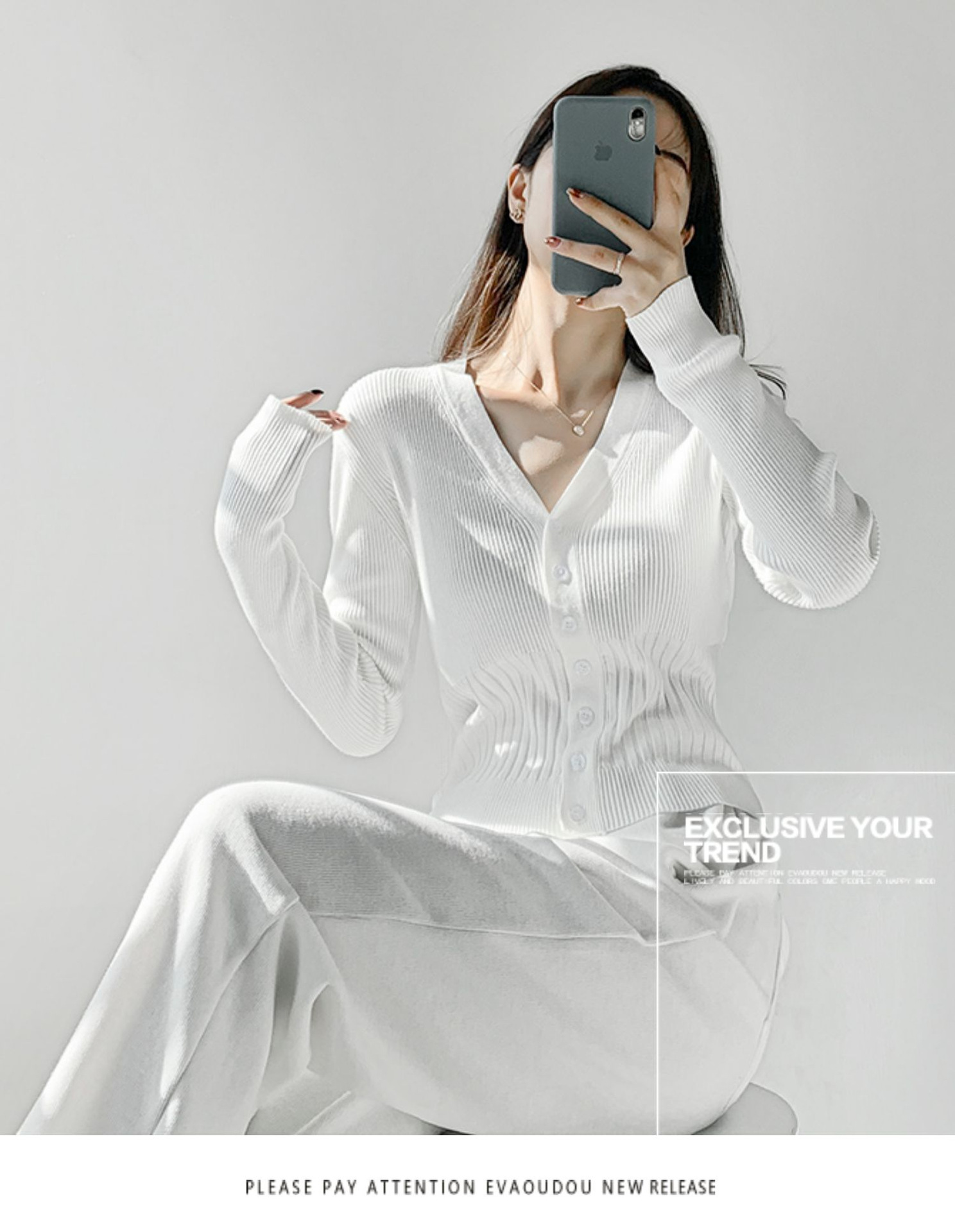 한국식 인터넷 유명 인사 V 넥 니트 카디건 탄성 싱글 브레스트 스웨터 섹시한 소녀 하이 웨이스트 짧은 배꼽 탑