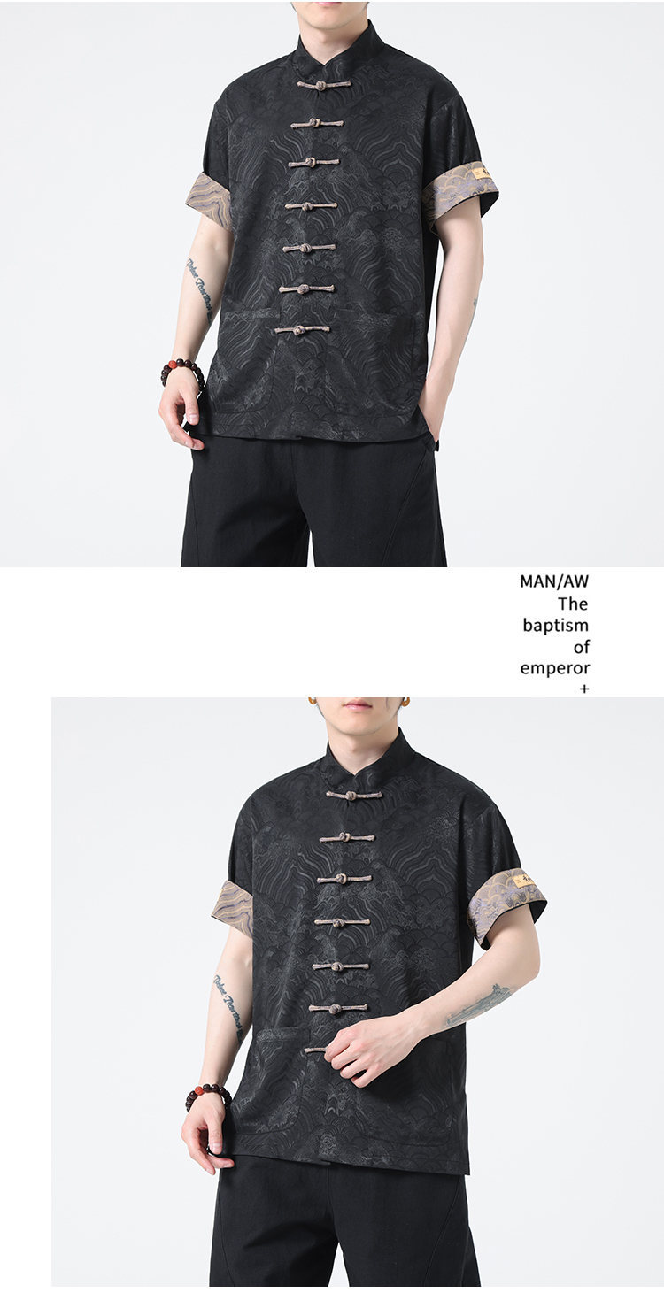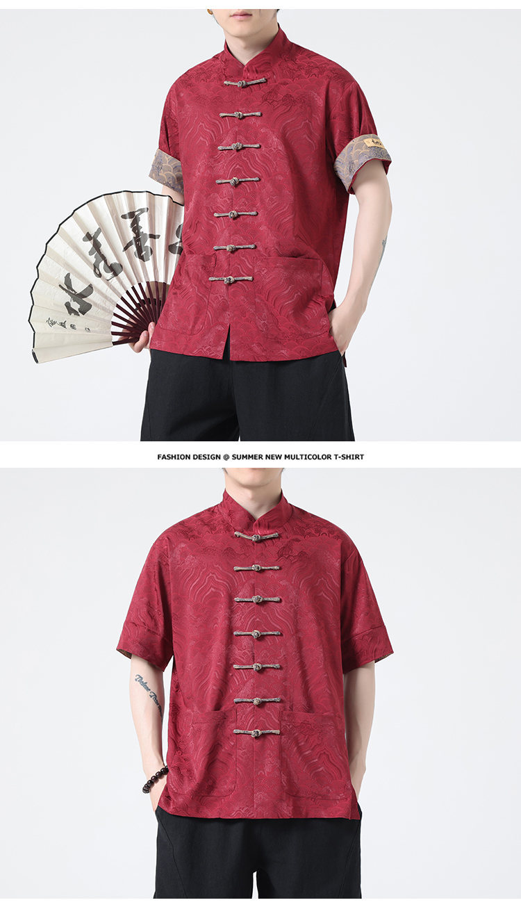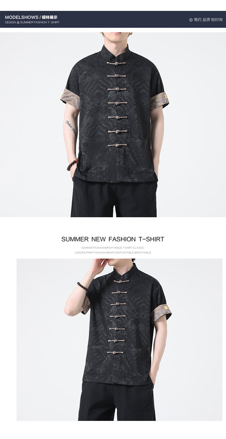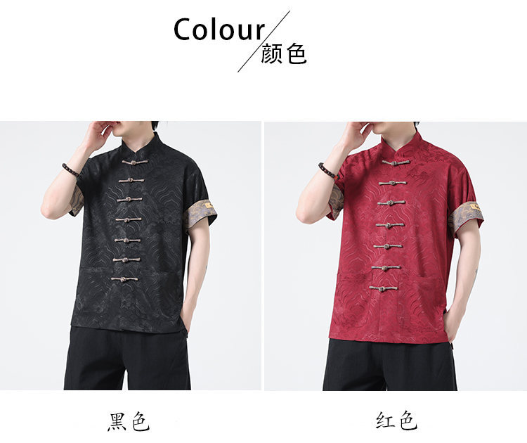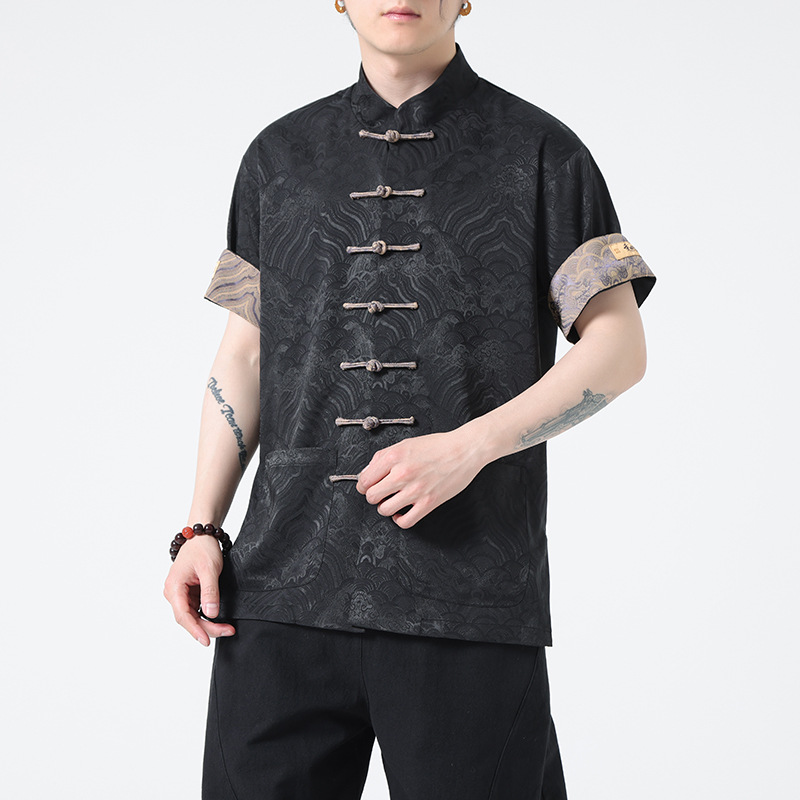 2024 여름 새로운 중국 남성 의류 바다 강 실크 새틴 자카드 스탠드 칼라 버클 짧은 소매 컬러 매칭 탕 세트 셔츠