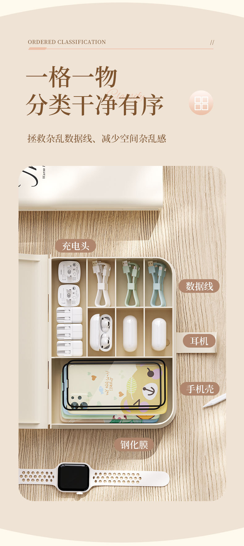 휴대폰 케이스, 데이터 케이블, 강화유리 필름, 보조배터리, 이어폰, 정리함, 전선 정리, 칸막이가 있는 데스크탑 수납함, 서랍
