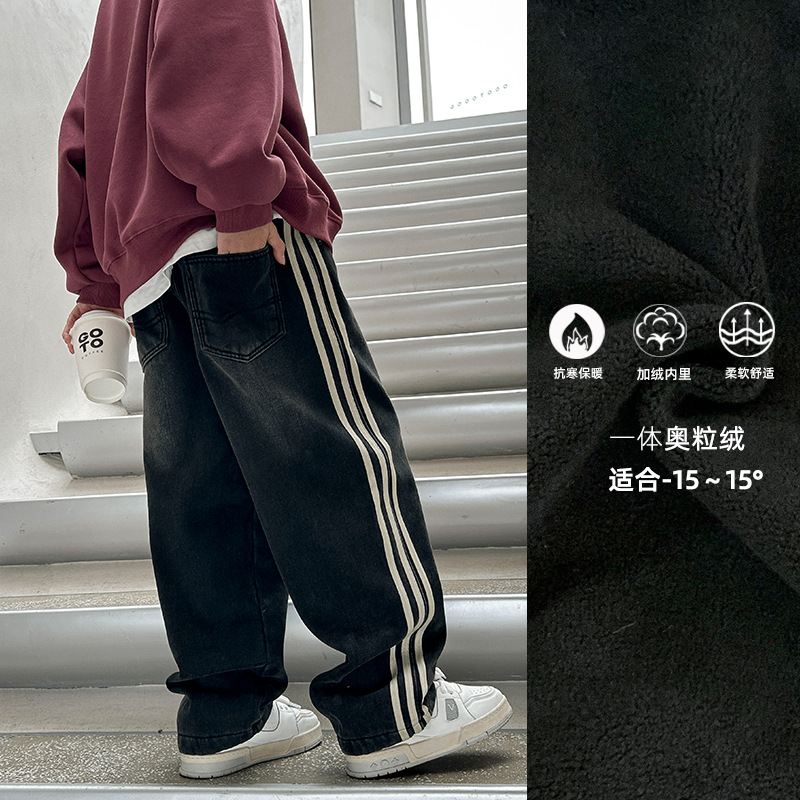 팬더 원원 가을 겨울 사이드 스트라이프 웨빙 남아용 청바지 중대형 아동용 스트레이트 팬츠 아동용 플리스 바지스토어 가기