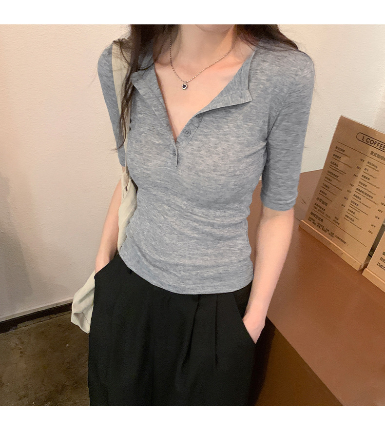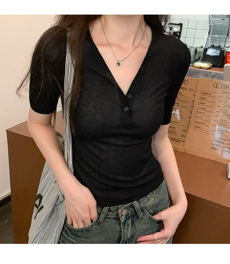 여성 한국식 하프 오픈 칼라 브레스트 반팔 티셔츠 2024 여름 새로운 순수한 욕망 슬림 핏 기질 하프 슬리브 탑