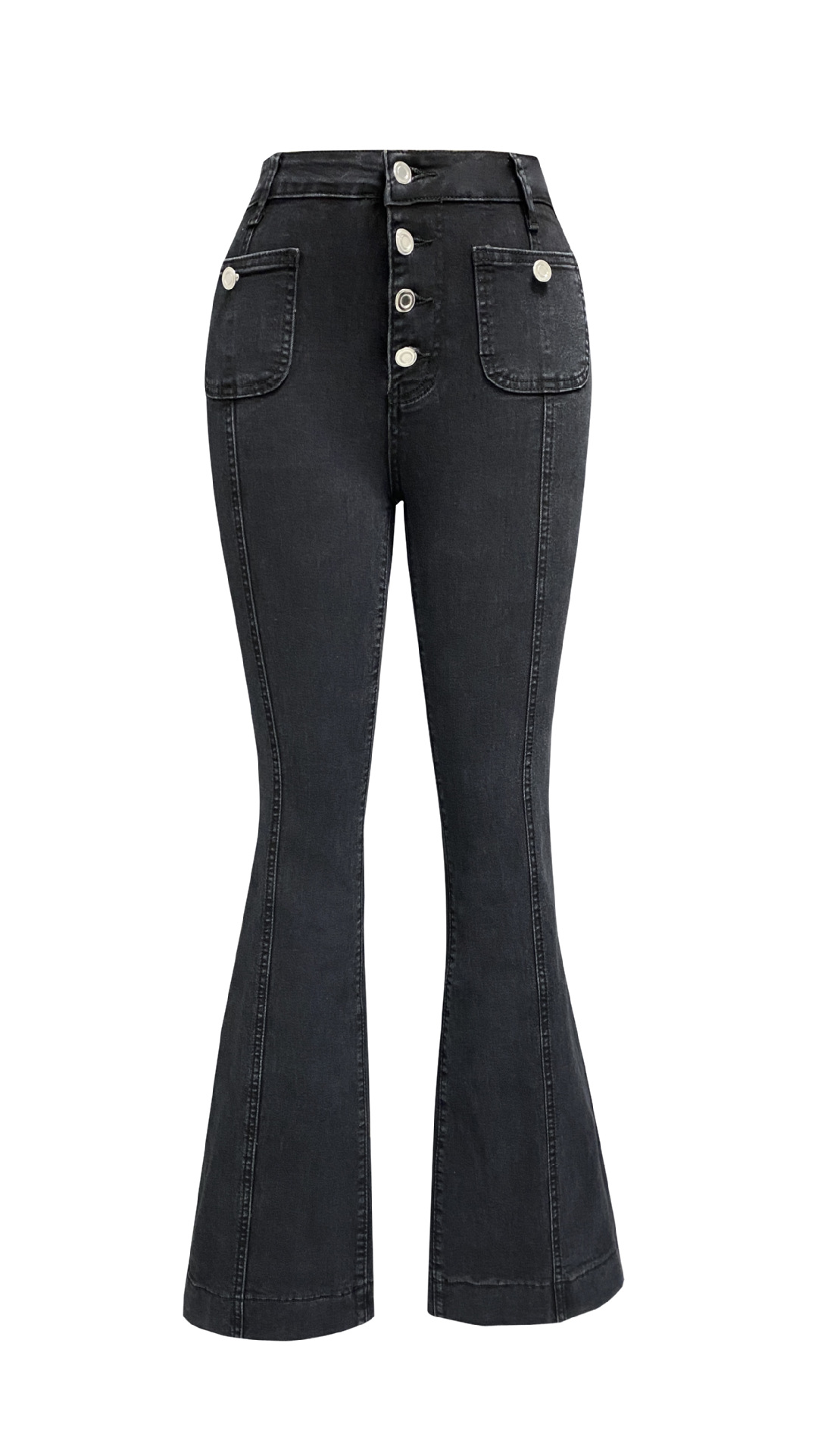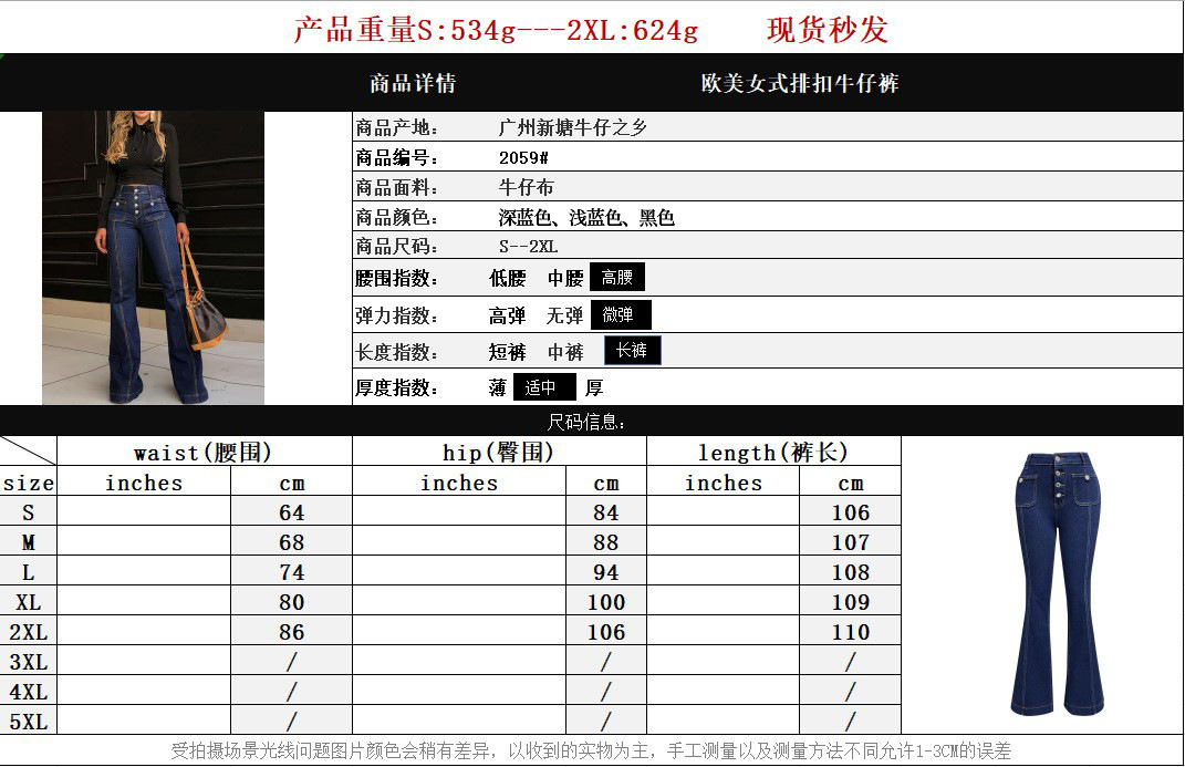 2025년 봄 유럽과 미국의 새로운 스타일의 여성을 위한 버튼다운 하이웨이스트 청바지, 슬림하고 우아한 플레어 팬츠, 재고 있음스토어 가기