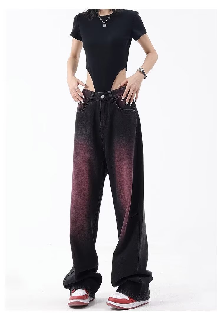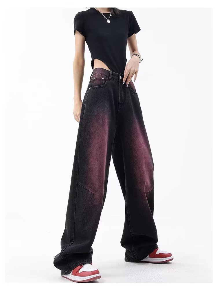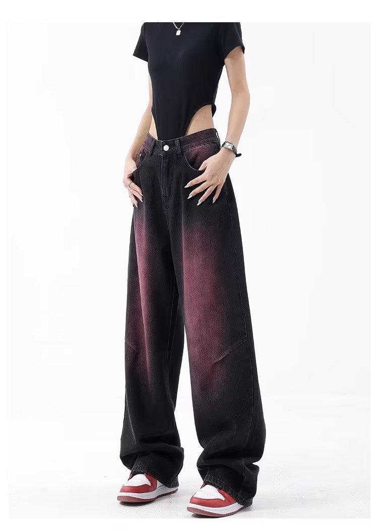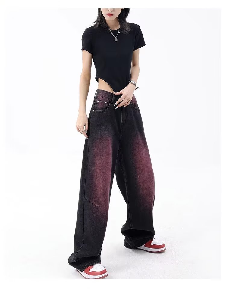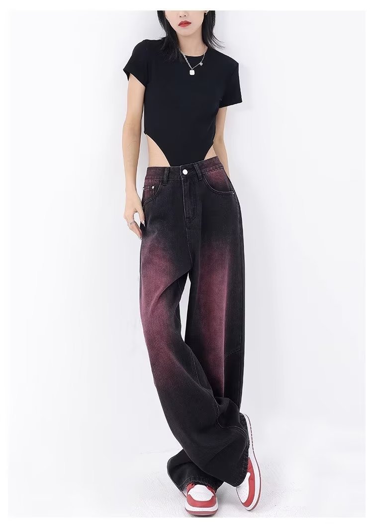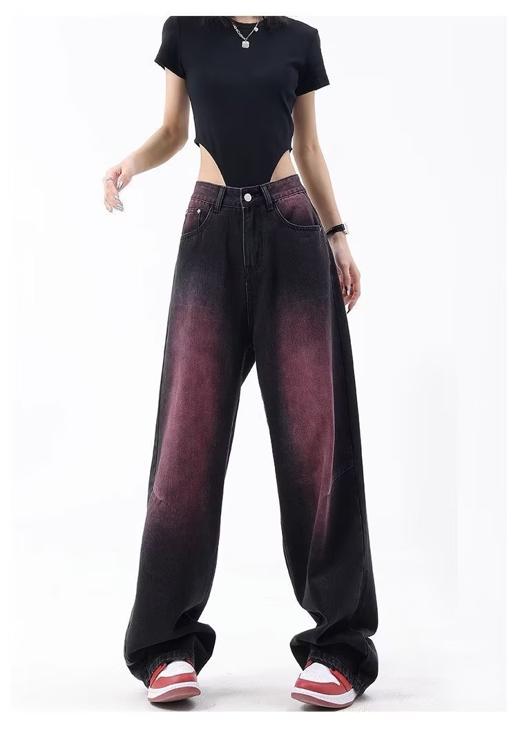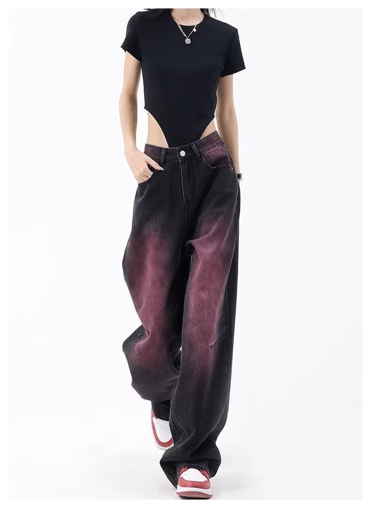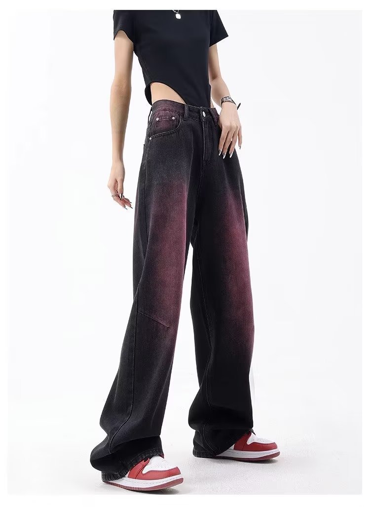 미국 복고풍 봄과 여름 새로운 낙서 씻은 청바지 여성 복고풍 디자인 스트레이트 와이드 다리 바지