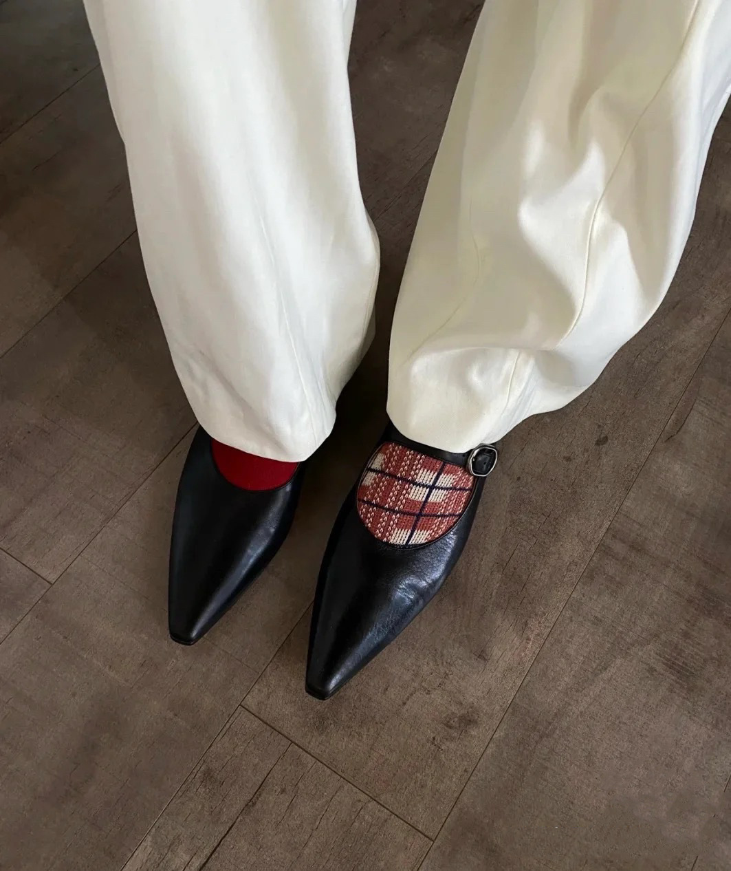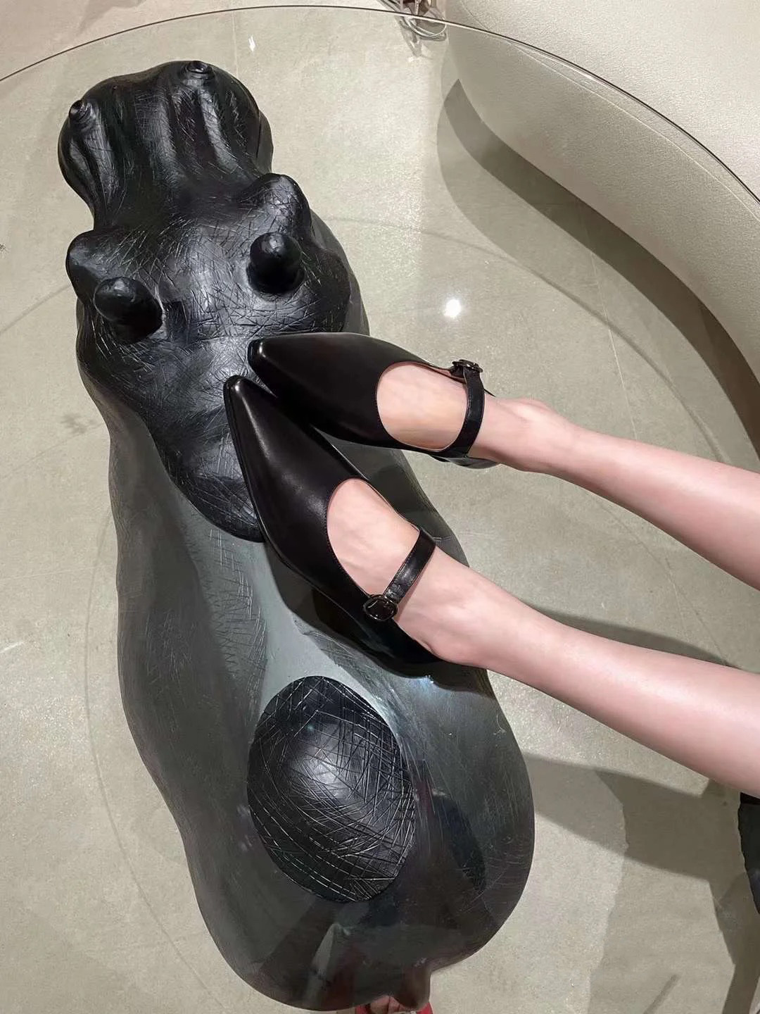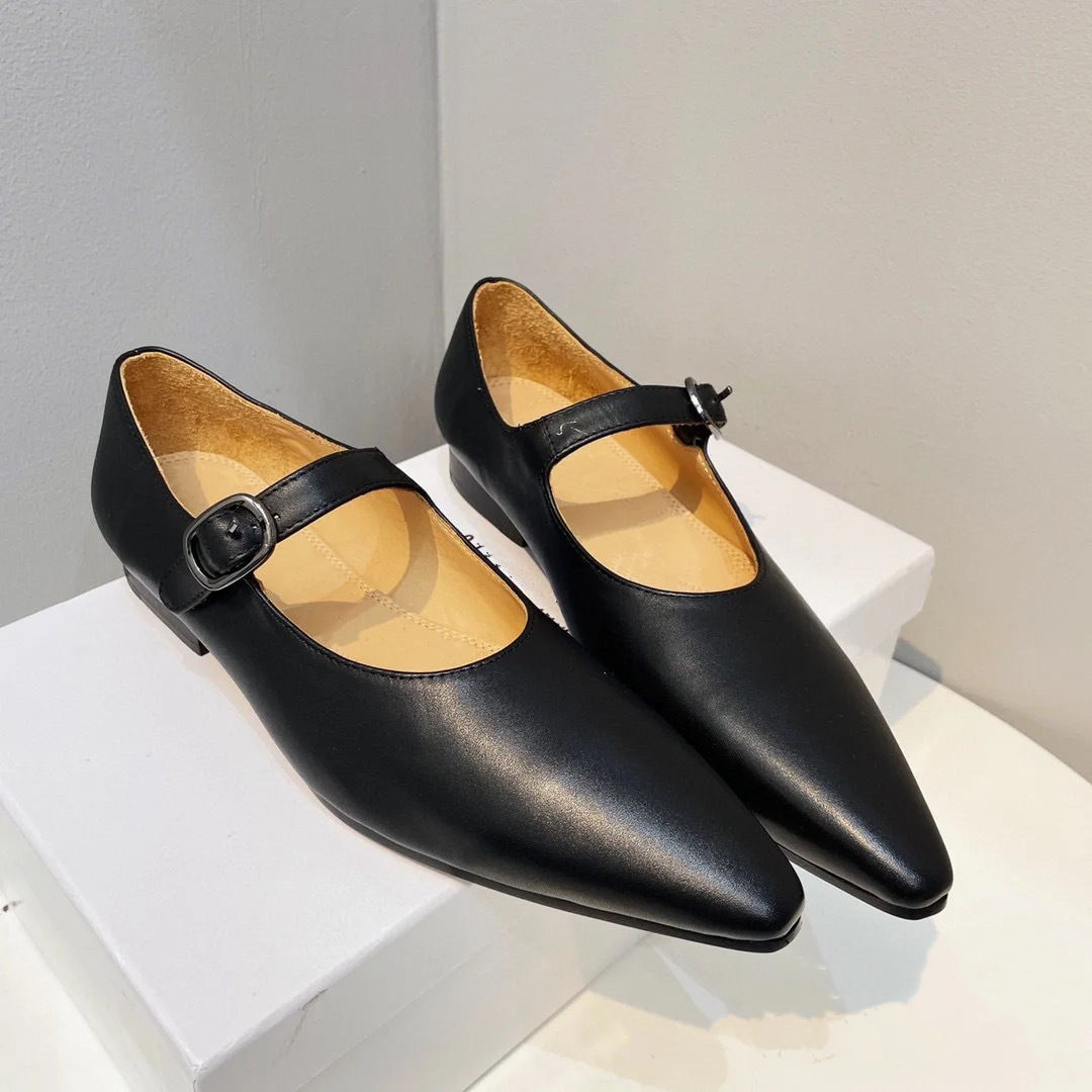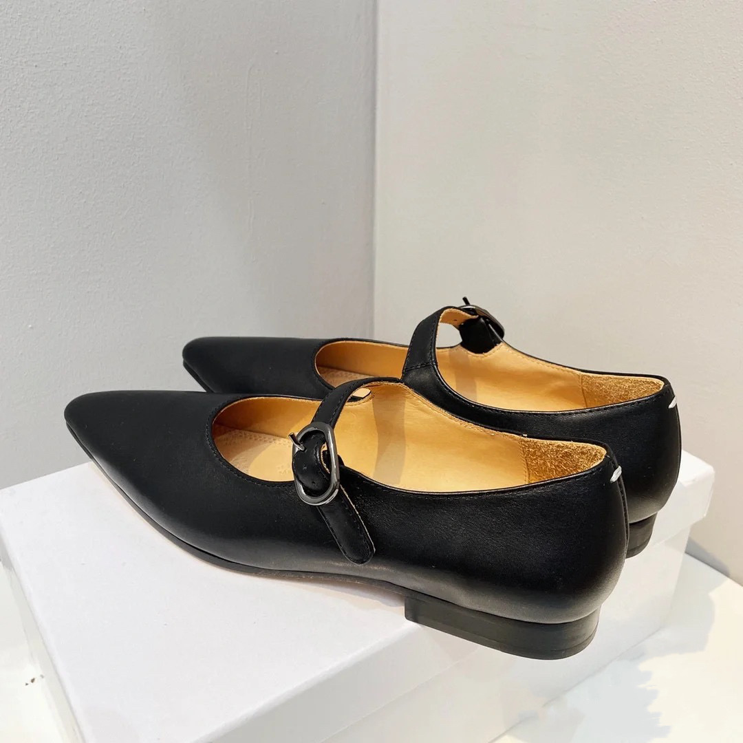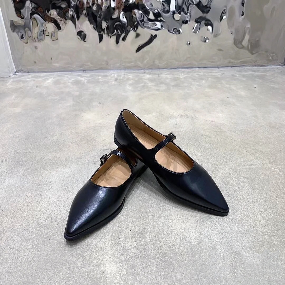 유럽 역 2024 이른 봄 새로운 일본 뾰족한 타이어 소 패턴 메리 제인 짧은 뒤꿈치 샤넬 스타일 가죽 플랫 슈즈