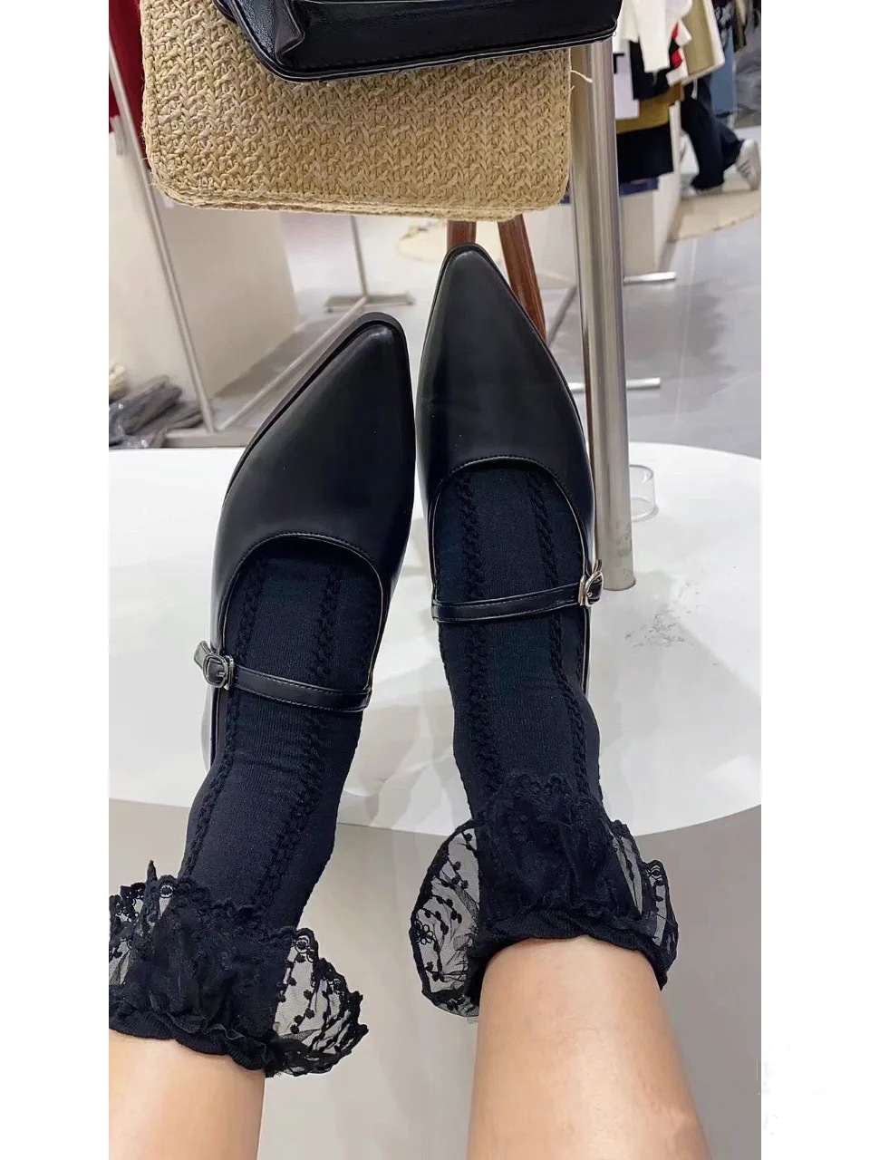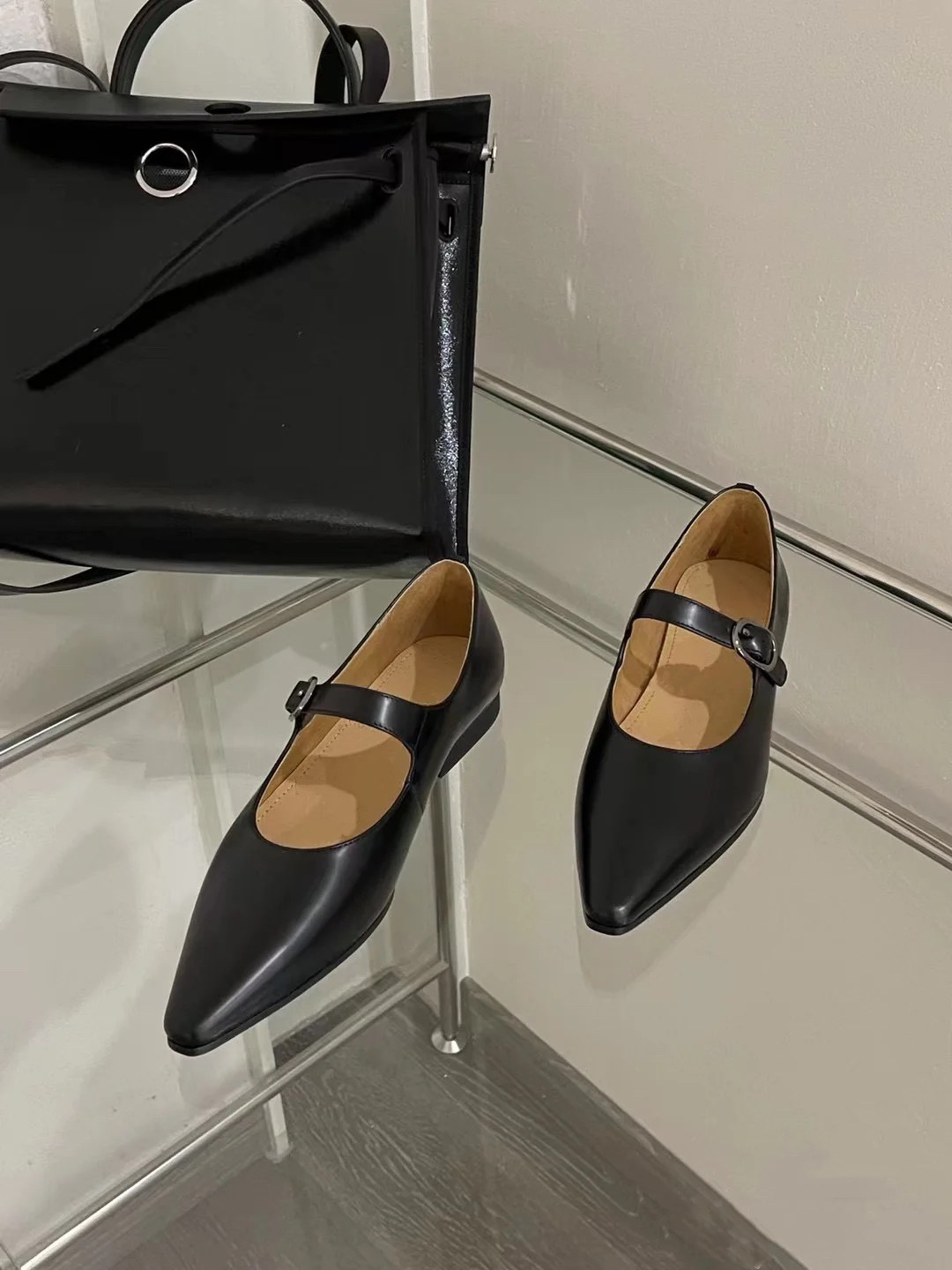 유럽 역 2024 이른 봄 새로운 일본 뾰족한 타이어 소 패턴 메리 제인 짧은 뒤꿈치 샤넬 스타일 가죽 플랫 슈즈스토어 가기