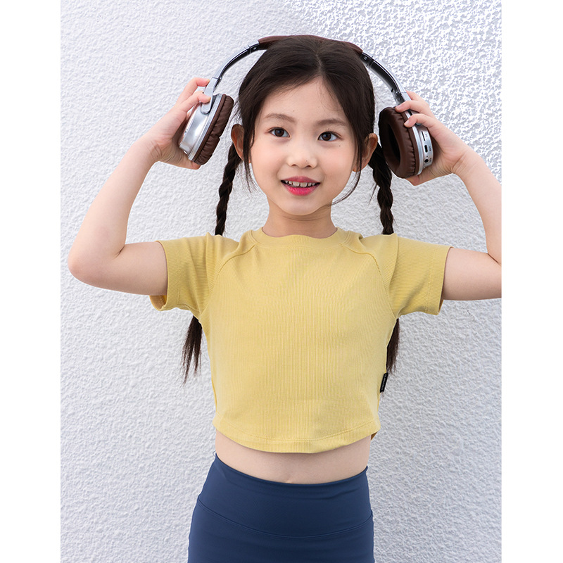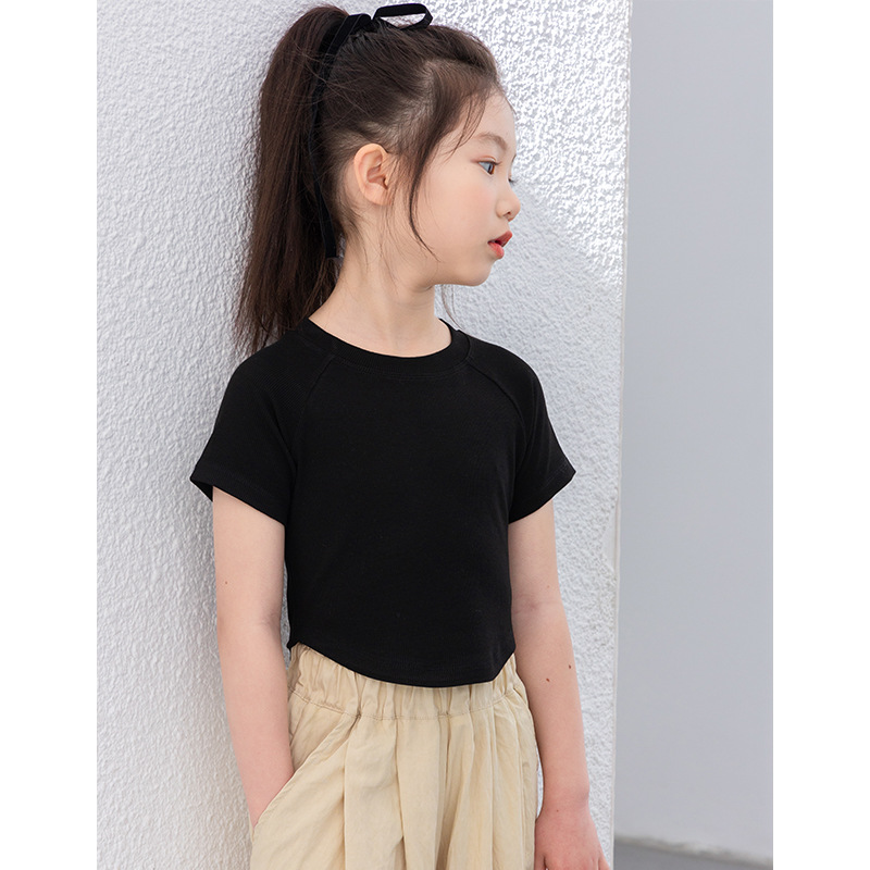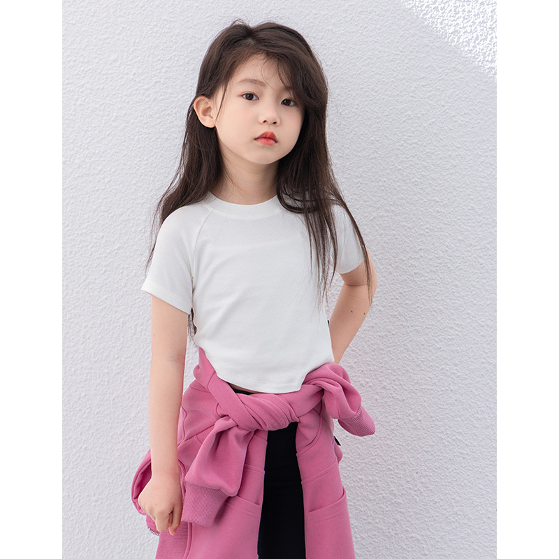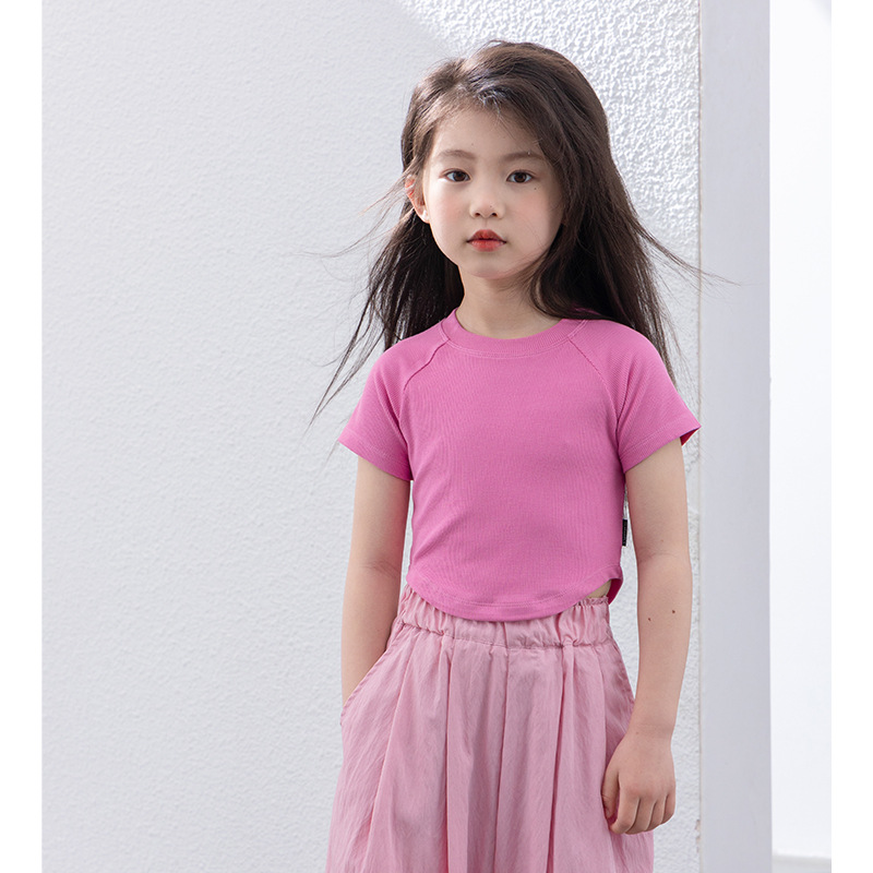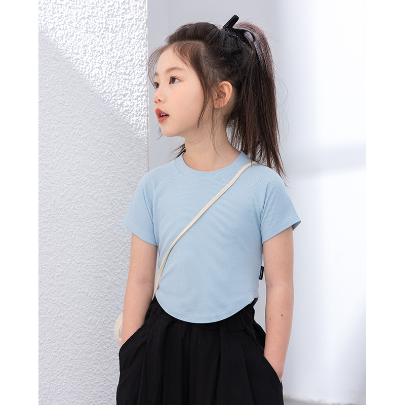 여자 짧은 니트 바닥 티셔츠 2025 여름 새로운 스타일 어린이 뜨거운 소녀 슬림 반팔 라운드 넥 이너 탑스토어 가기
