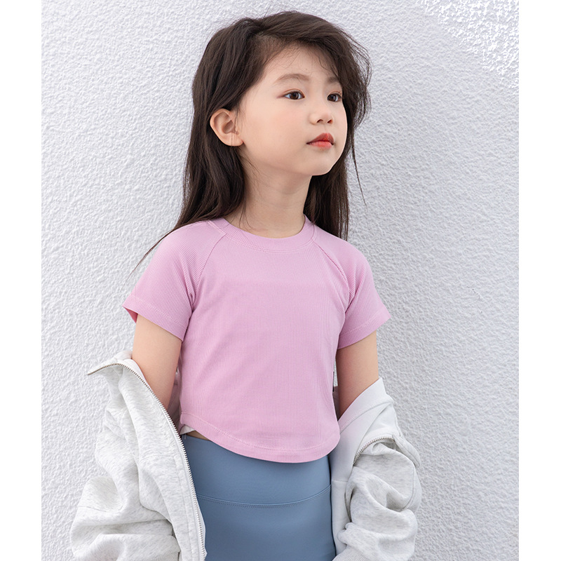 여자 짧은 니트 바닥 티셔츠 2025 여름 새로운 스타일 어린이 뜨거운 소녀 슬림 반팔 라운드 넥 이너 탑