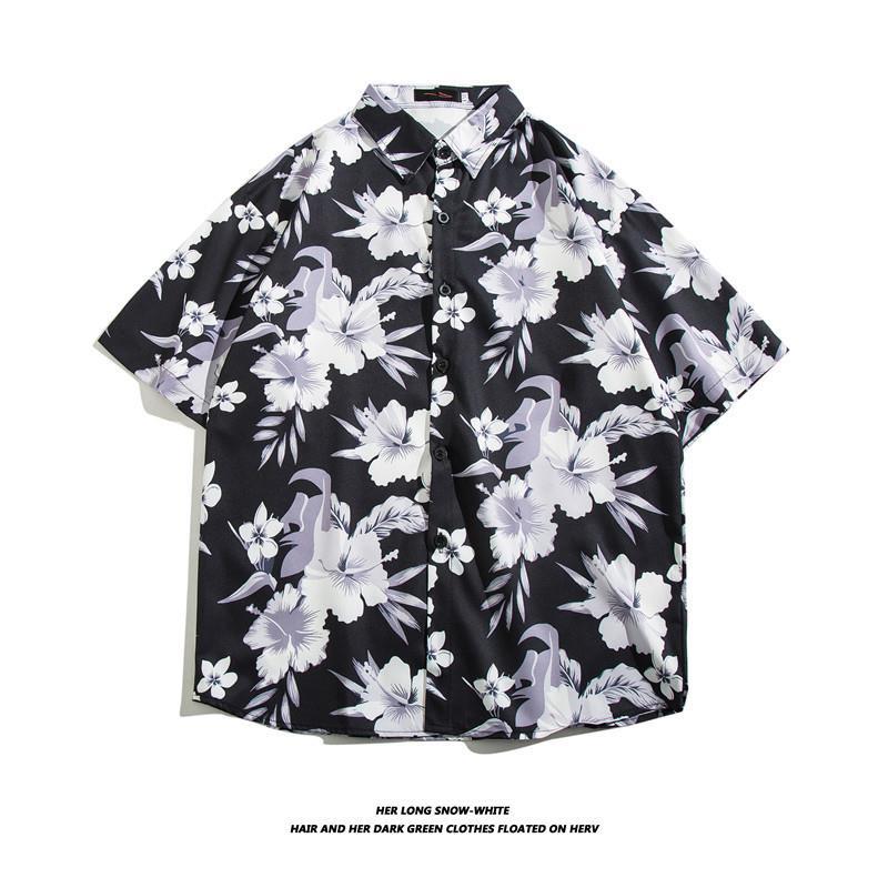 하와이 아이스 실크 셔츠 남성 패션 브랜드 반팔 셔츠 남성 여름 해변 꽃 셔츠 커플의 느슨한 코트