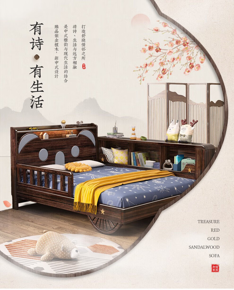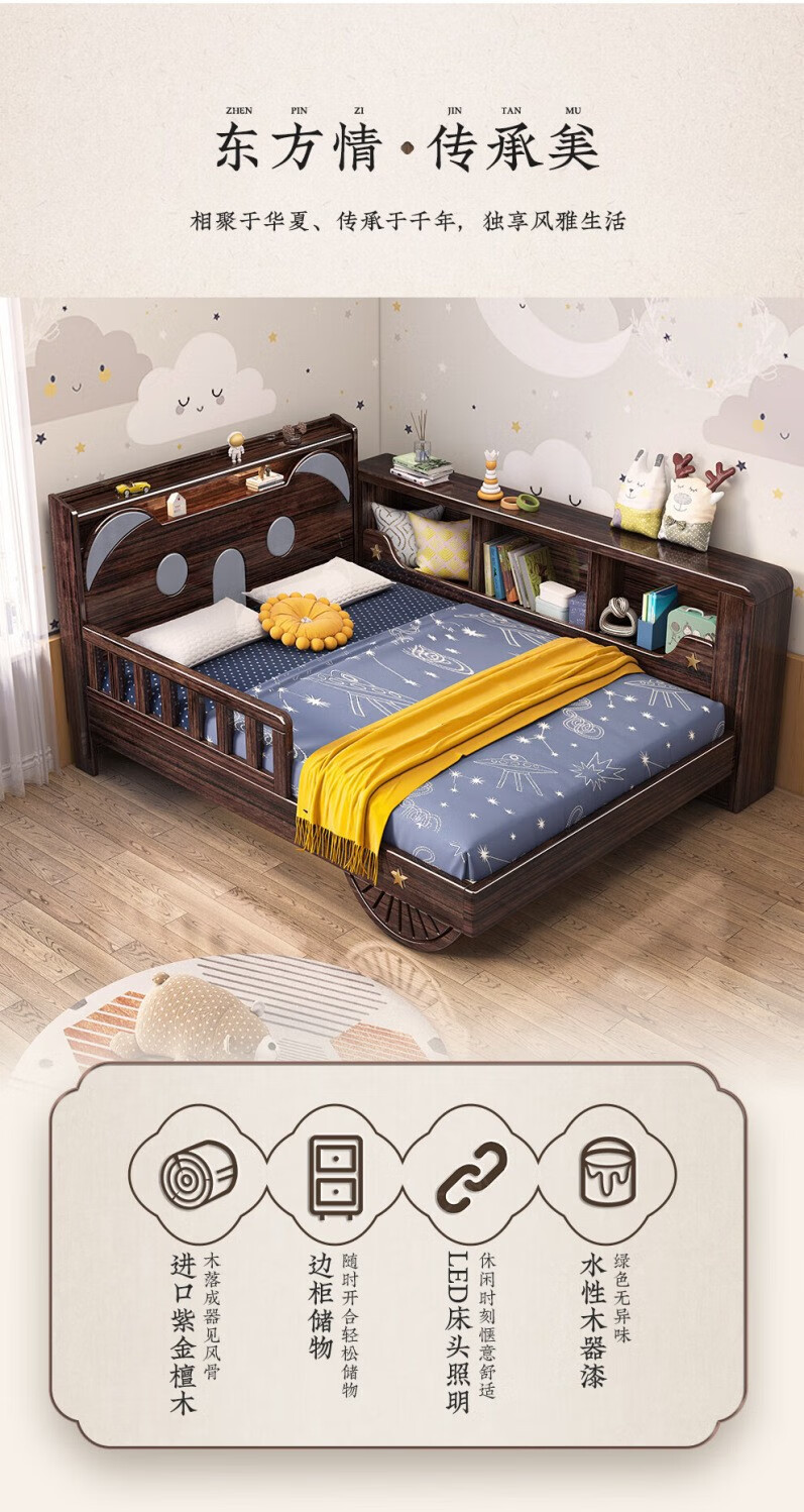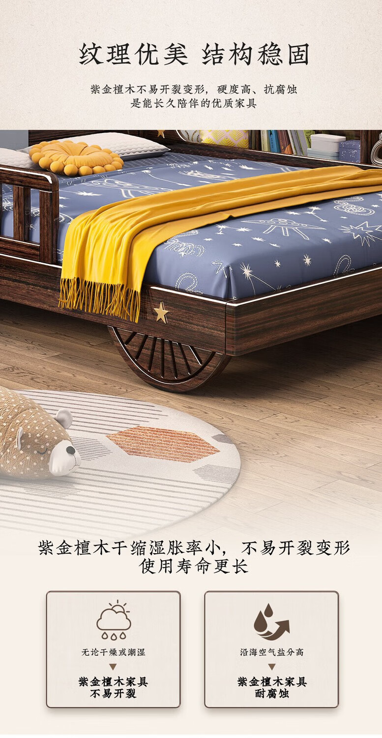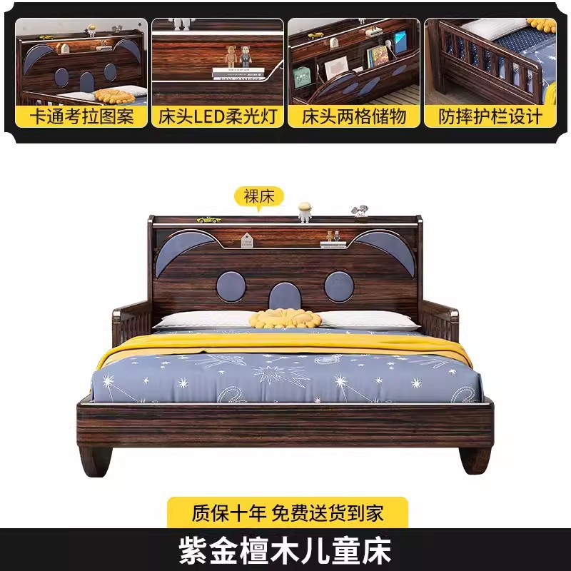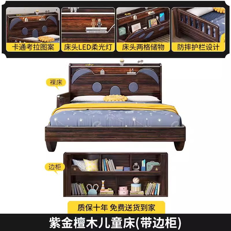 단단한 나무 어린이 침대 보라색 금색 샌달 우드 어린이 방 가벼운 책장 침대로 넓어진 청소년 난간 스티칭