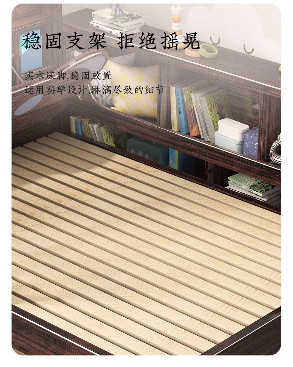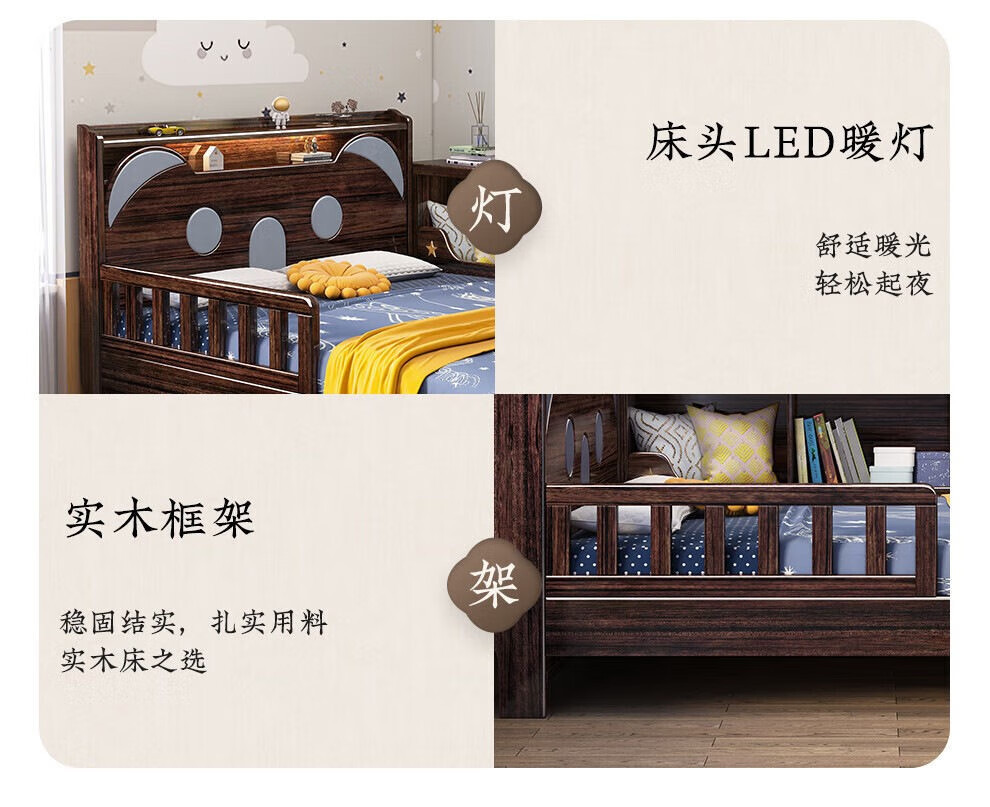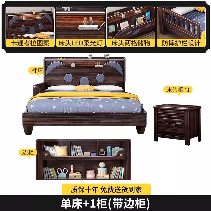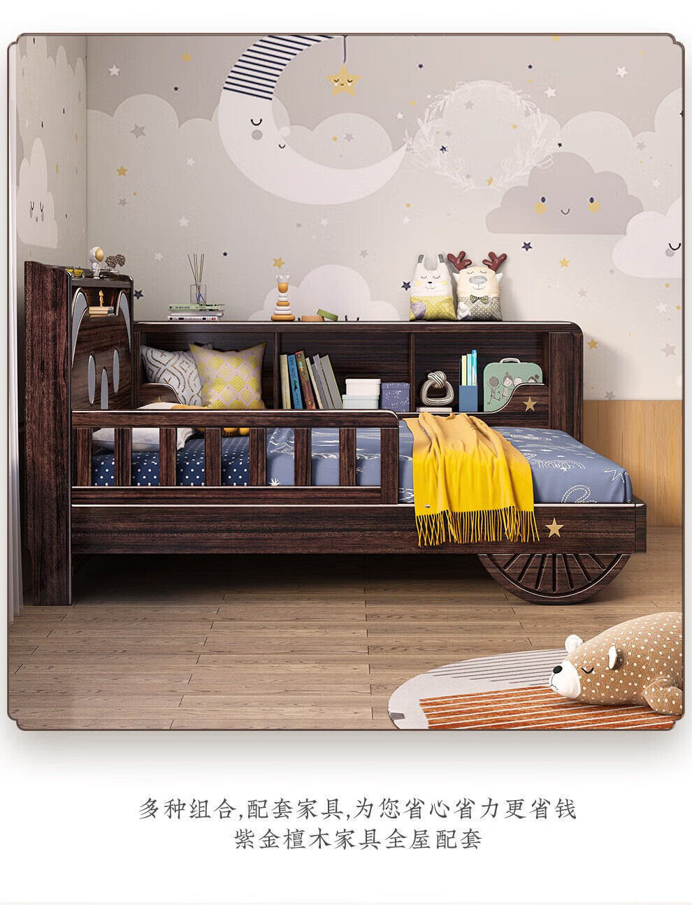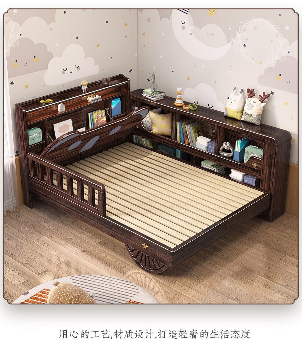 단단한 나무 어린이 침대 보라색 금색 샌달 우드 어린이 방 가벼운 책장 침대로 넓어진 청소년 난간 스티칭