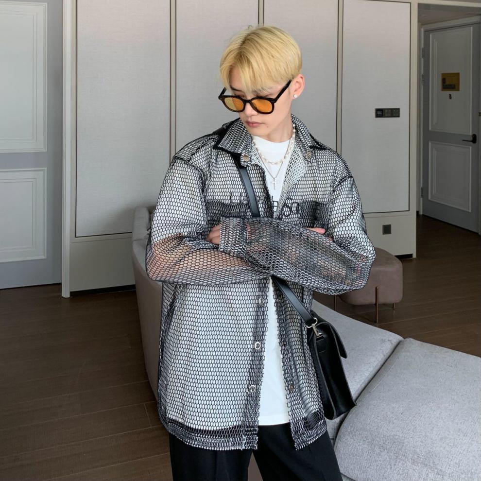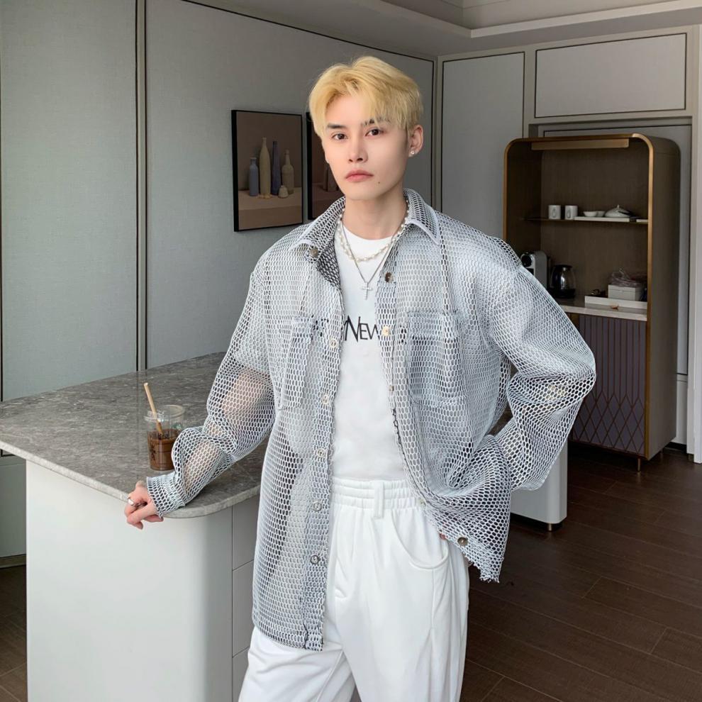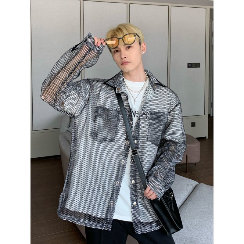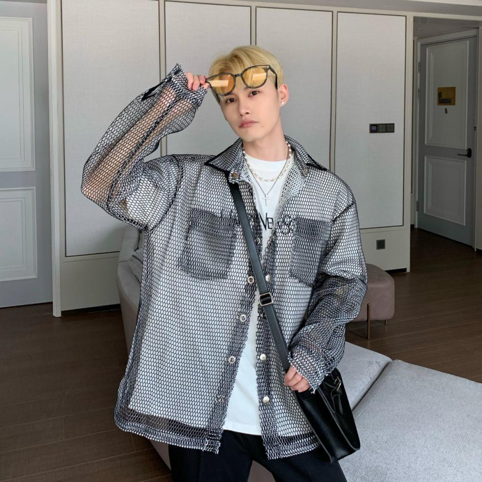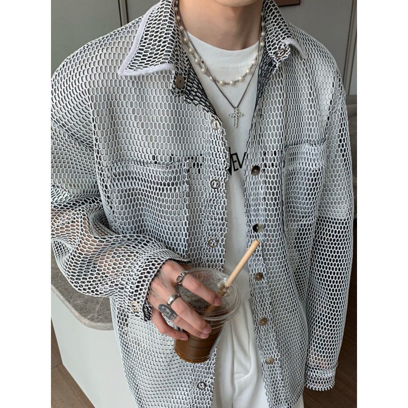 무료 배송 긴팔 남자 유행 올매치 잘 생긴 여름 통기성 할로우 아웃 간단한 재킷 남자 빅 브랜드 하이 엔드 셔츠스토어 가기