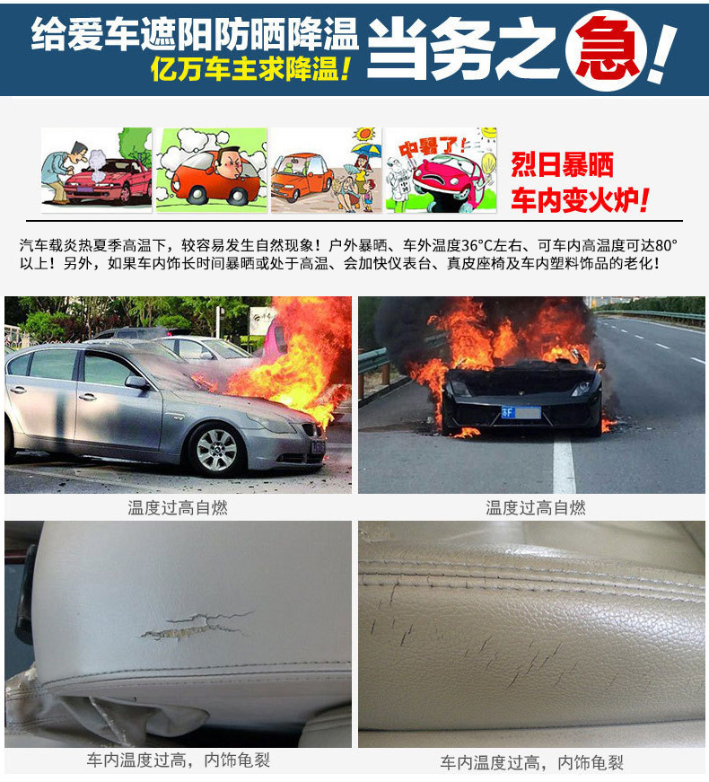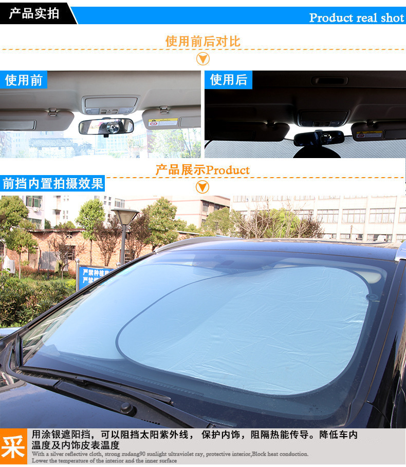 【产品说明】:炎炎夏季爱车免不了要停靠在烈日之下,如果长期暴晒,不采取遮阳降温的措施,爱车很可能会发生车内皮革晒裂,塑料件过早老化,甚至大大减少使用寿命,对您的爱车肯定造成不小的伤害。